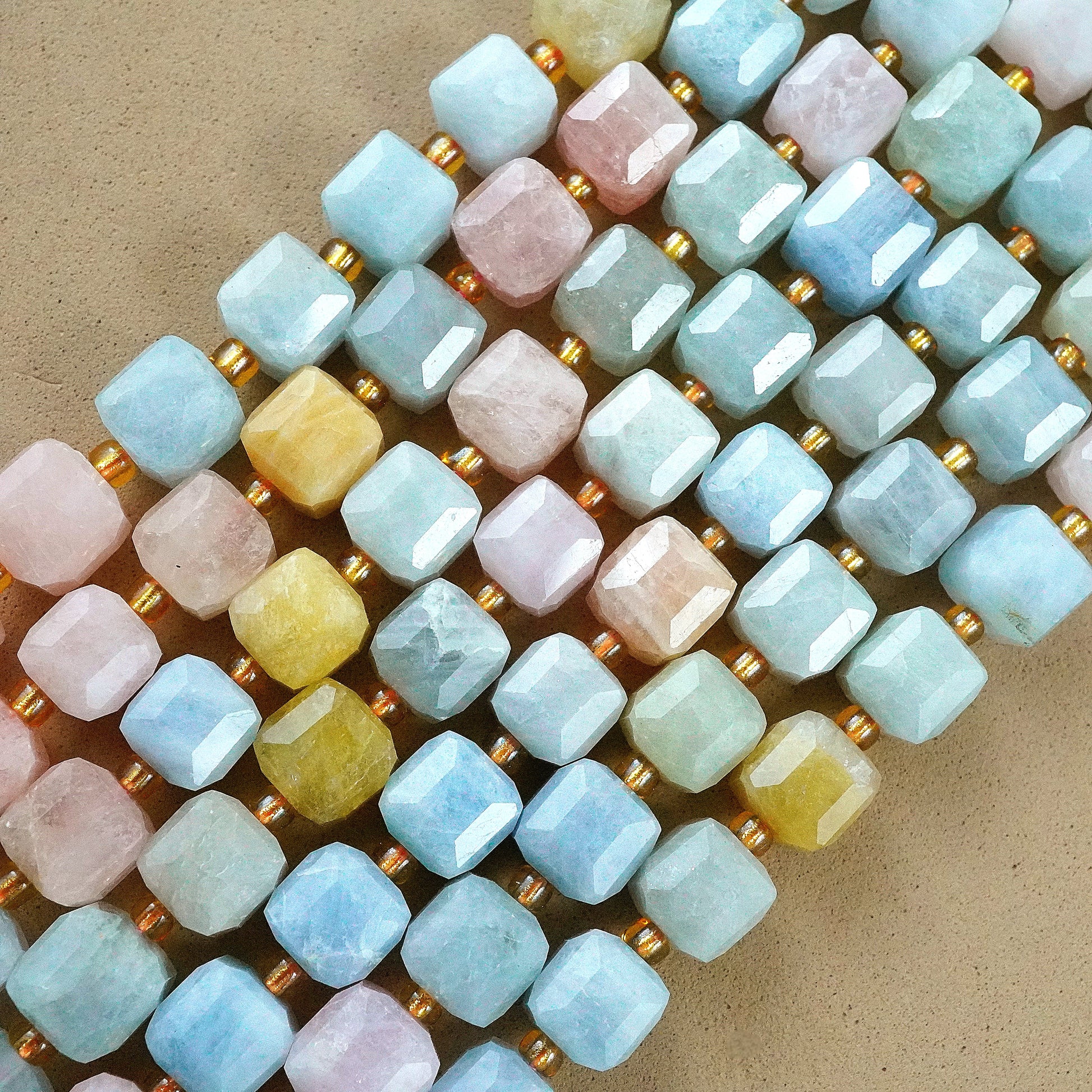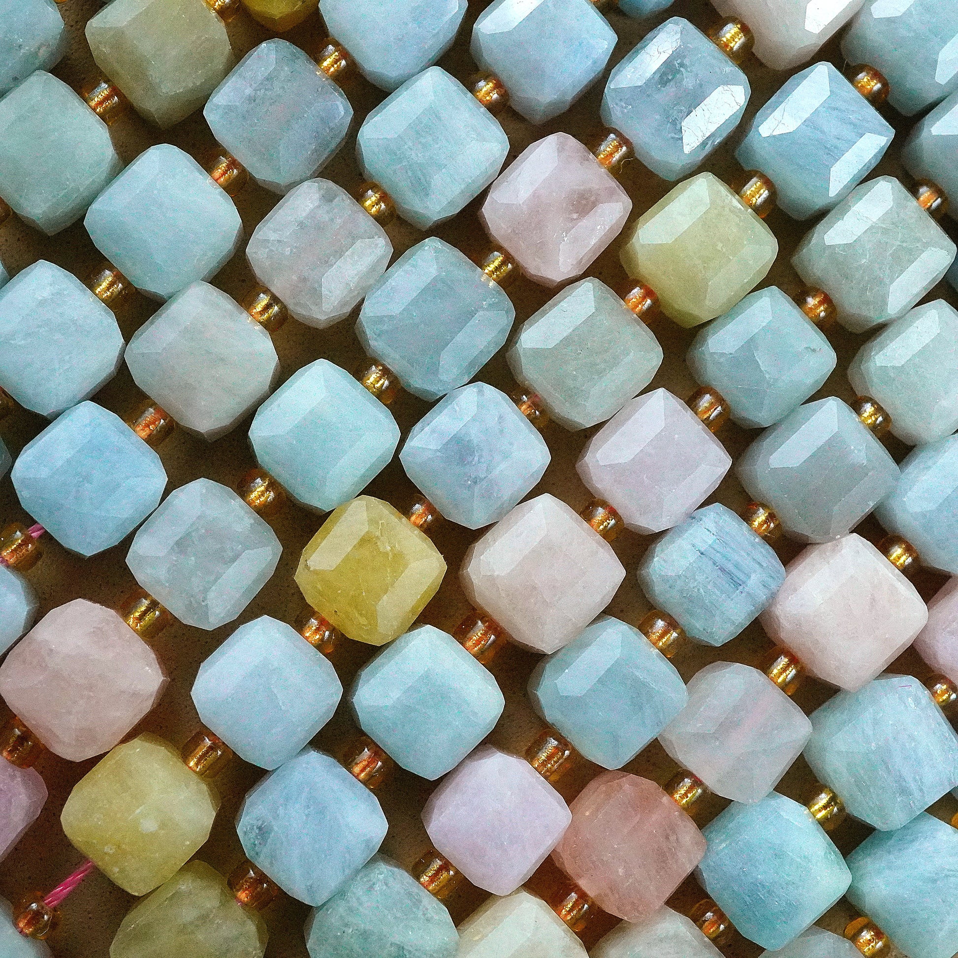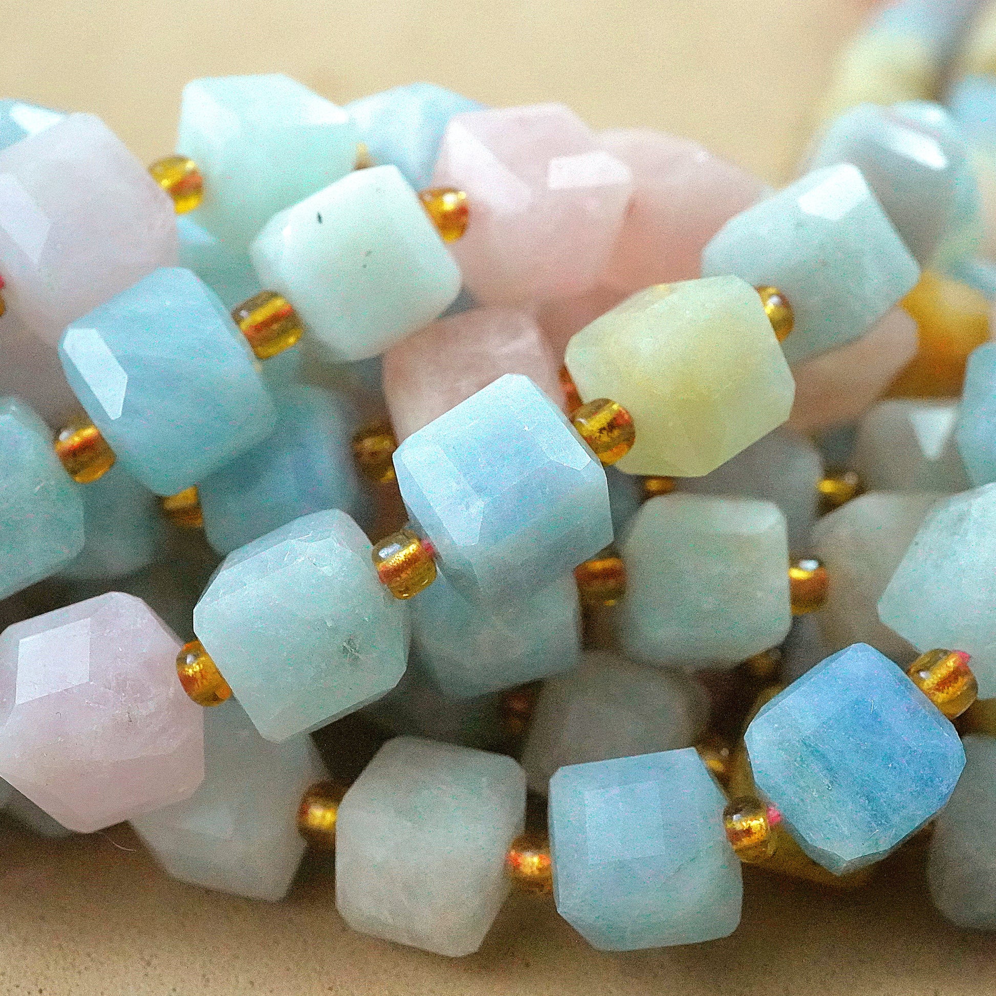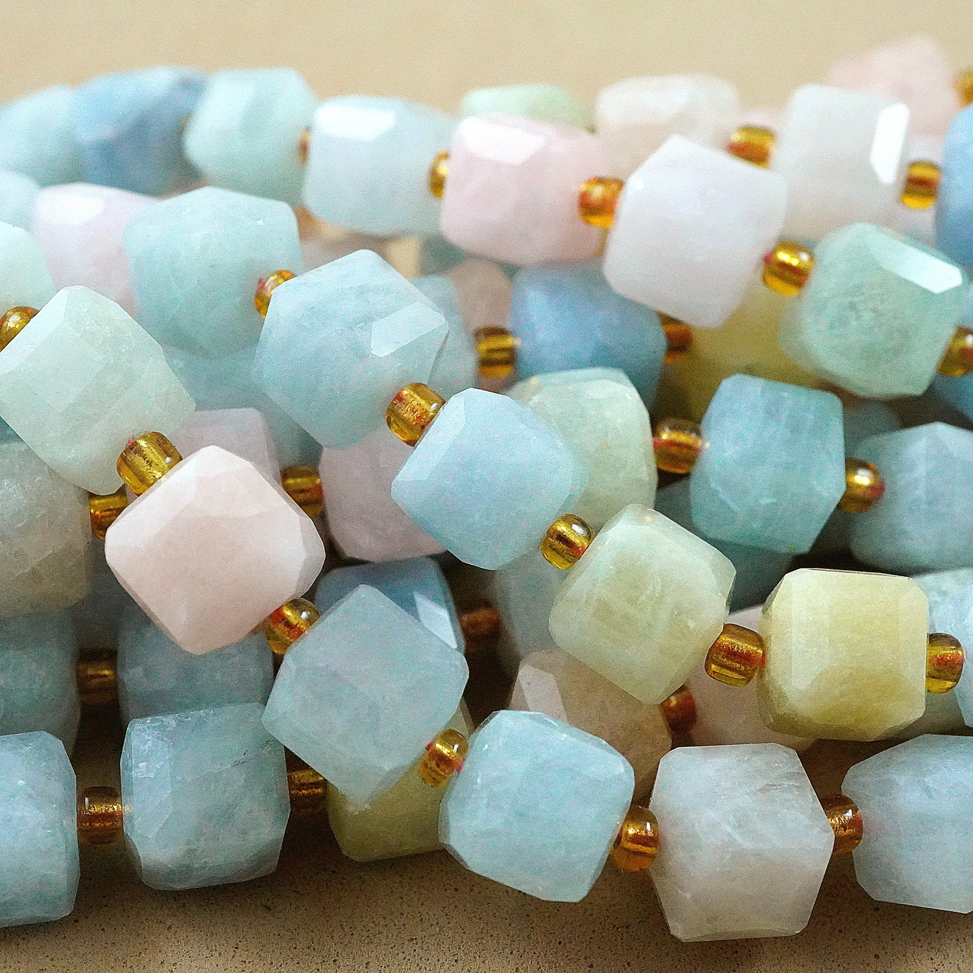 Aquamarine and morganite, with their captivating sea-blue and soft pink hues, transform into stunning faceted cube beads that bring a harmonious and elegant touch to any jewelry design. The enchanting clarity and delicate colors of these gemstones make each bead a unique treasure, perfect for crafting eye-catching necklaces, bracelets, and earrings. Elevate your jewelry collection with these exquisite aquamarine and morganite beads, and let their natural beauty inspire and captivate your creativity.