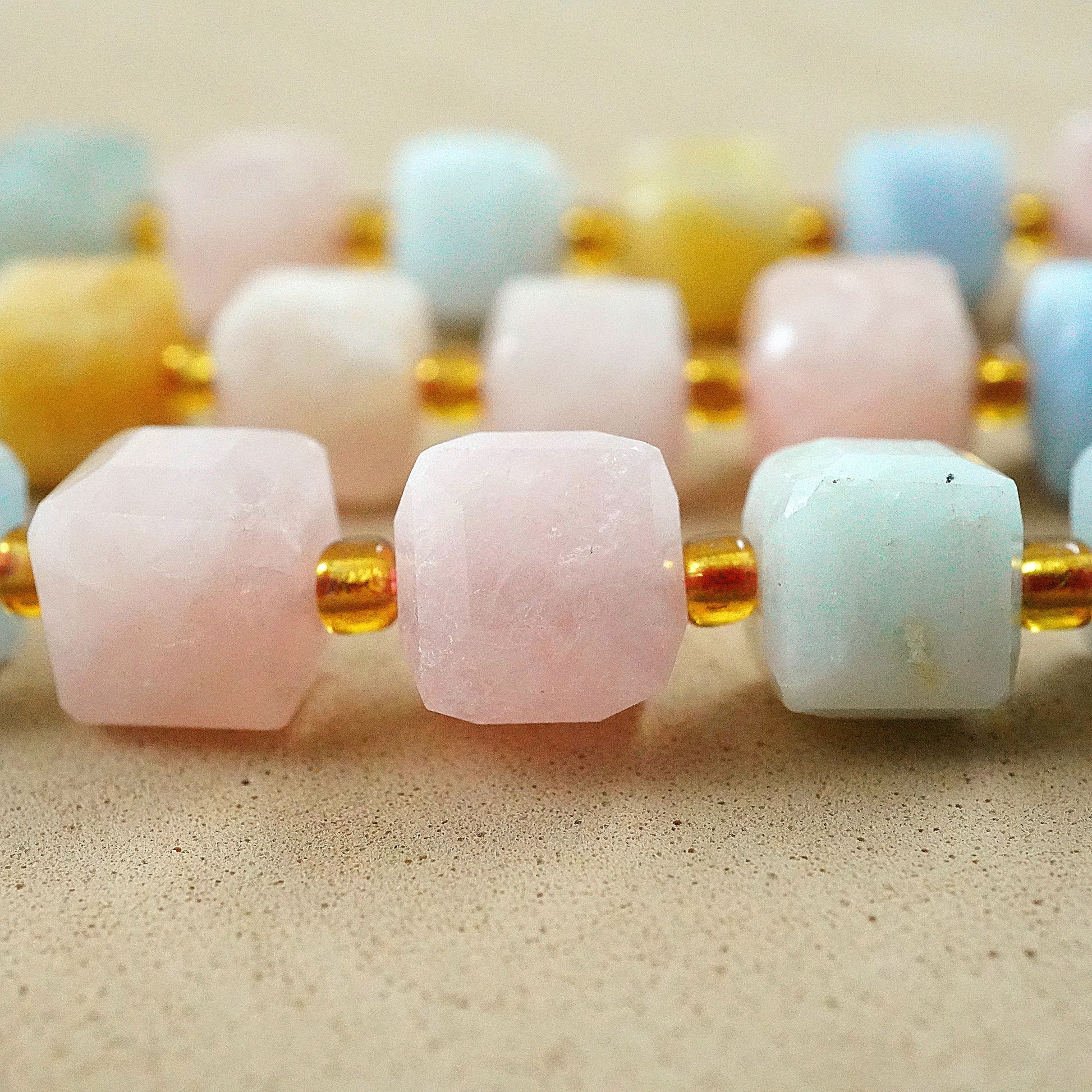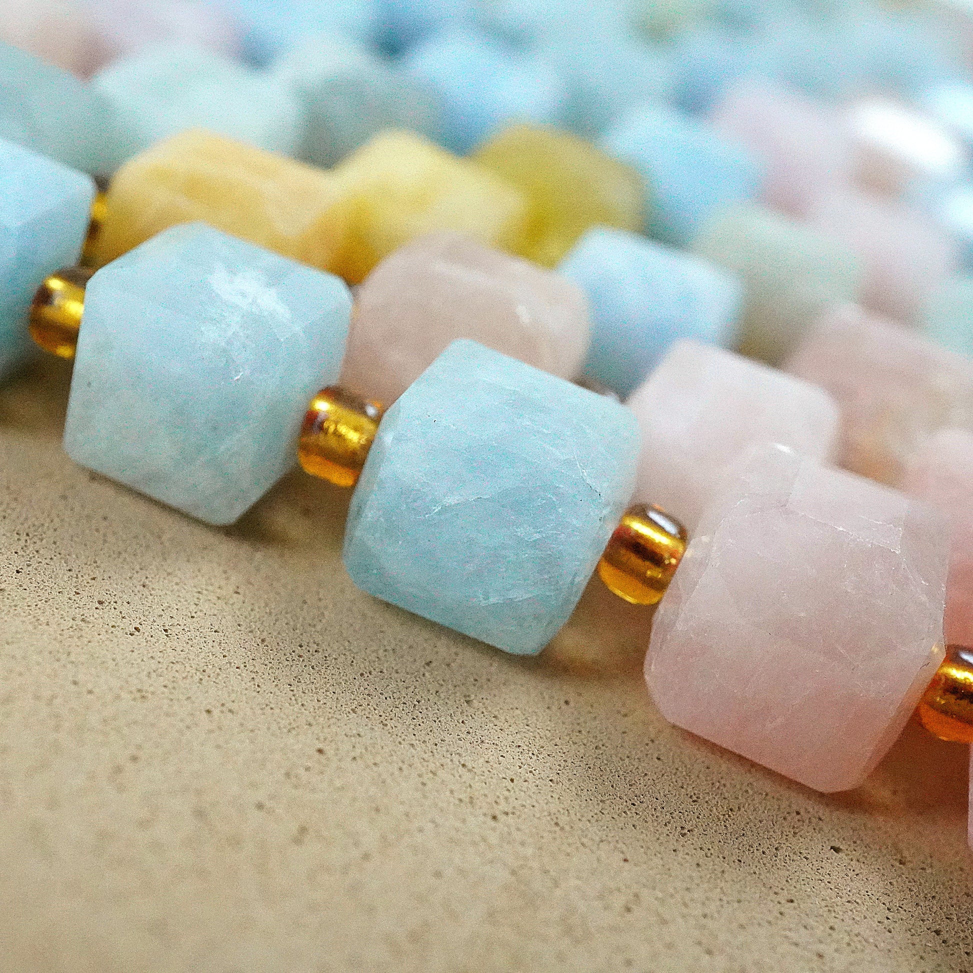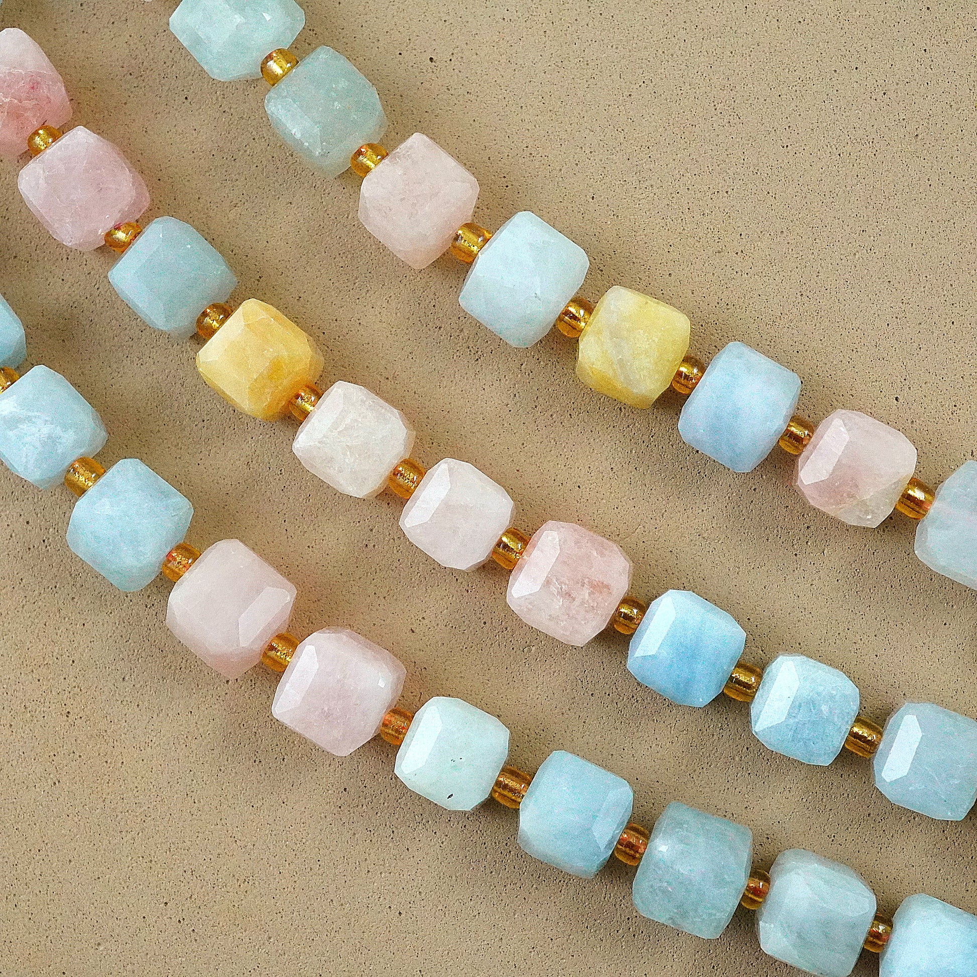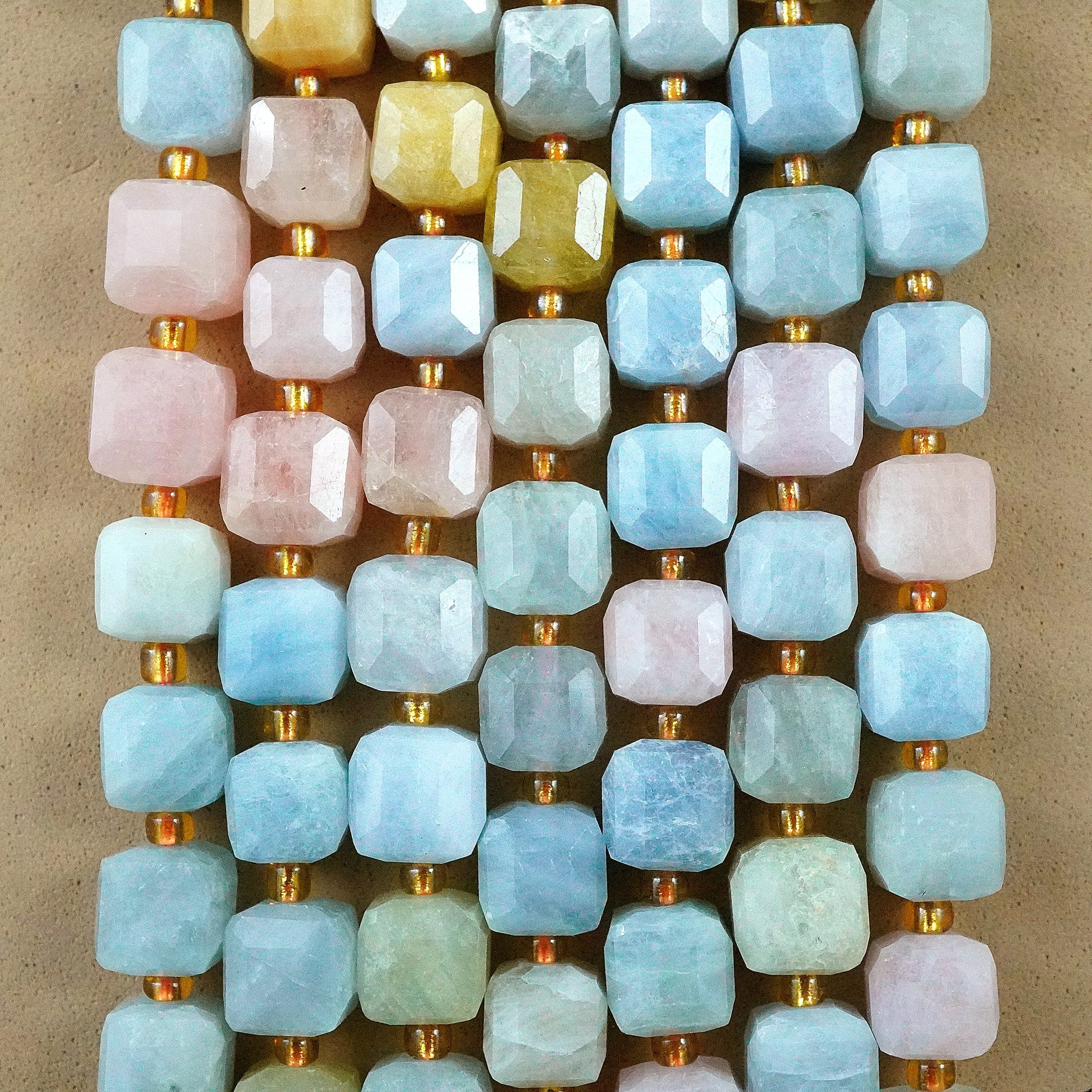 Aquamarine and morganite, with their captivating sea-blue and soft pink hues, transform into stunning faceted cube beads that bring a harmonious and elegant touch to any jewelry design. The enchanting clarity and delicate colors of these gemstones make each bead a unique treasure, perfect for crafting eye-catching necklaces, bracelets, and earrings. Elevate your jewelry collection with these exquisite aquamarine and morganite beads, and let their natural beauty inspire and captivate your creativity.