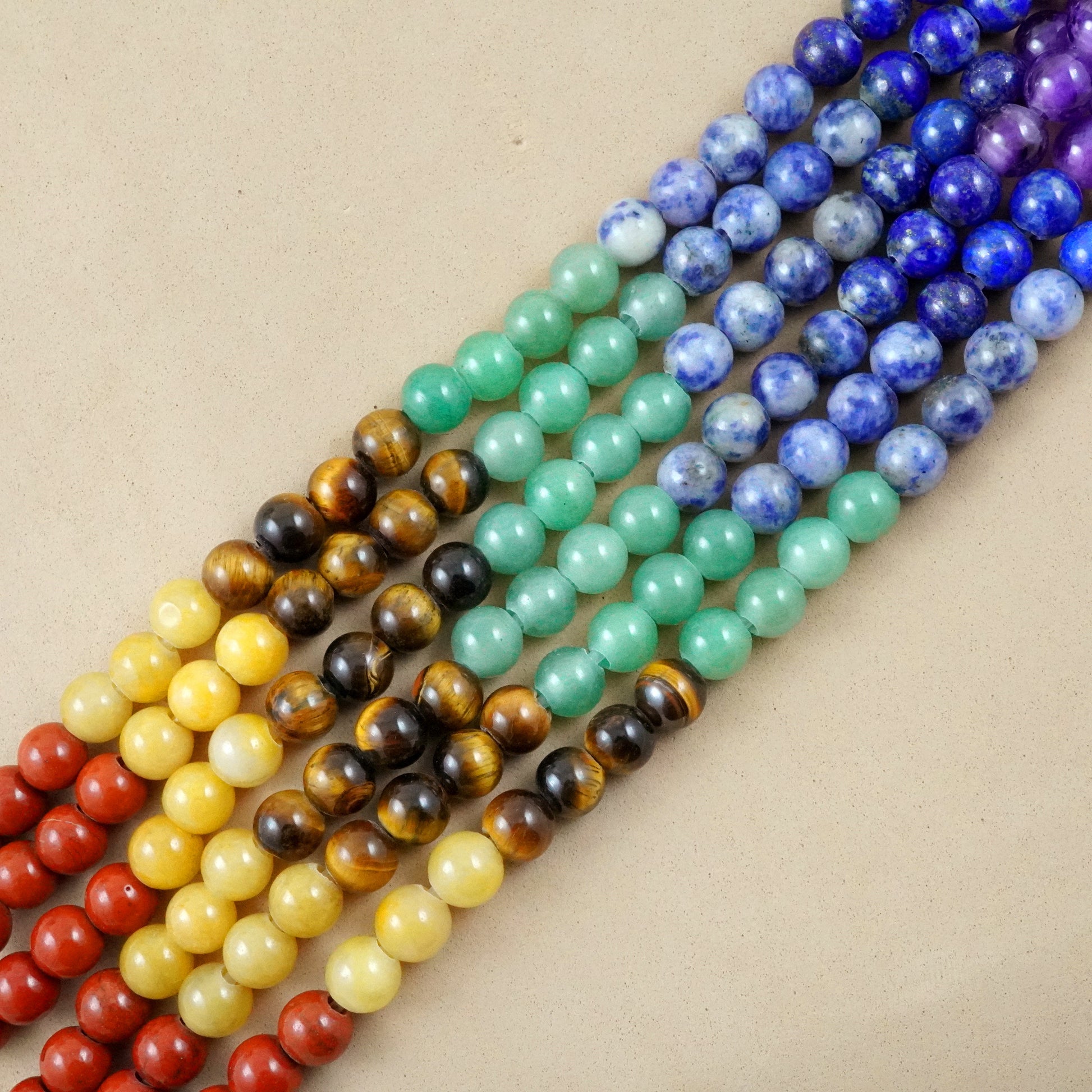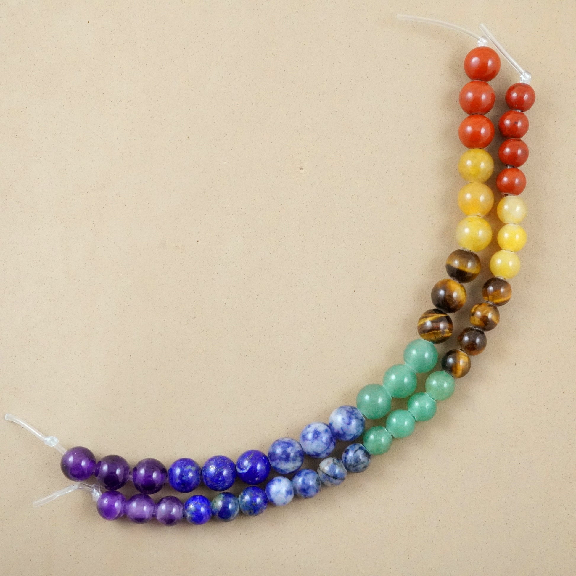Each of the 7 Chakras is represented by a Natural Stone Bead: Crown (Amethyst), Third Eye (Lapis), Throat (Sodalite), Heart (Green Aventurine), Solar Plexus (Tiger Eye), Sacral (Yellow Jade), Root (Red Jasper).
