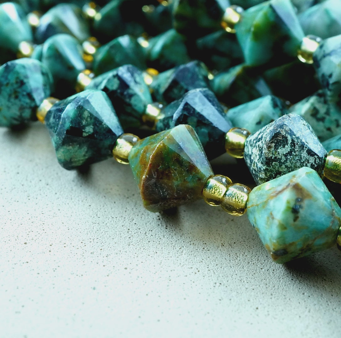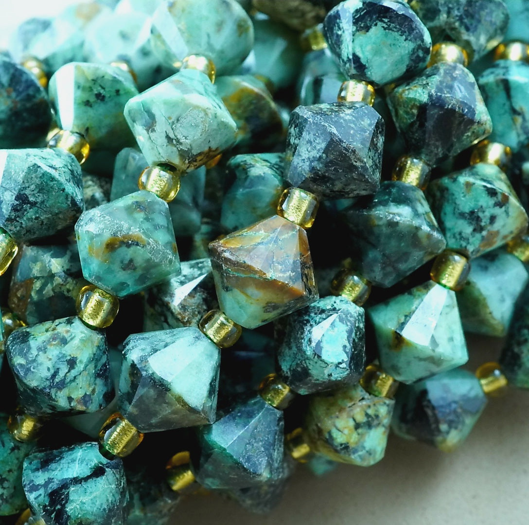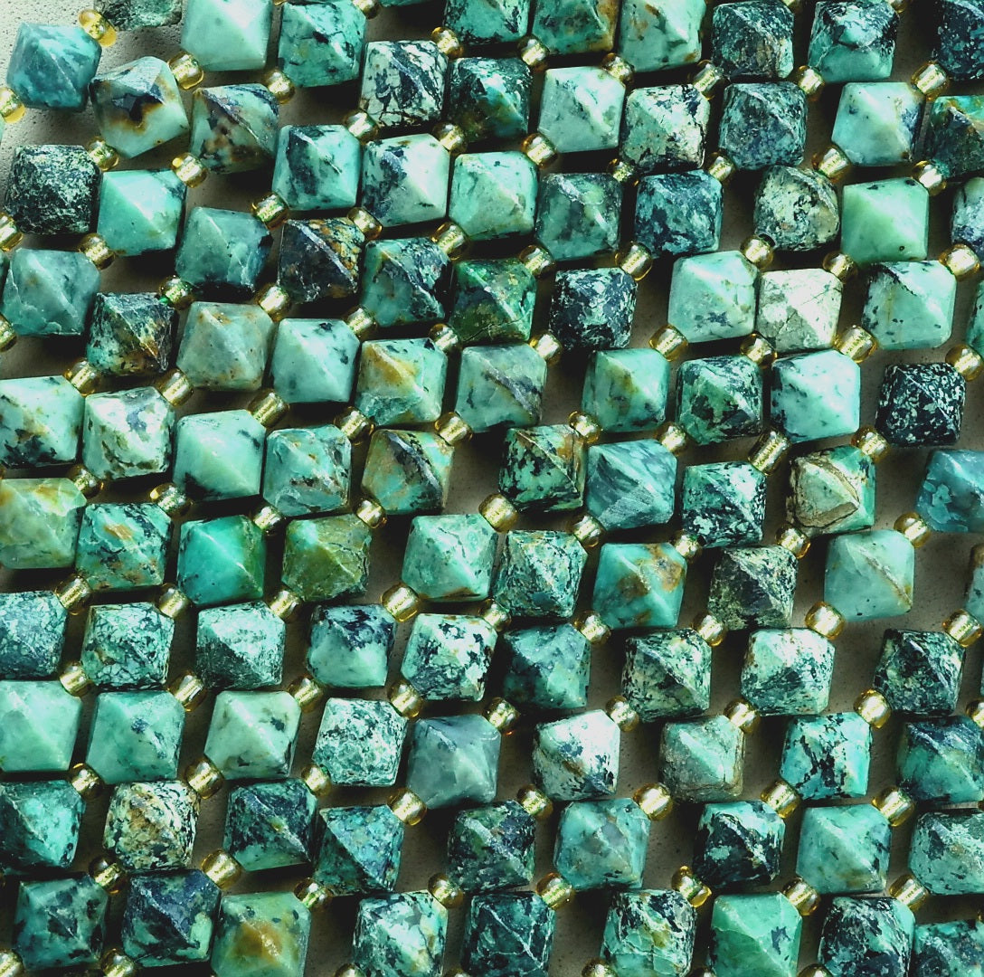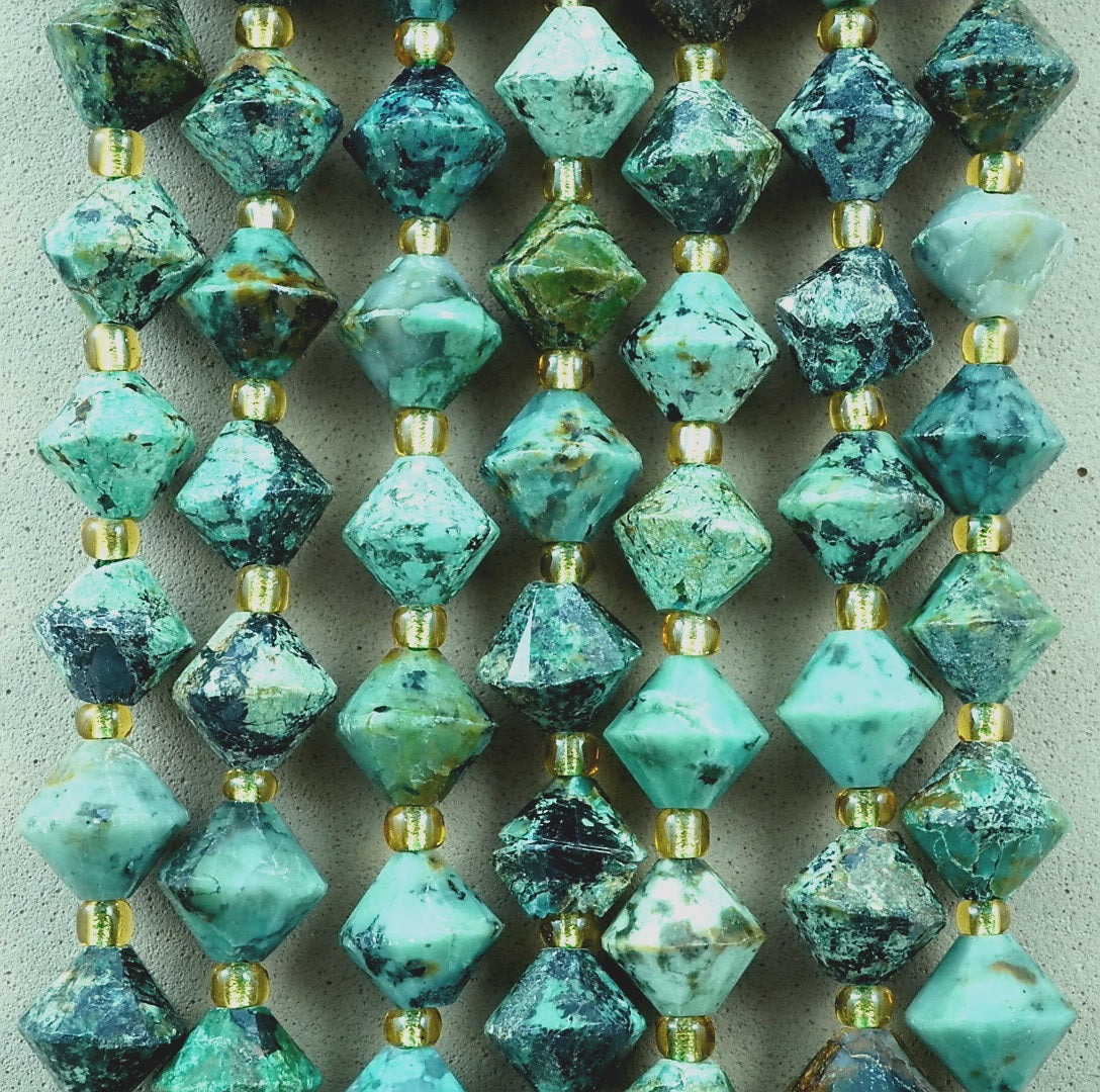 African Turquoise is a trade name given to a jasper mined in Africa whose colors and inclusions are very similar to that of natural Turquoise. These particular beads are cut and polished into faceted bicone beads.