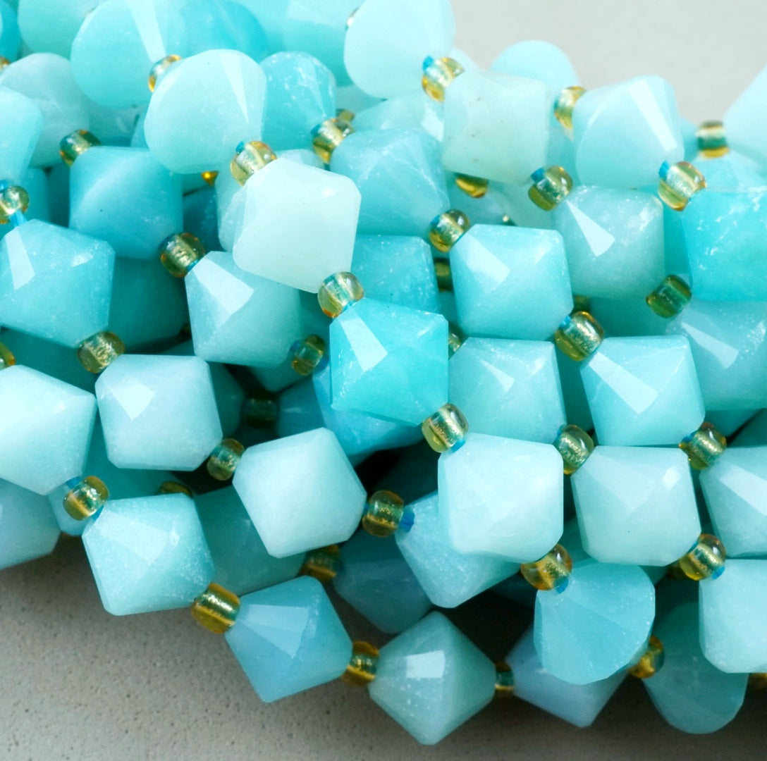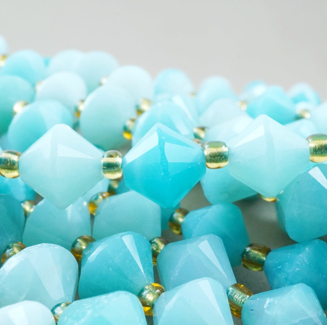 Amazonite is the blue green variation of feldspar. It is named after the Amazon River, where it is said to have been found. These particular beads have been cut and polished into Faceted Bicone beads.