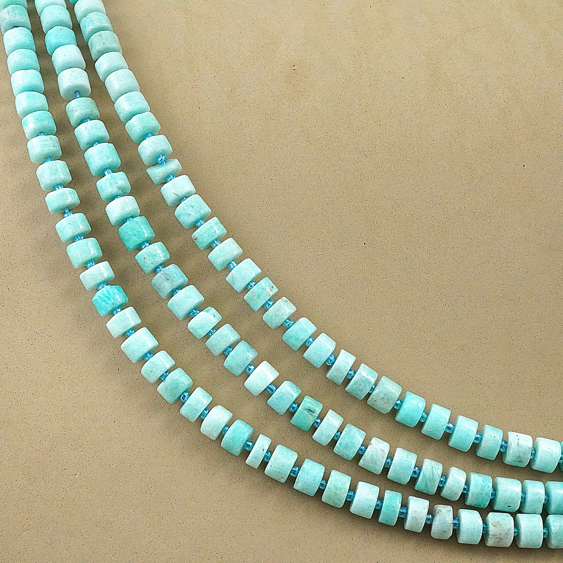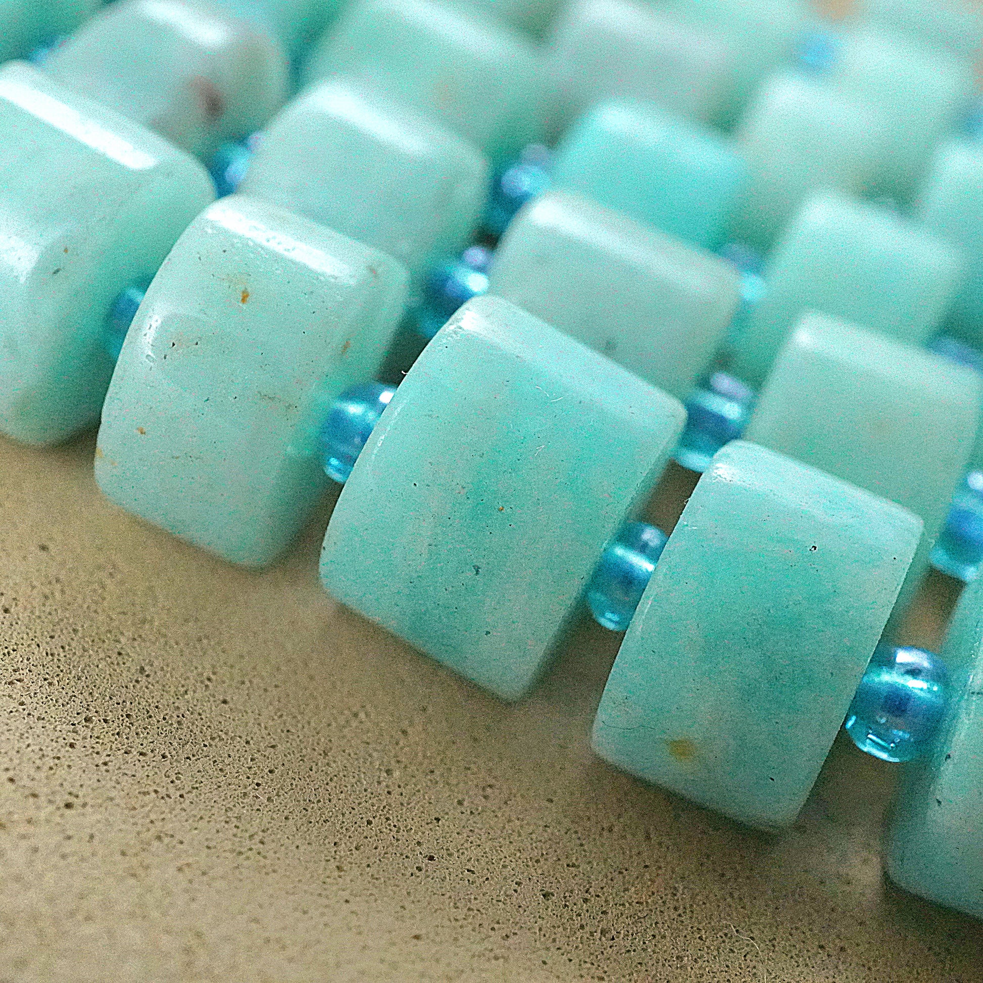 Amazonite is a light blue colored feldspar from brazil with white inclusions. These beads are cut into the classic Heishe shape which gives them a more unique natural look. Very attractive.