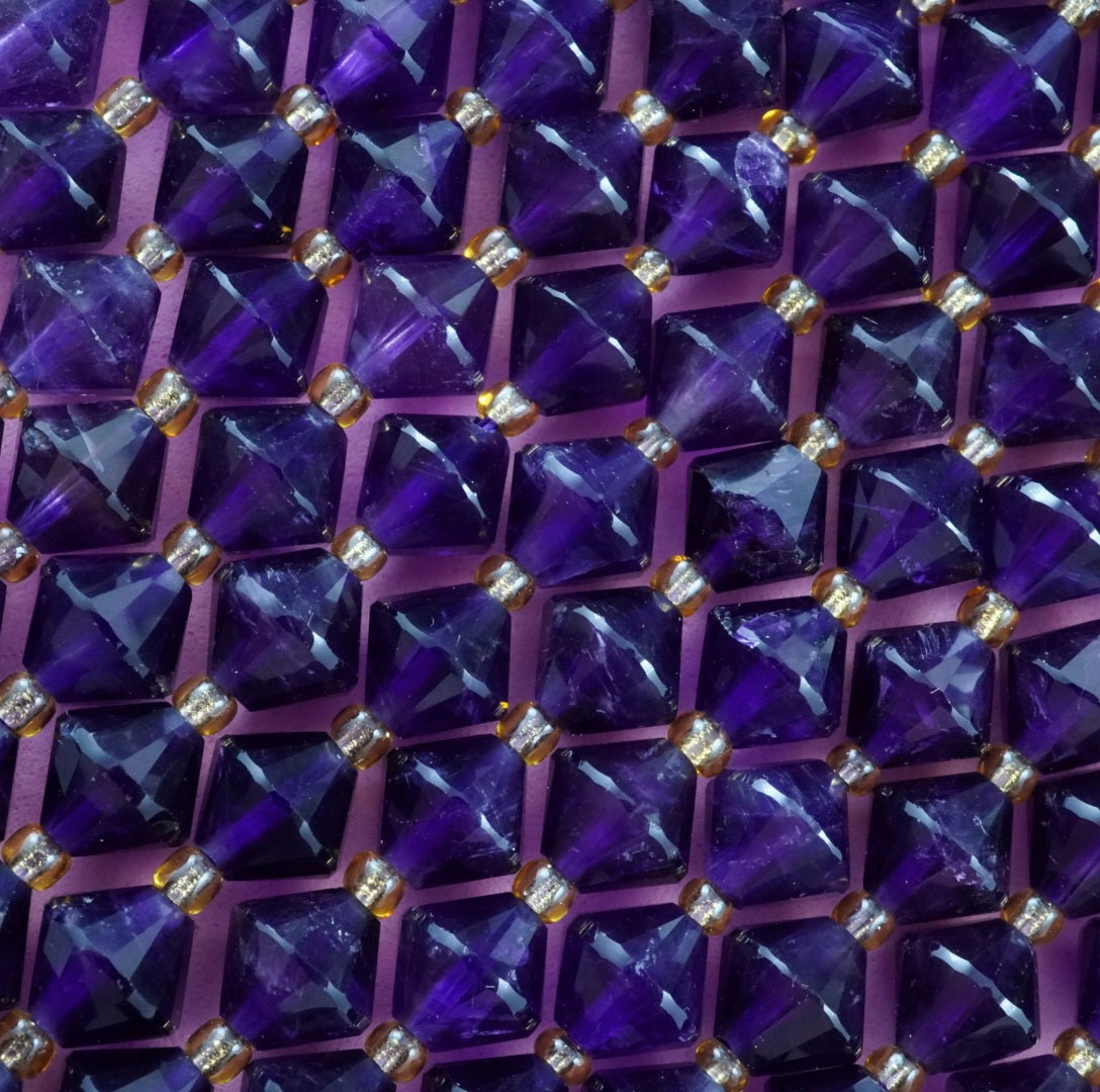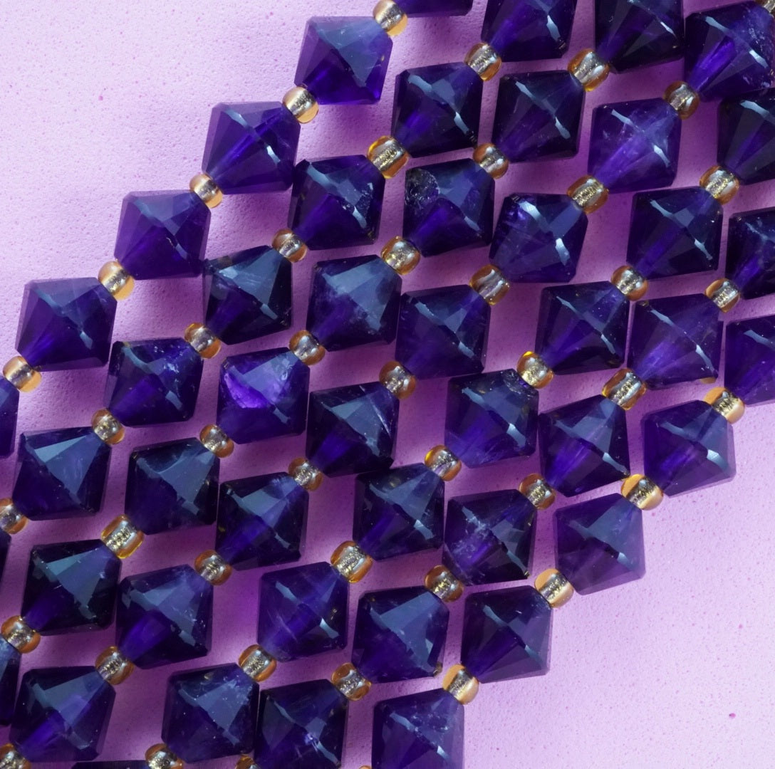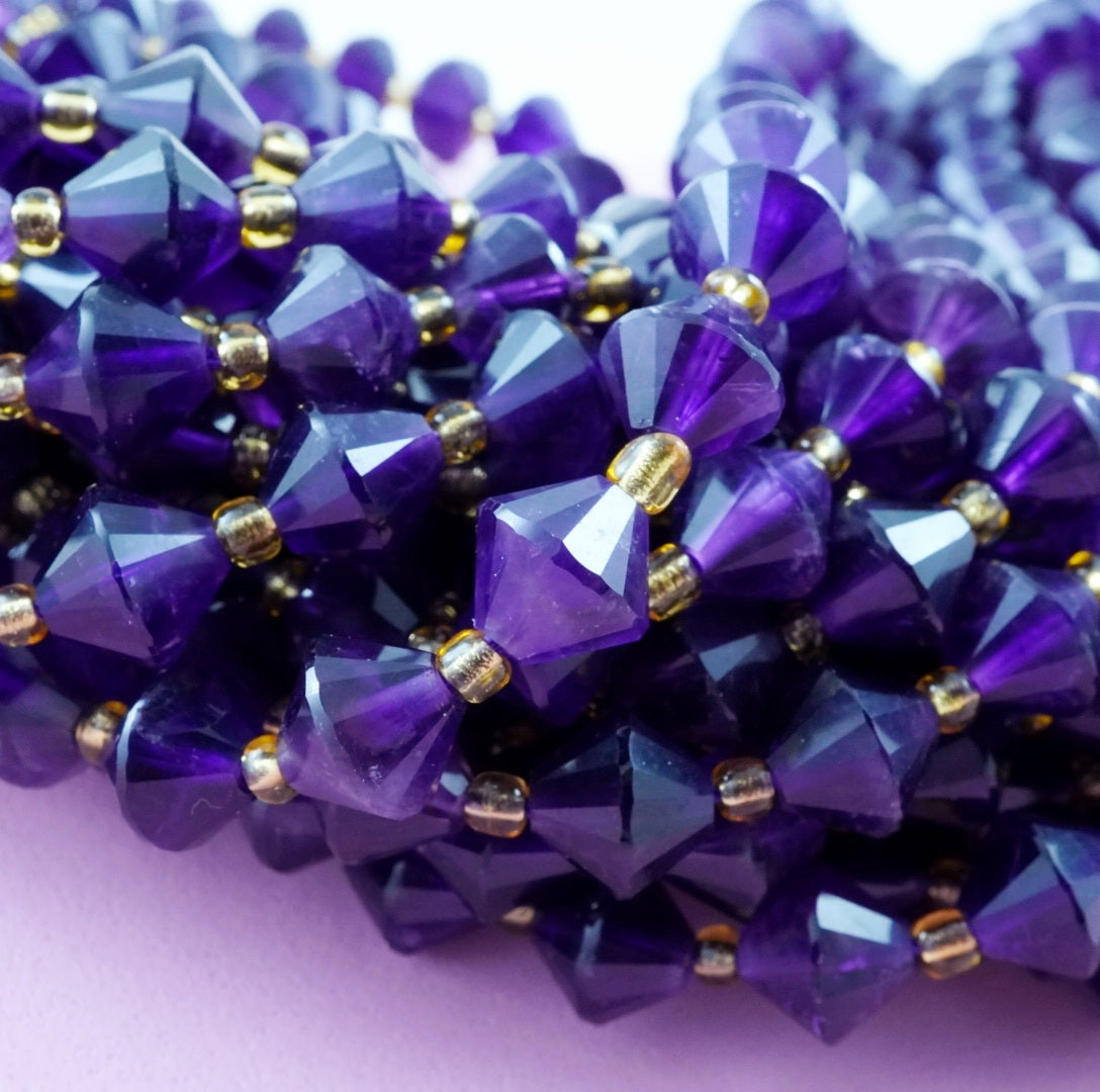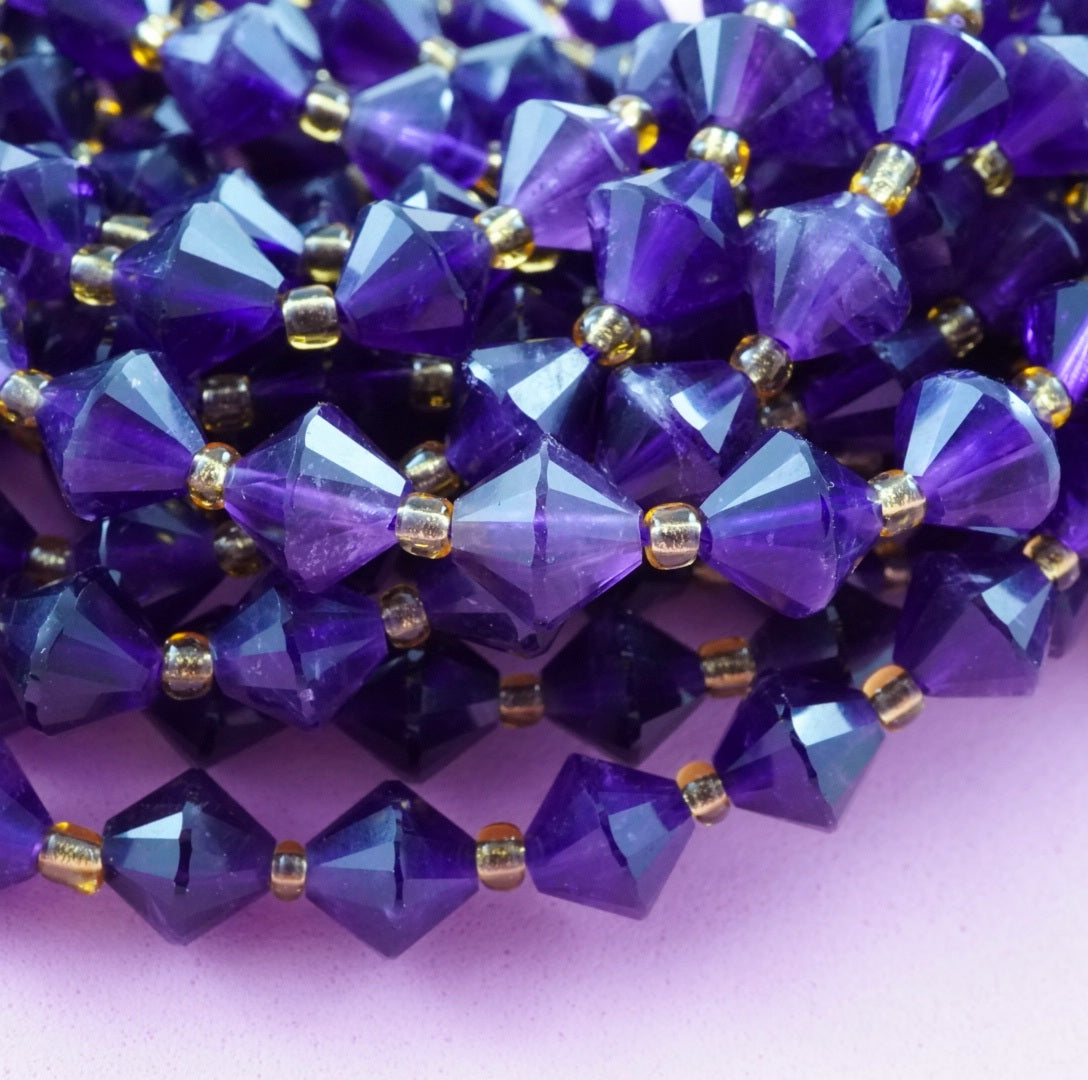 Amethyst is a purple variation of Quartz which is due to irradiation and iron impurities in the stone. These particular beads have been cut and polished into Faceted Bicone beads.