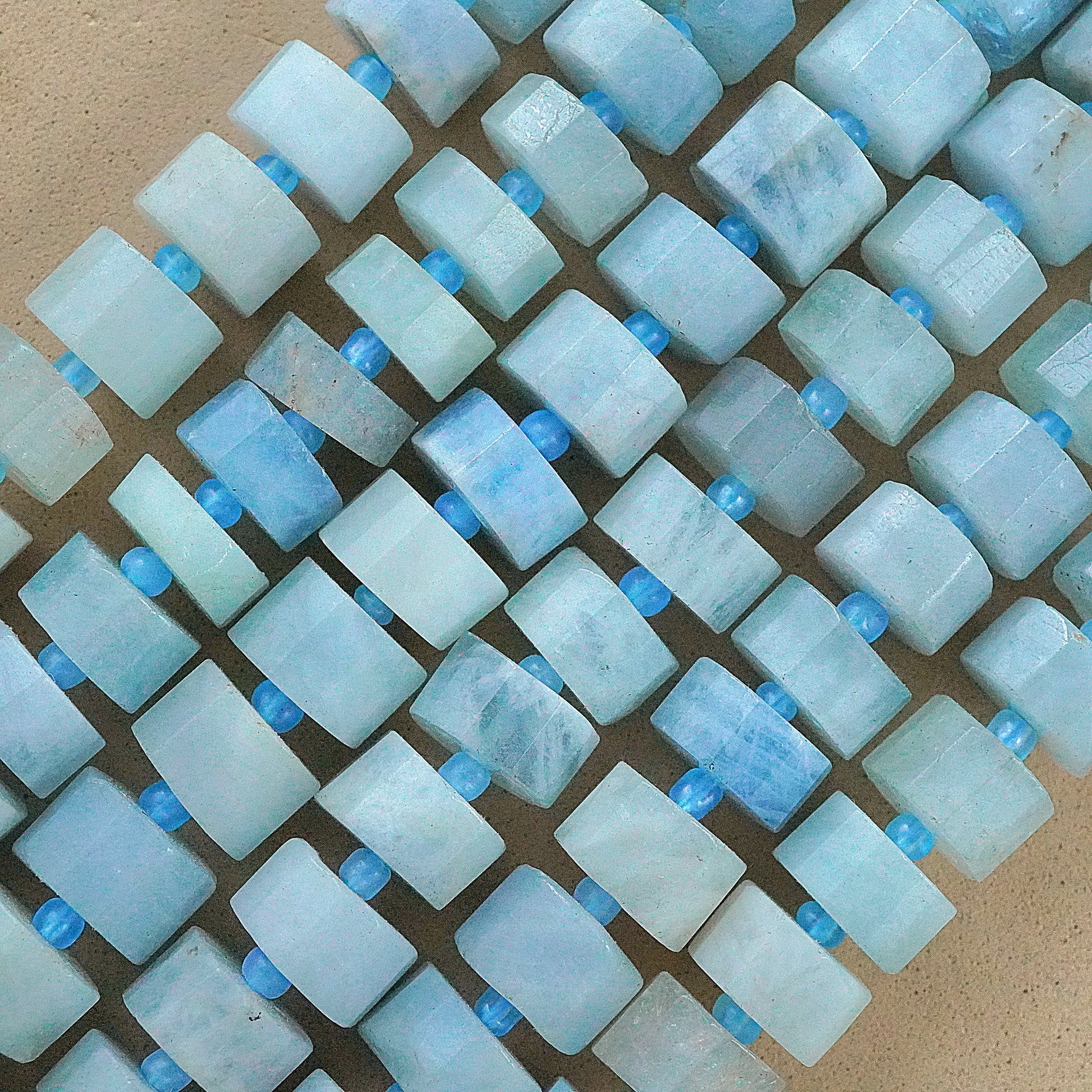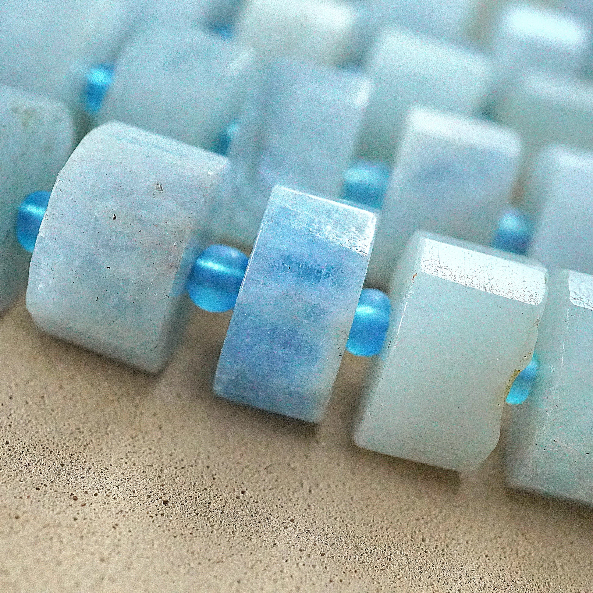 Aquamarine, the blue variation of Beryl, is one of the most popular stones in the world. These beads have been cut in the traditional Heishe style. They have facets on the sides, giving it an extra sparkle to the already beautiful blue shaded beads.