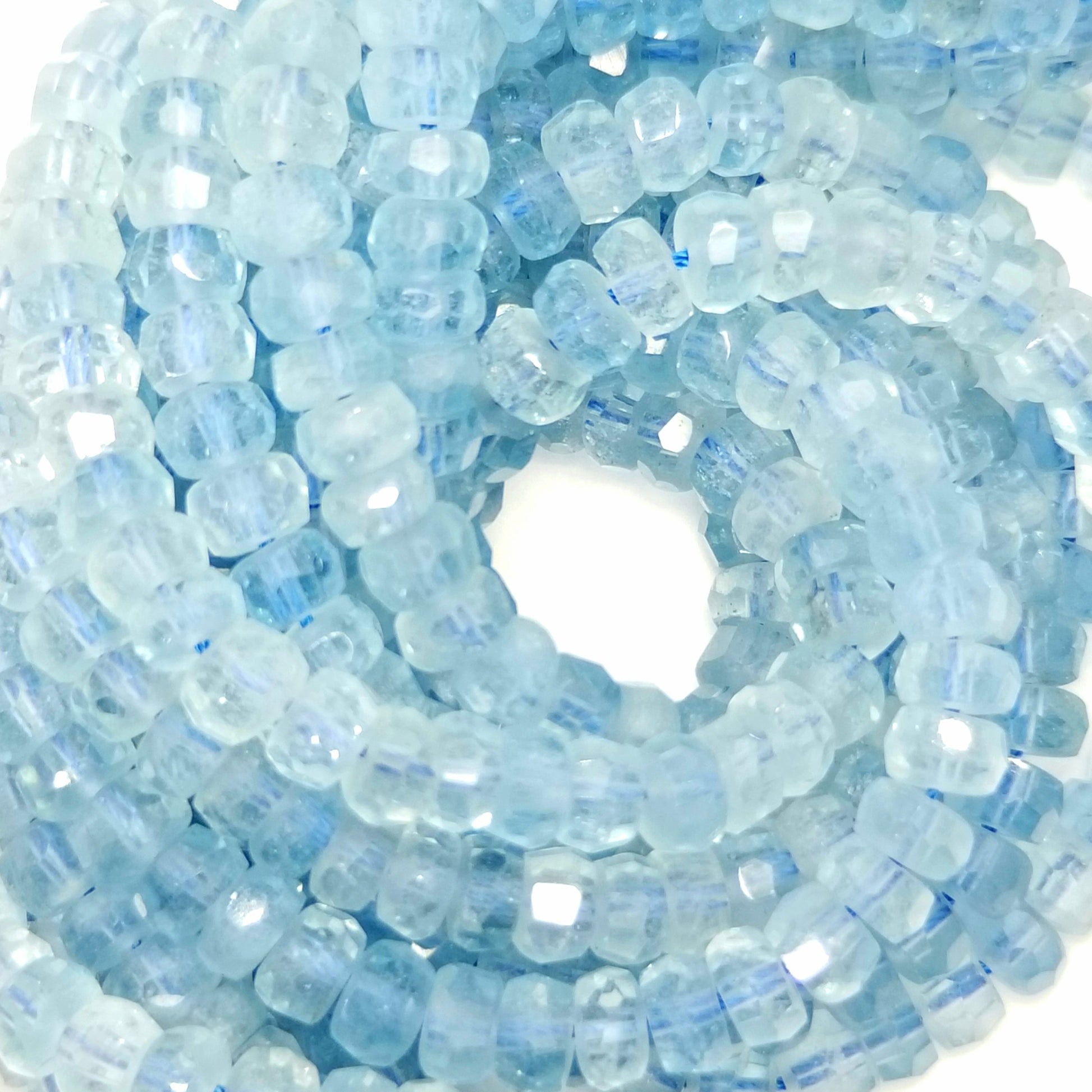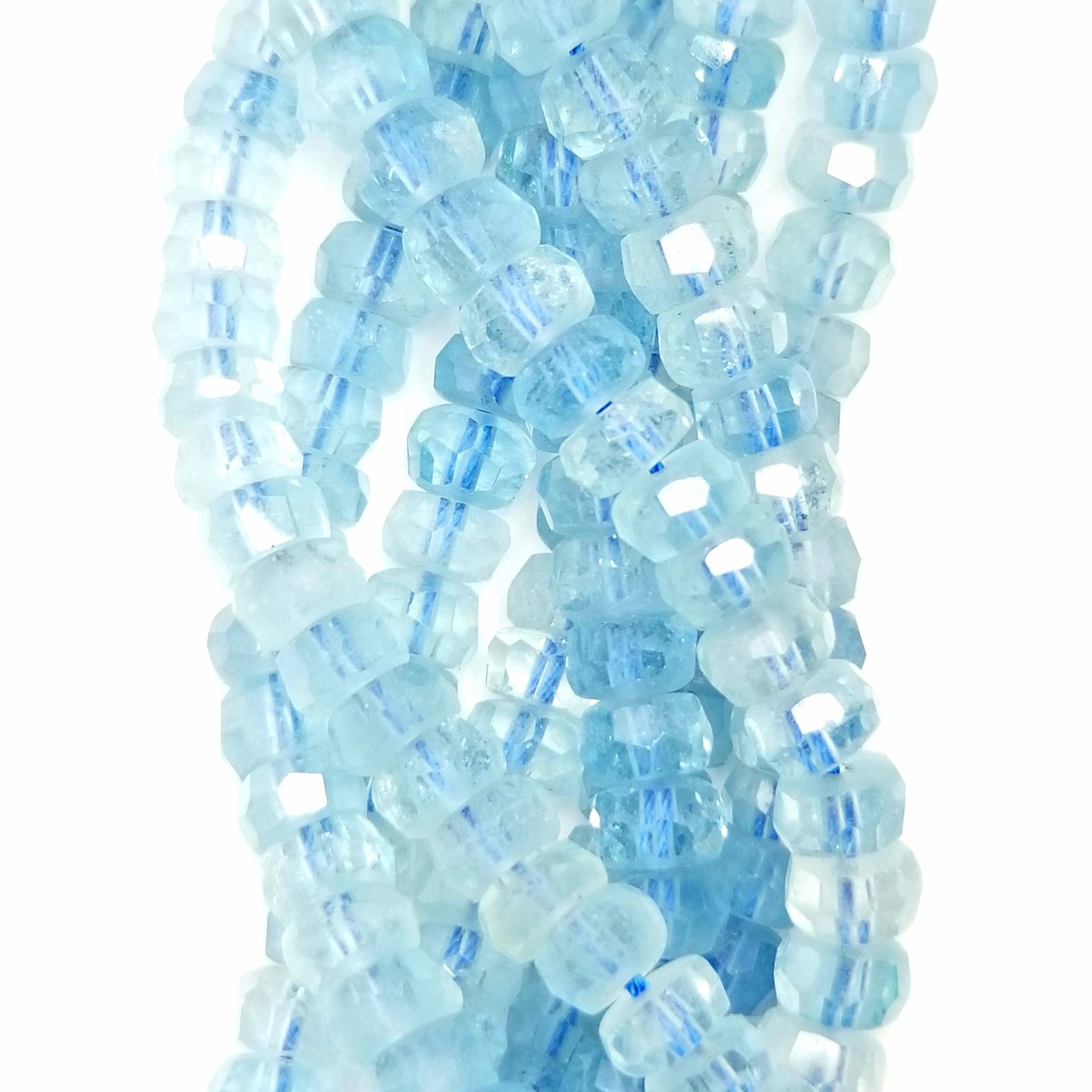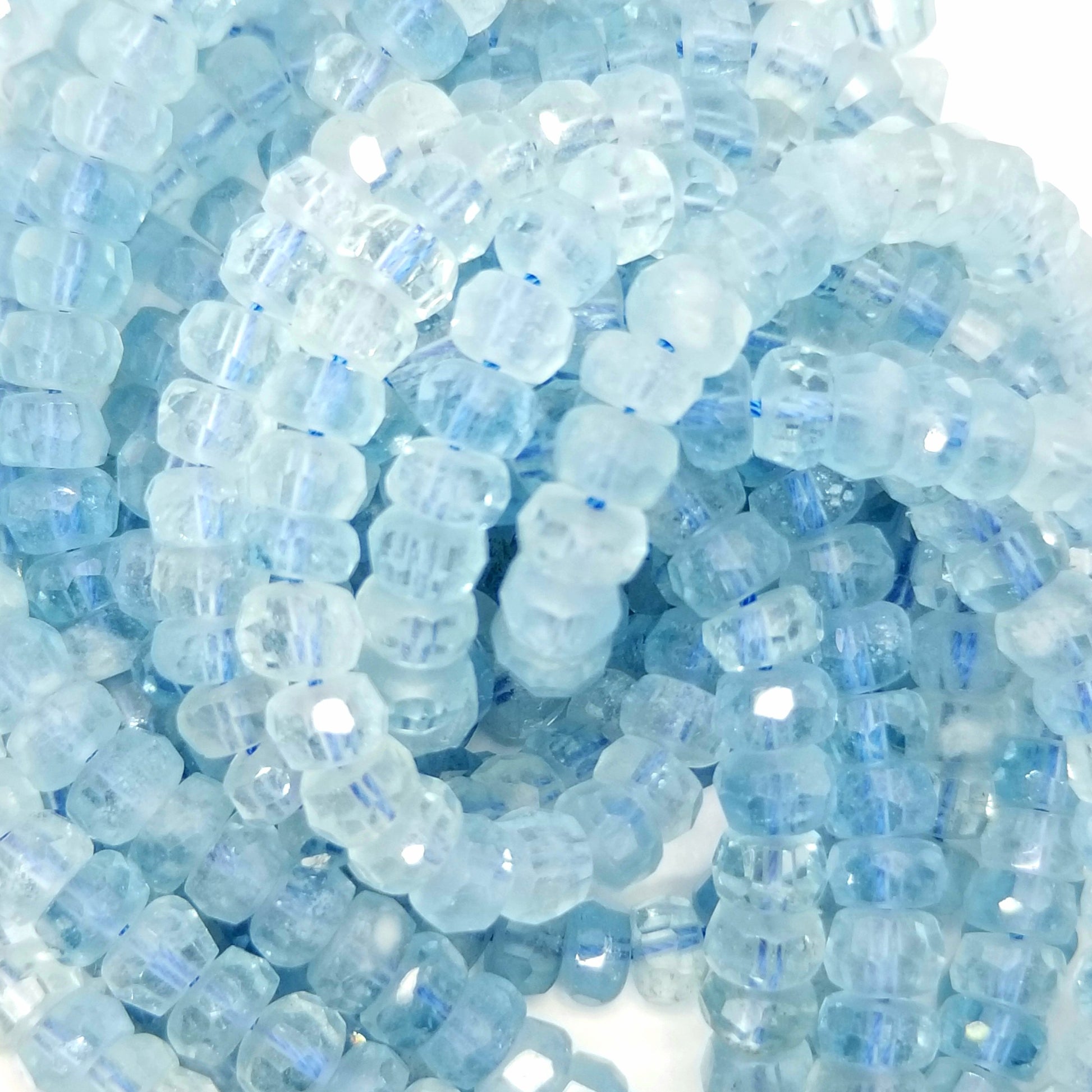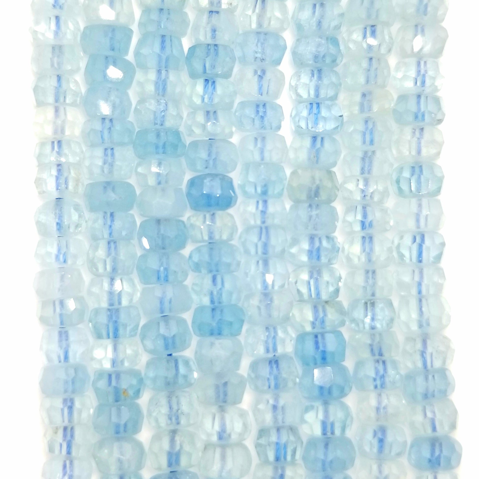 Aquamarine is a popular blue stone that is a variation of the mineral Beryl. These beads are A quality. They're hand faceted so the cuts are larger and more visible. They're also rondelle shaped, which is a very versatile shape that can be used as spacers or as the main part of any jewelry piece. Definitely a must have!