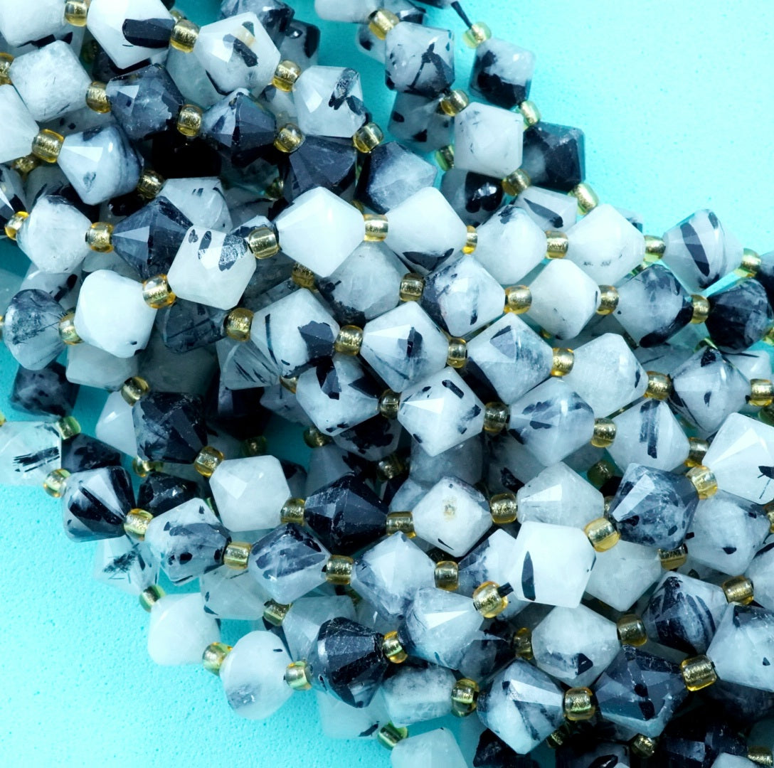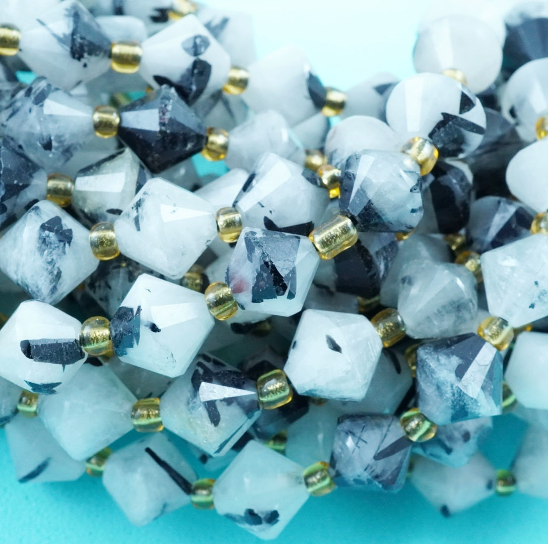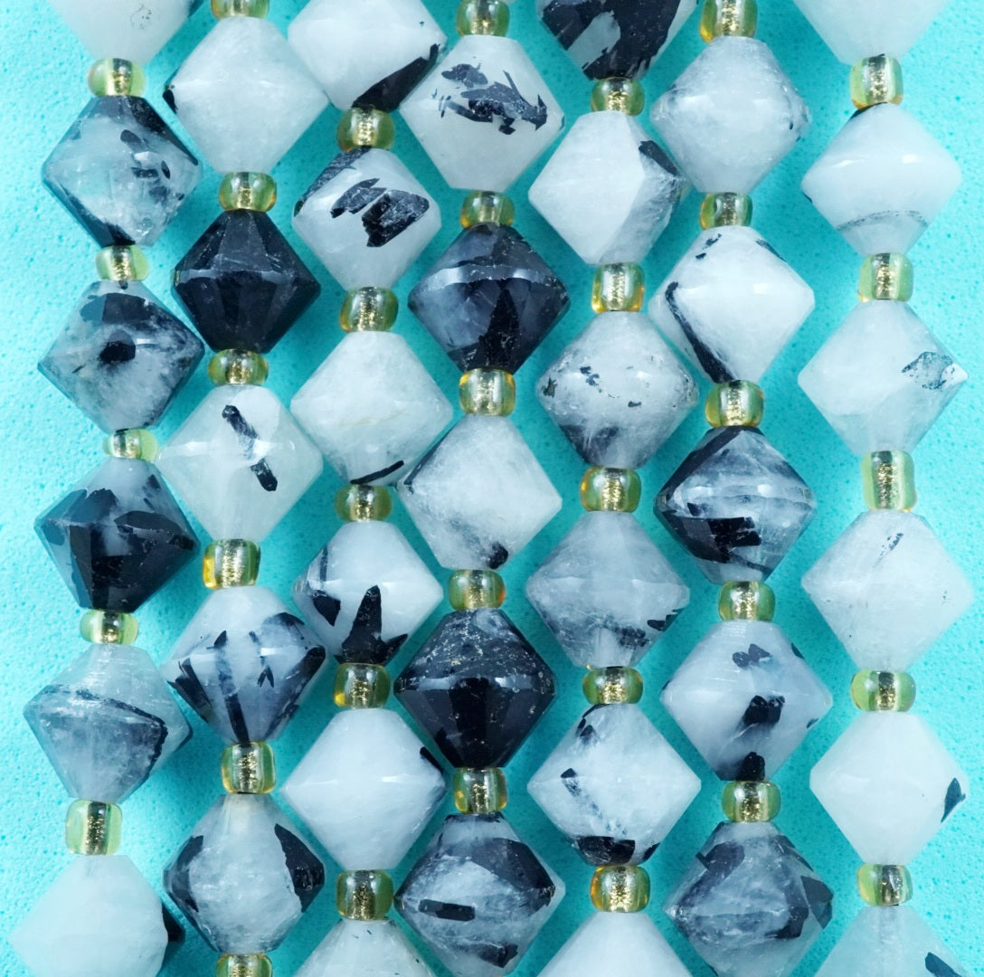 Black Tourmalated Quartz also called Tourmalinated Quartz, is a clear or white quartz with black needle like inclusions of tourmaline crystals going through it. These particular beads have been cut and polished into Faceted Bicone Beads.