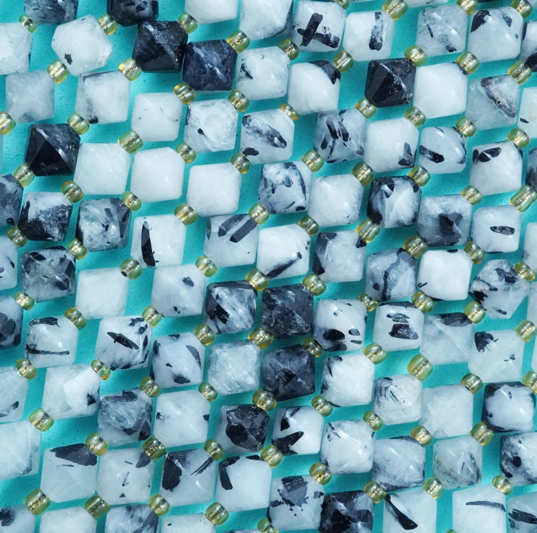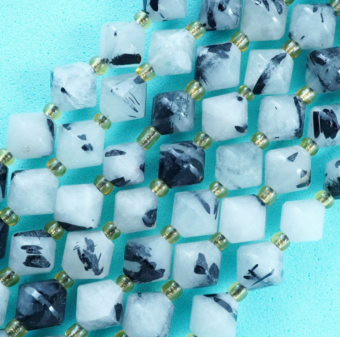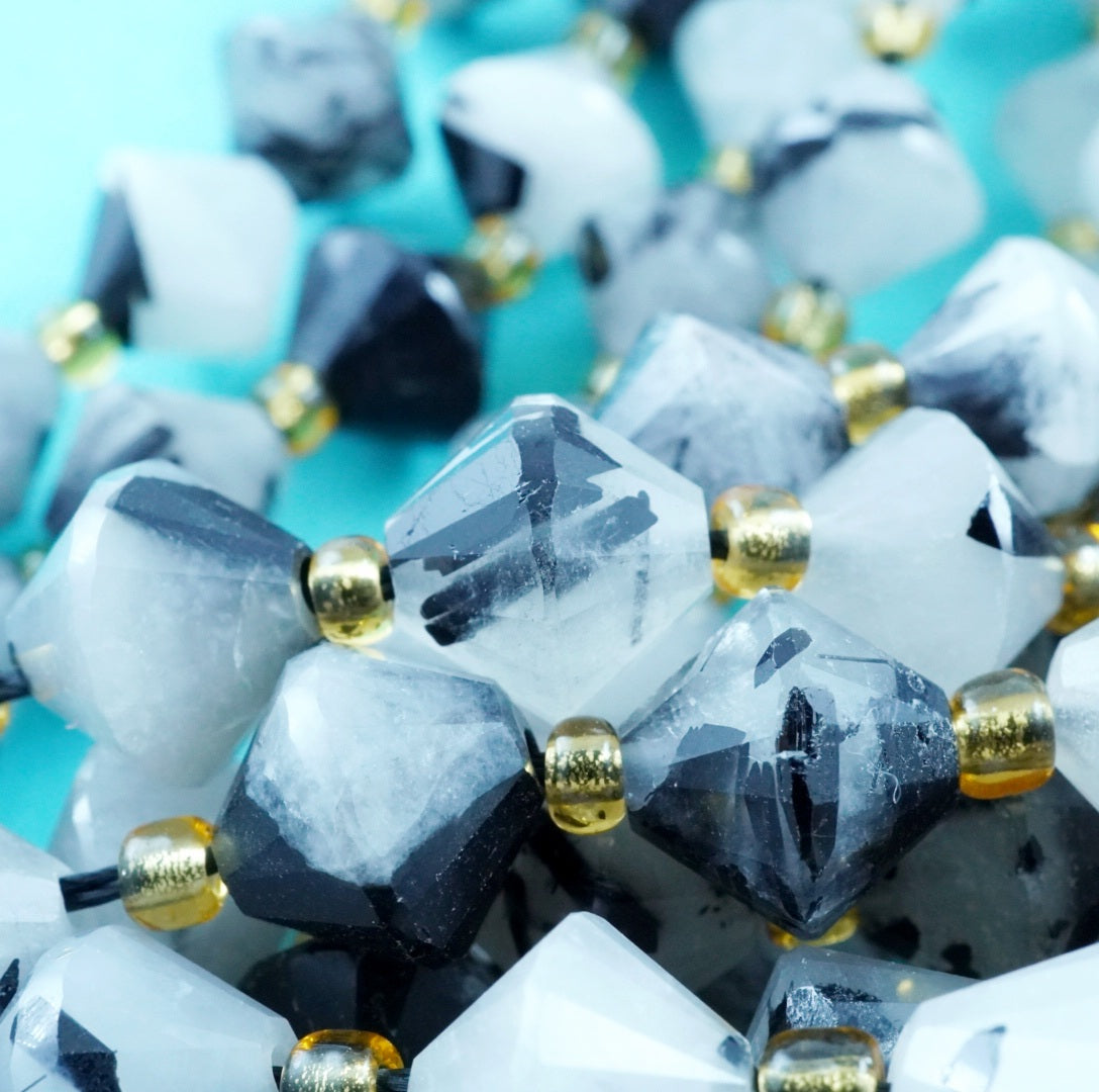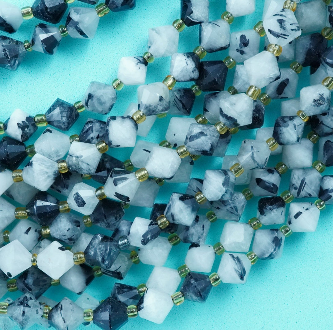 Black Tourmalated Quartz also called Tourmalinated Quartz, is a clear or white quartz with black needle like inclusions of tourmaline crystals going through it. These particular beads have been cut and polished into Faceted Bicone Beads.