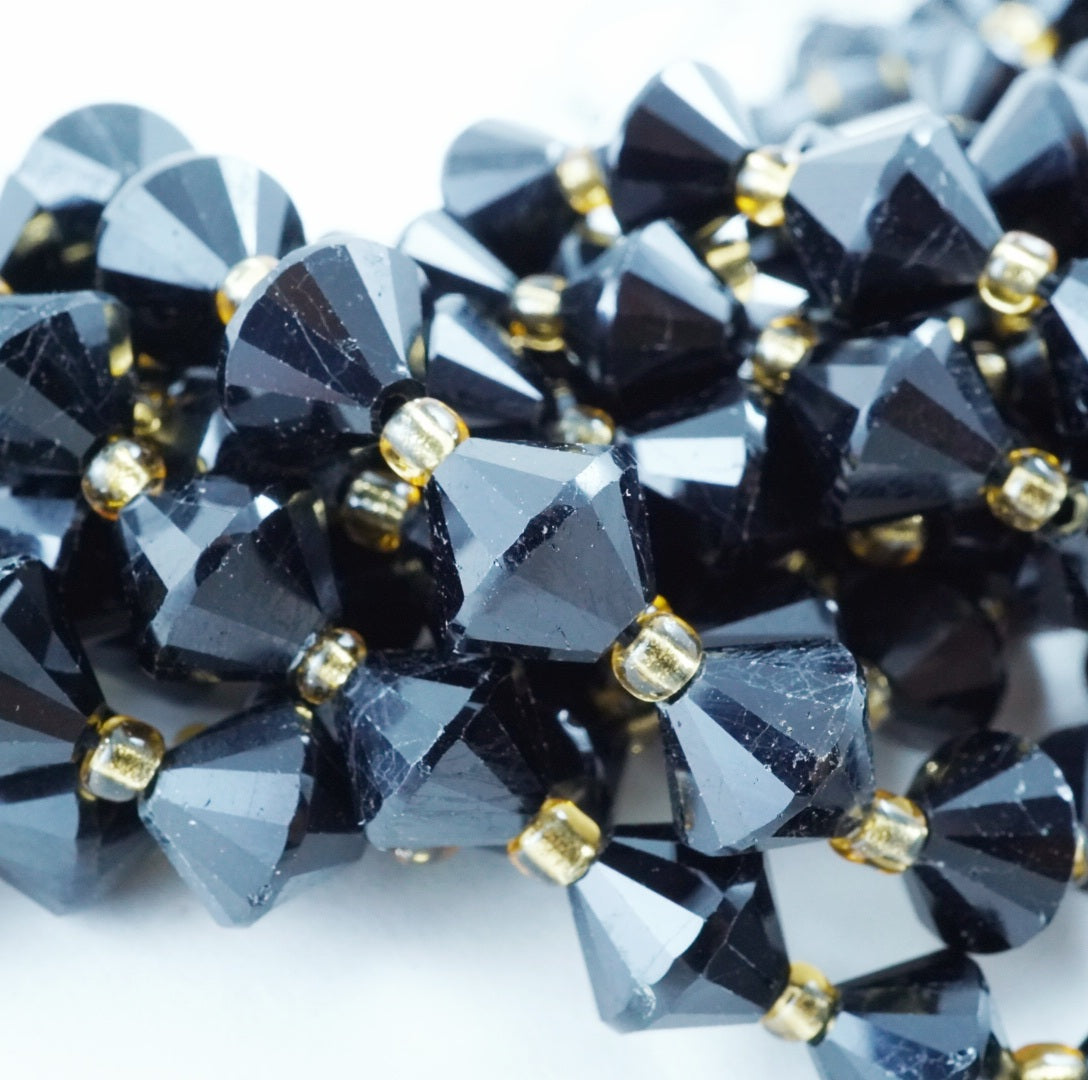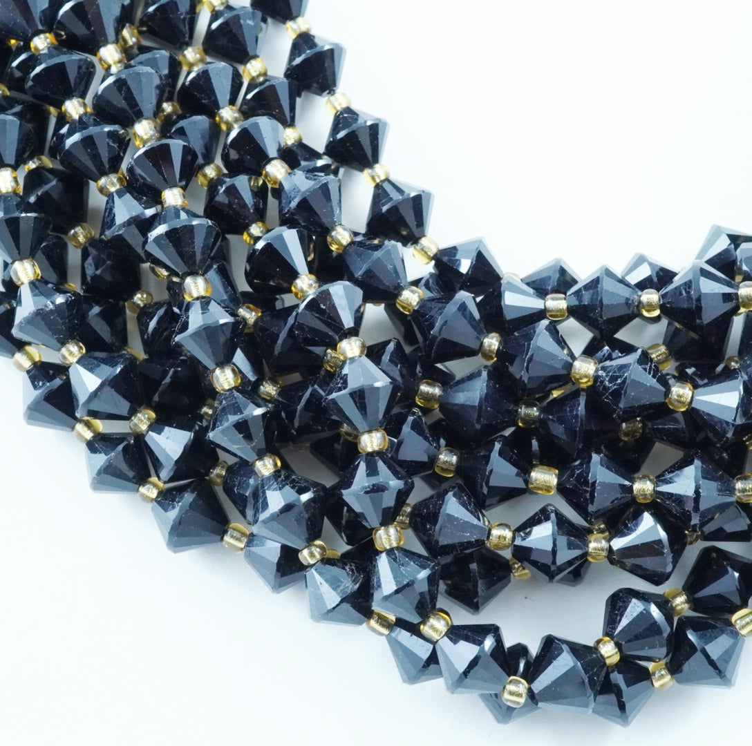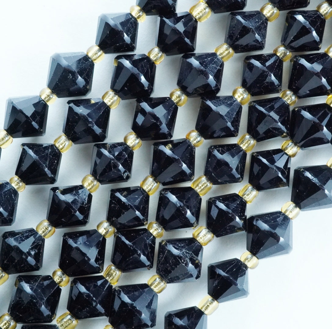 Black Tourmaline also known as Schorl, is the most common variation of Tourmaline. These particular beads have been cut and polished into Faceted Bicone beads.