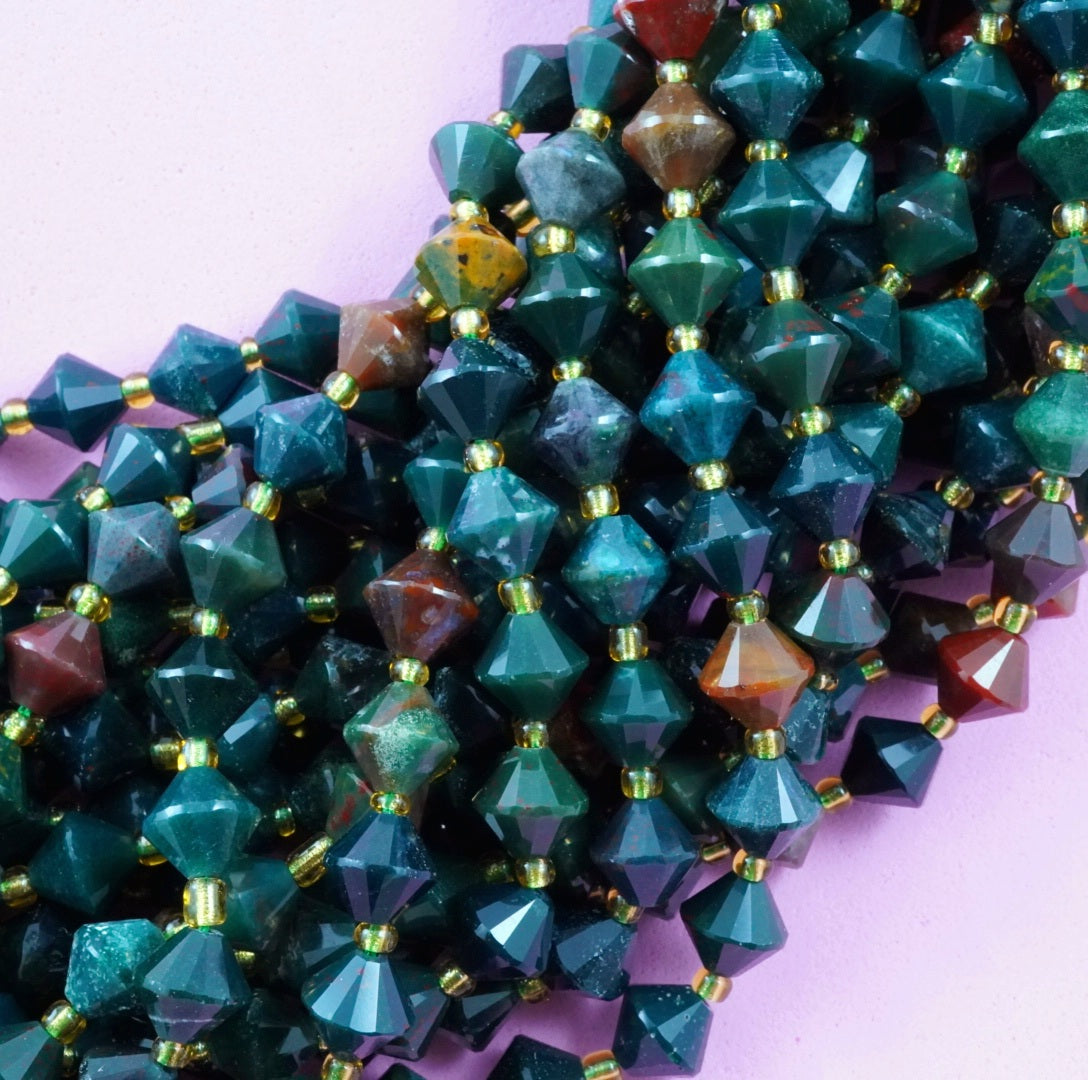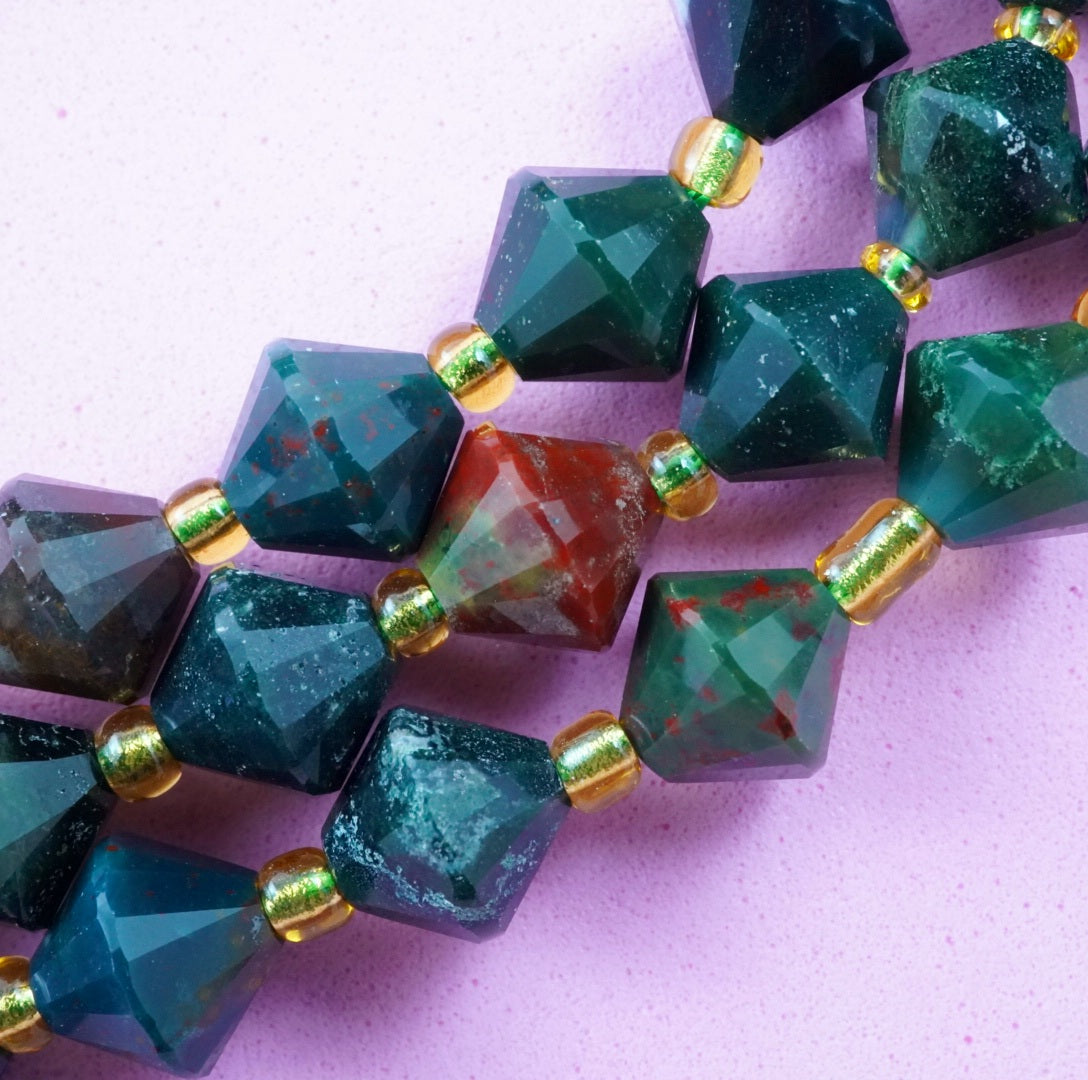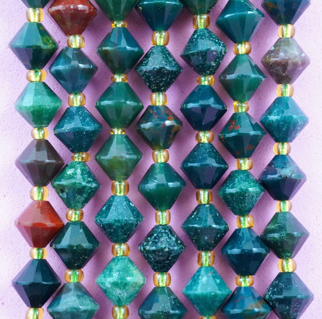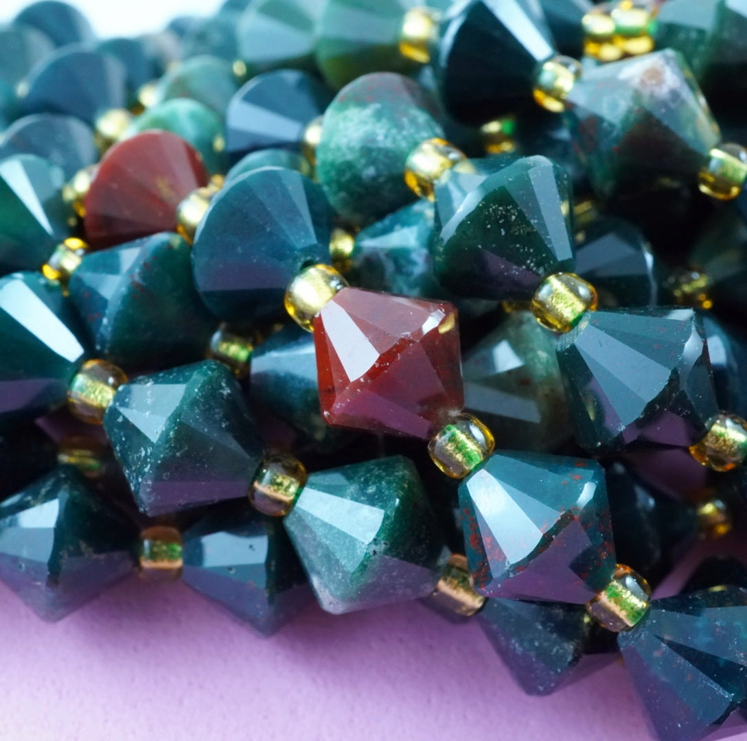 Blood Stone is a dark green stone with deep red inclusions made of Iron. It is prized by many healers for its spiritual properties. These particular beads have been cut and polished into beautiful faceted bicone beads.