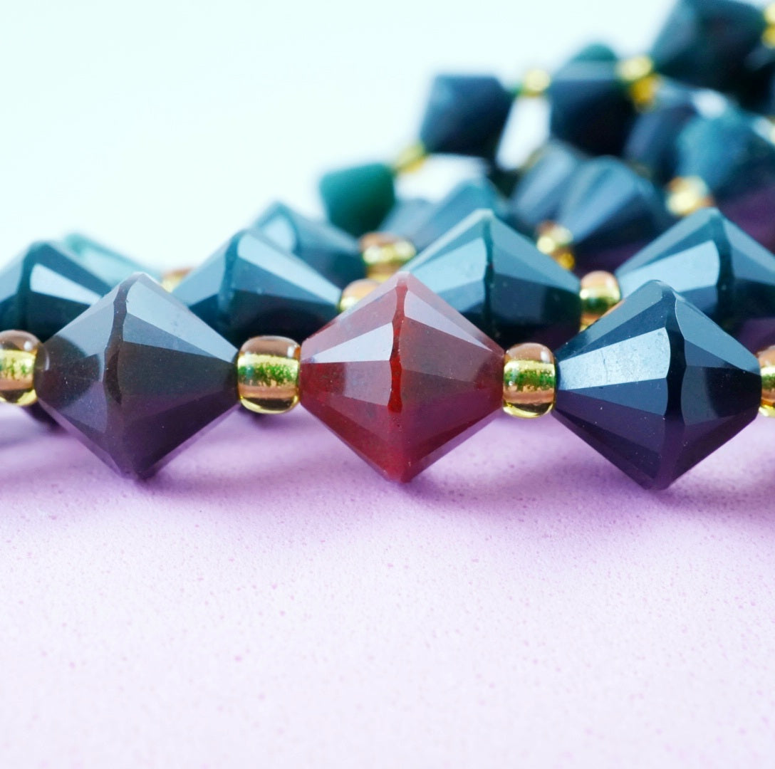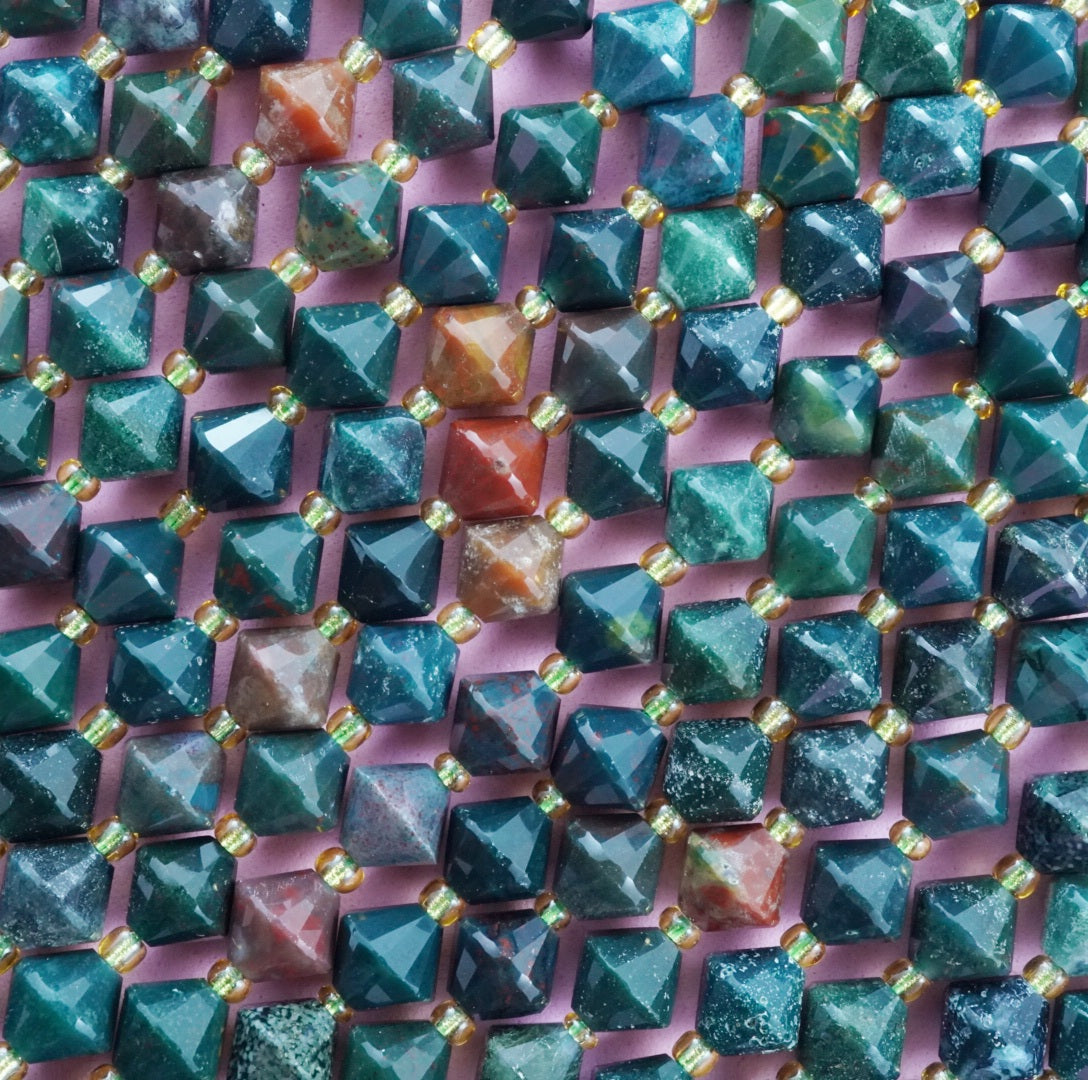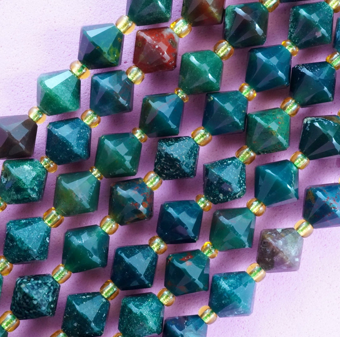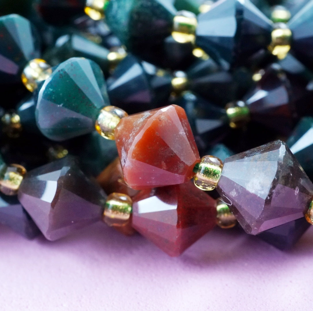 Blood Stone is a dark green stone with deep red inclusions made of Iron. It is prized by many healers for its spiritual properties. These particular beads have been cut and polished into beautiful faceted bicone beads.