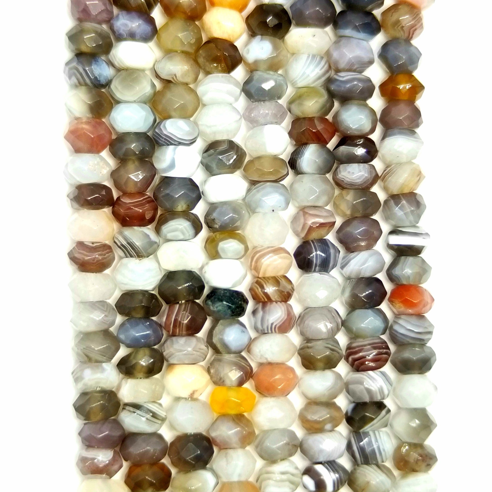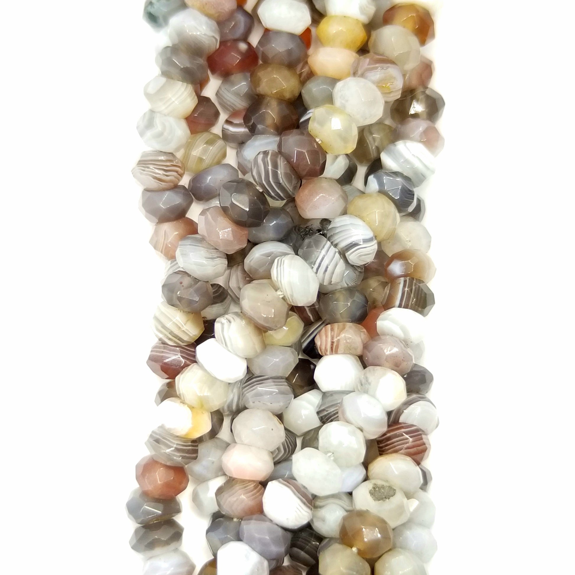 Botswana Agate is a type of banded agate found in Southern Africa that comes in layers of grey, brown, white, and pink. It has been cut into a rondelle shape and faceted to enhance it shine. It is often used as protection against evil energies.