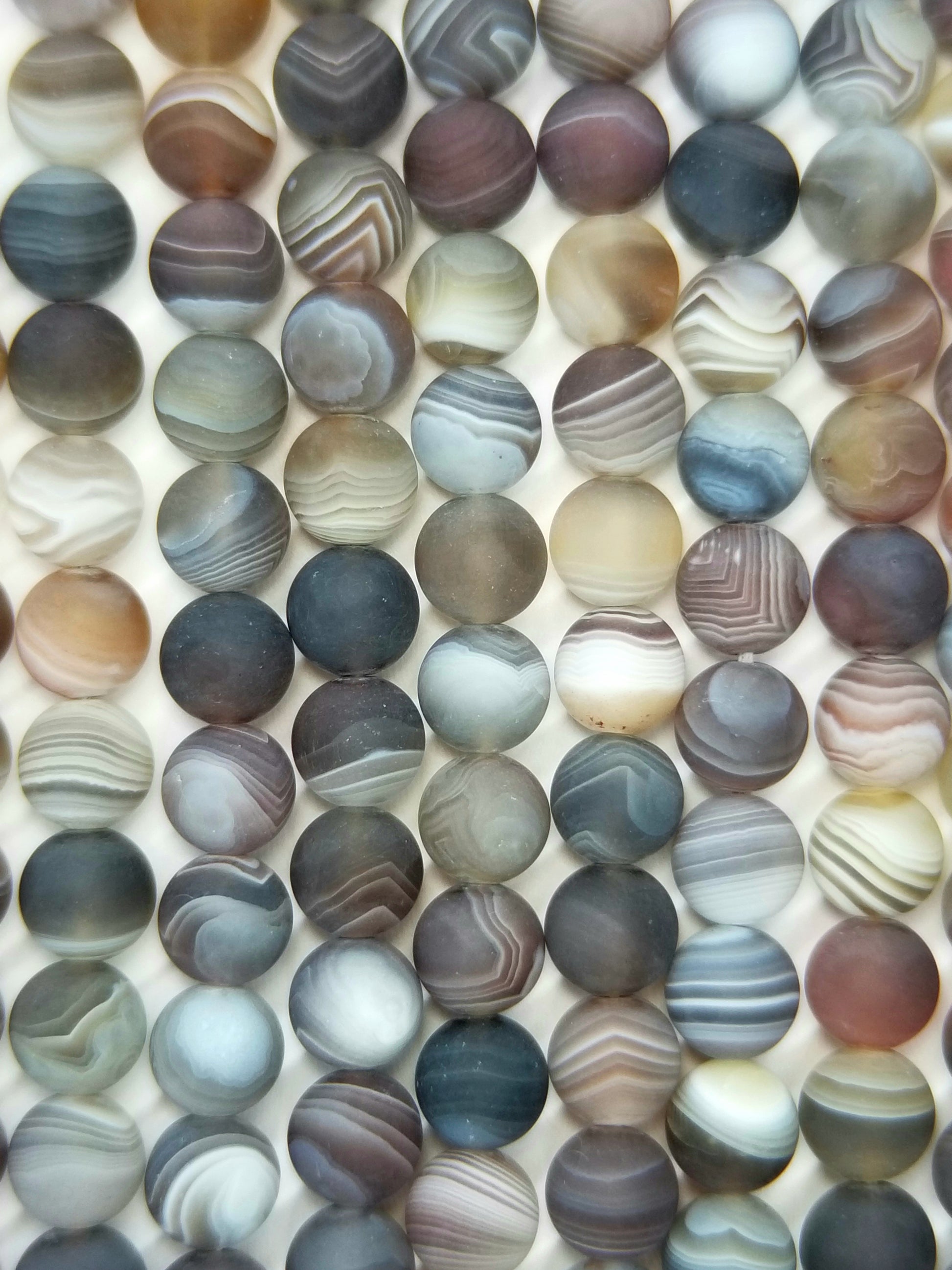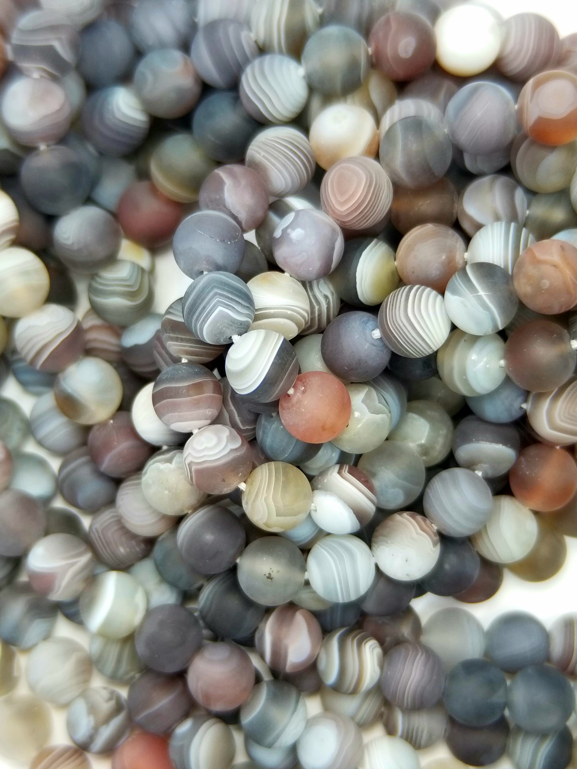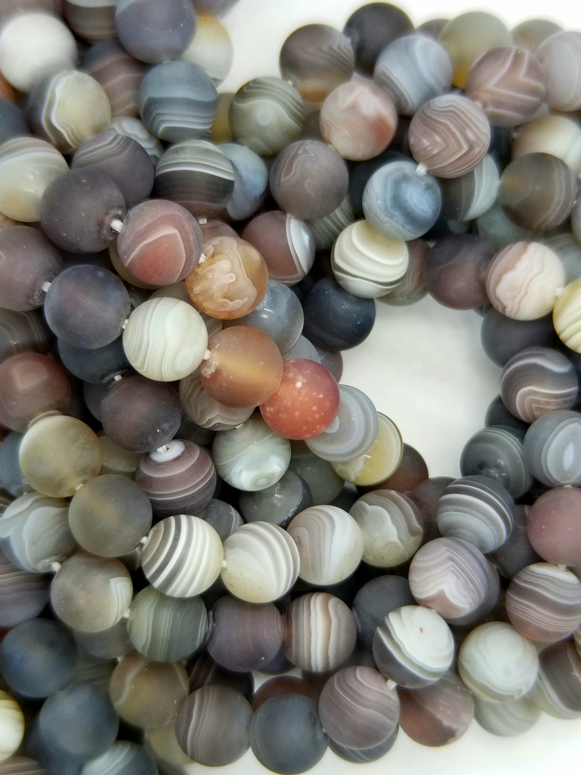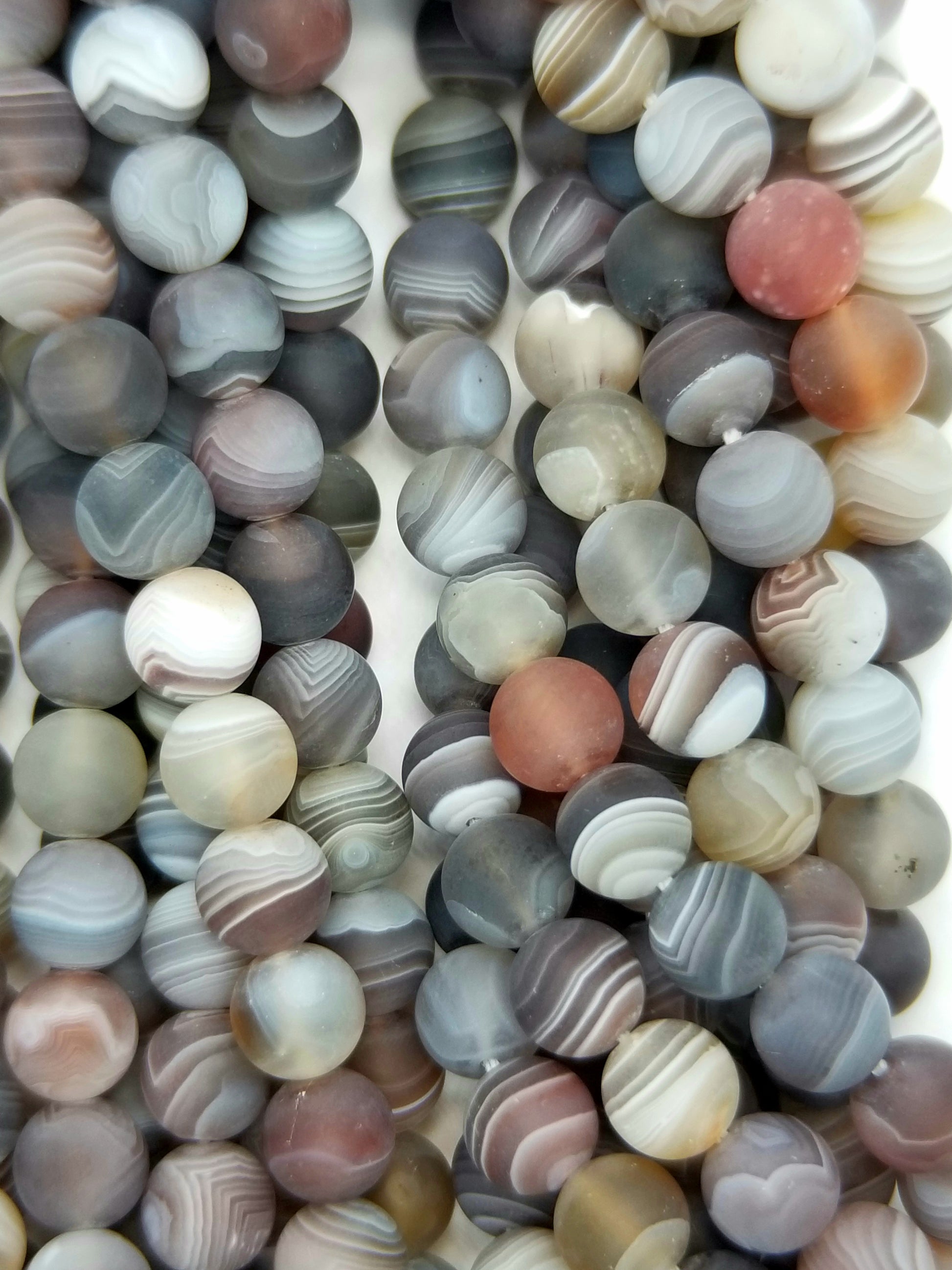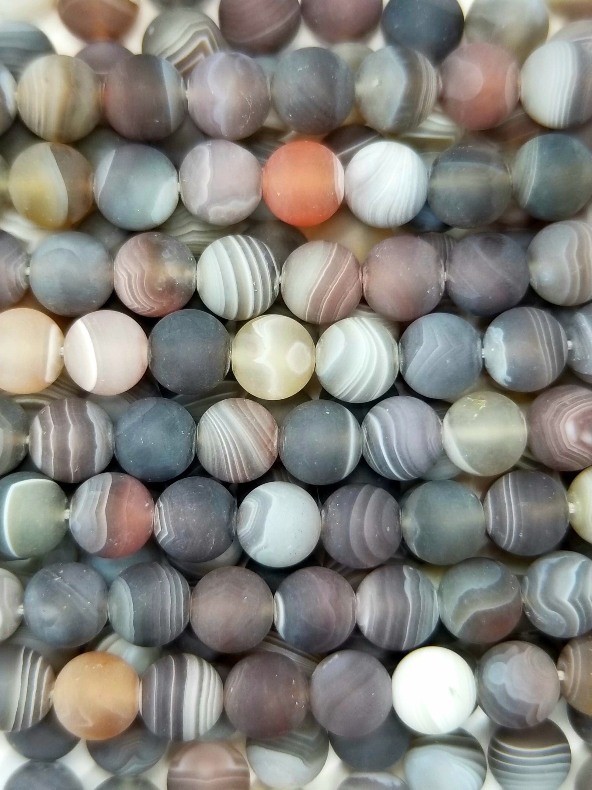 Botswana Agate is a type of Agate that displays grey, white, and sometimes pink bands. It is named after the country in Africa where it is mined, Botswana.