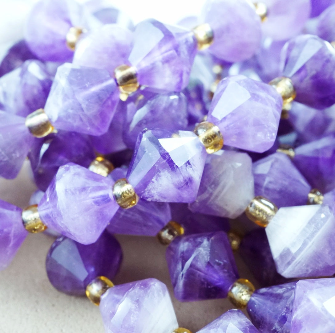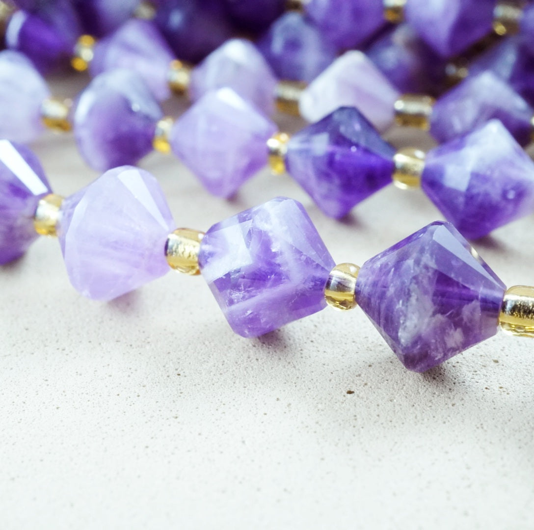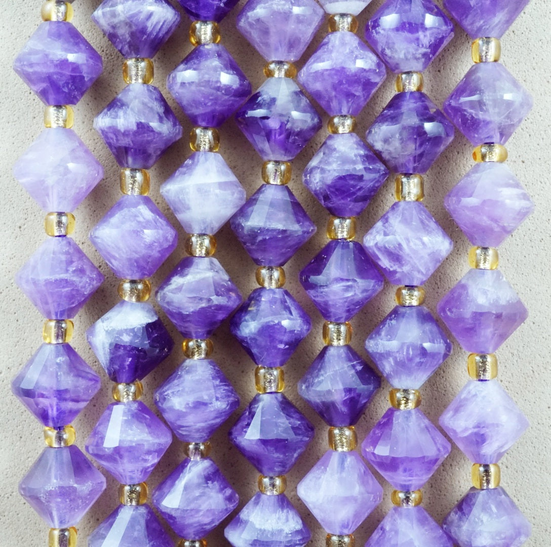 Chevron Amethyst is a natural combination of Amethyst and white Quartz, fused together to form a V banded pattern. These particular beads have been cut and polished into Faceted Bicone beads.