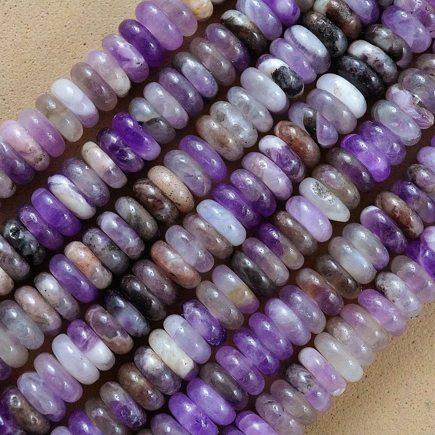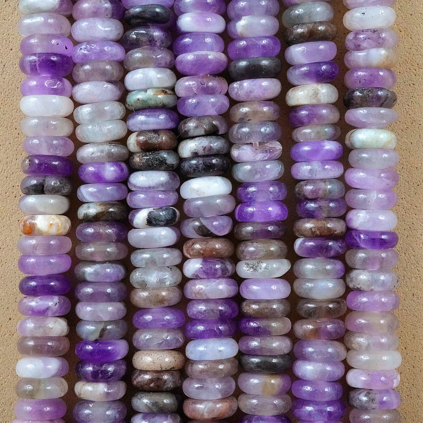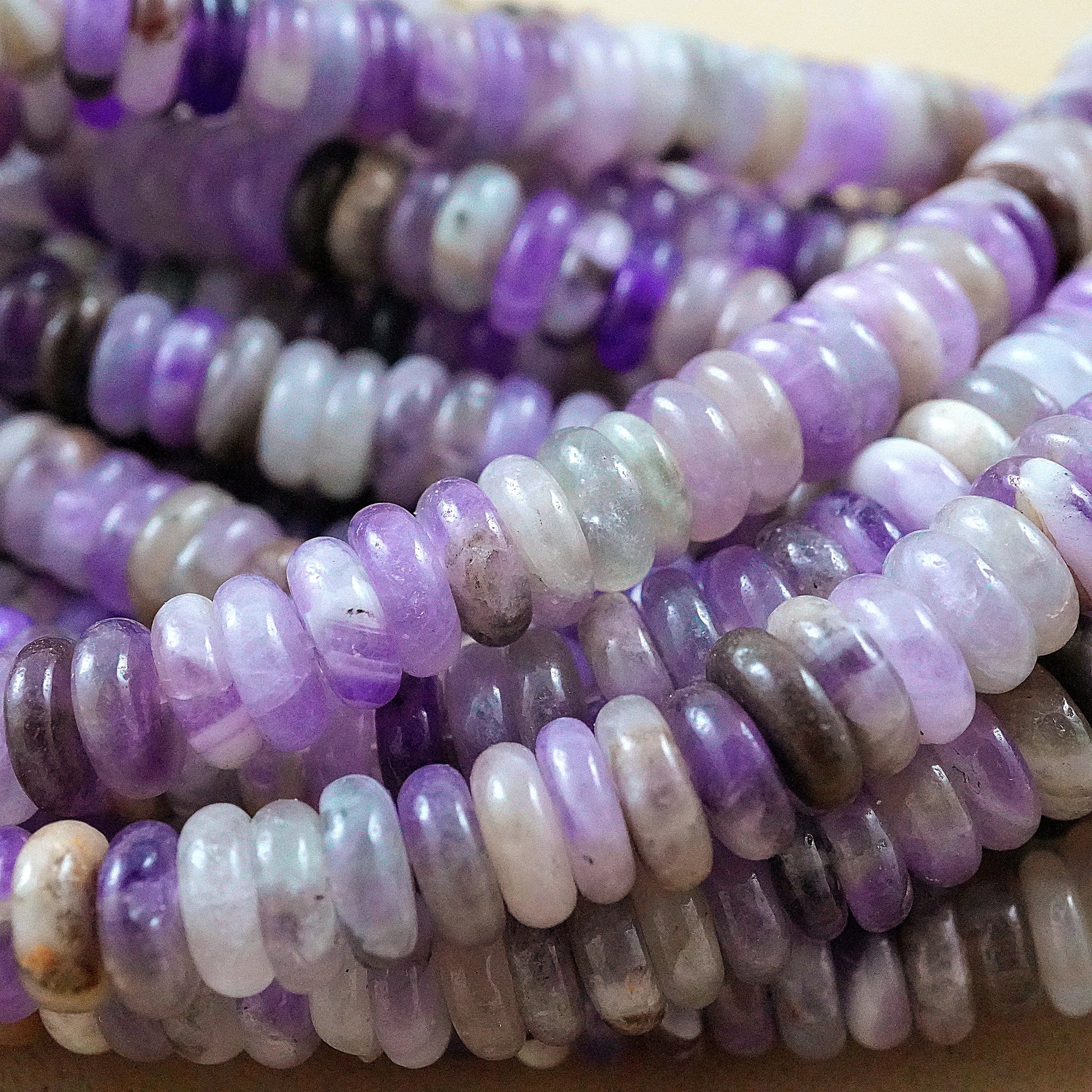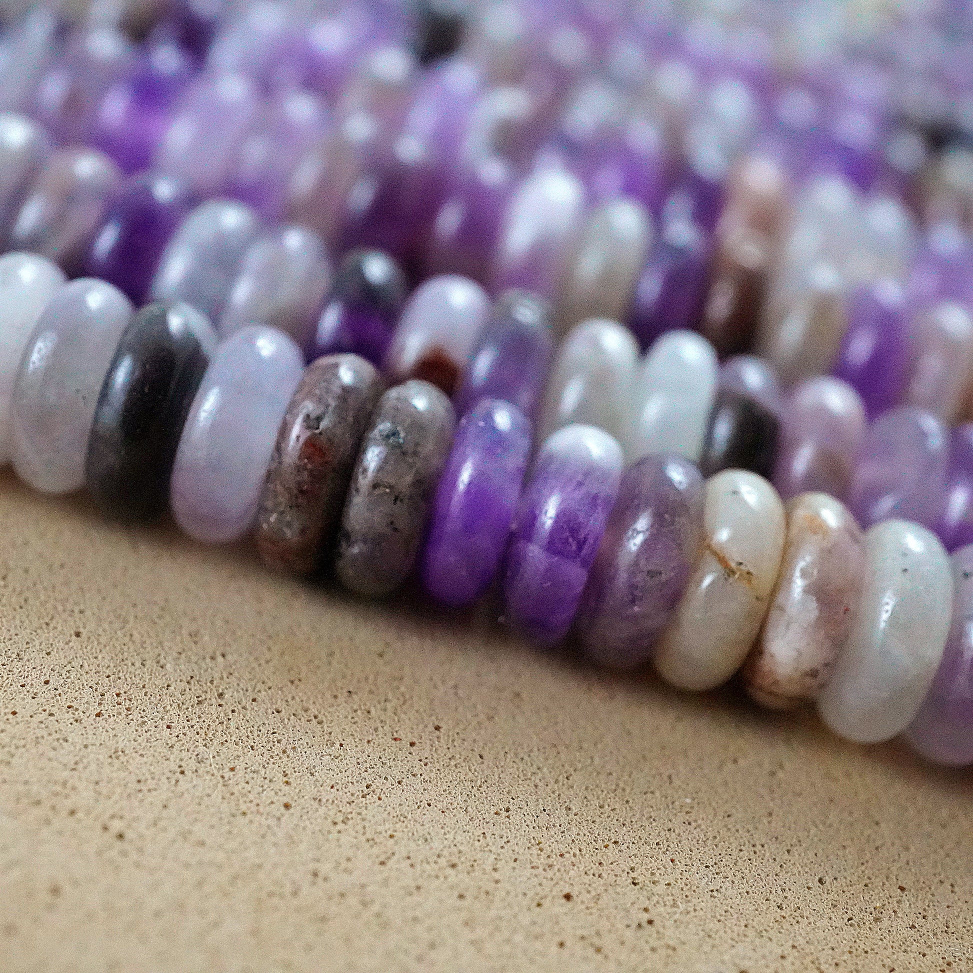 Thin Rondelle beads made out of Chevron Amethyst, known for their stunning purple and white banded pattern, are not only visually captivating but also prized for their healing properties. Chevron Amethyst is a combination of Amethyst and White Quartz, blending the calming energy of Amethyst with the amplifying qualities of Quartz, making it an excellent choice for jewelry making due to its aesthetic appeal and potential to enhance one's spiritual and mental clarity.