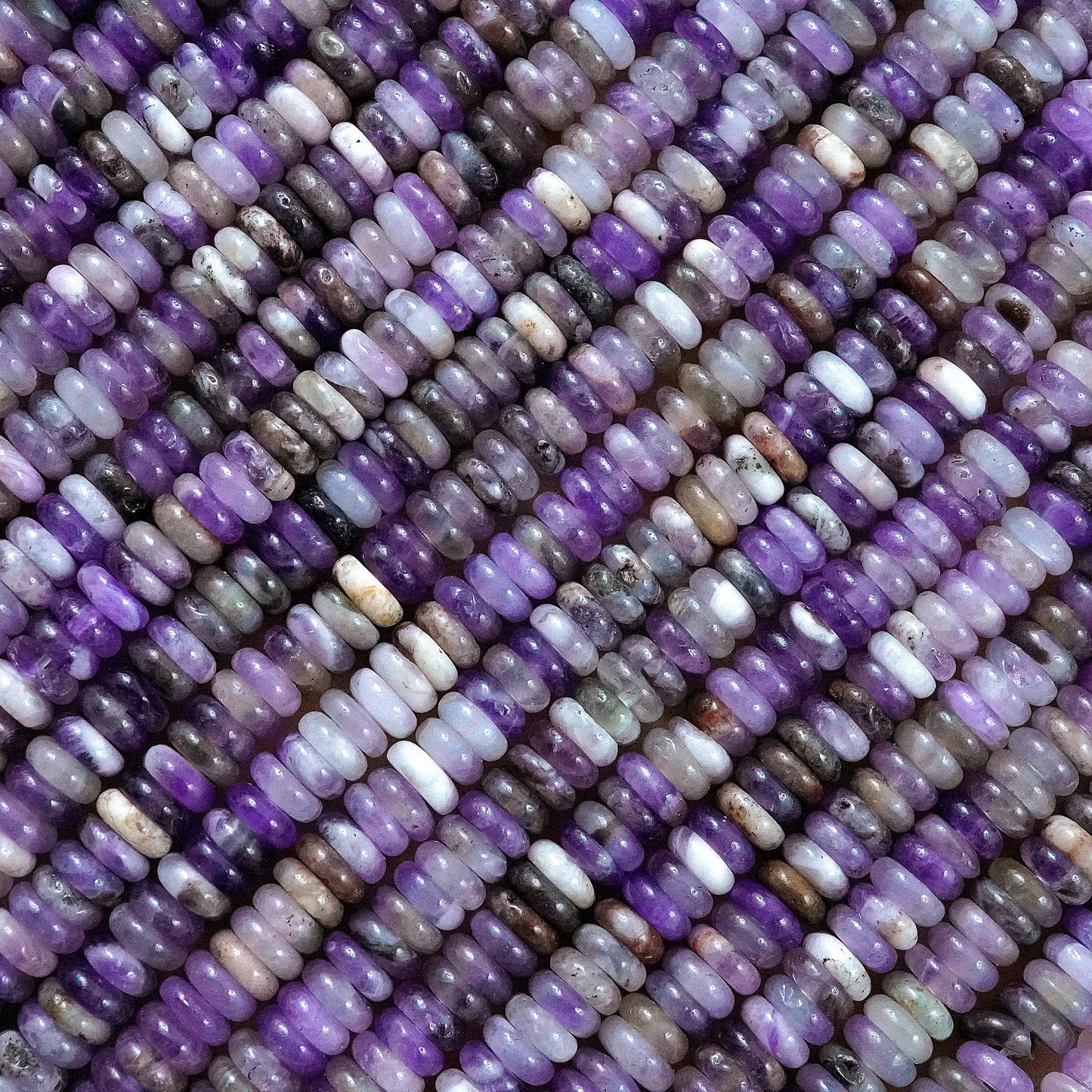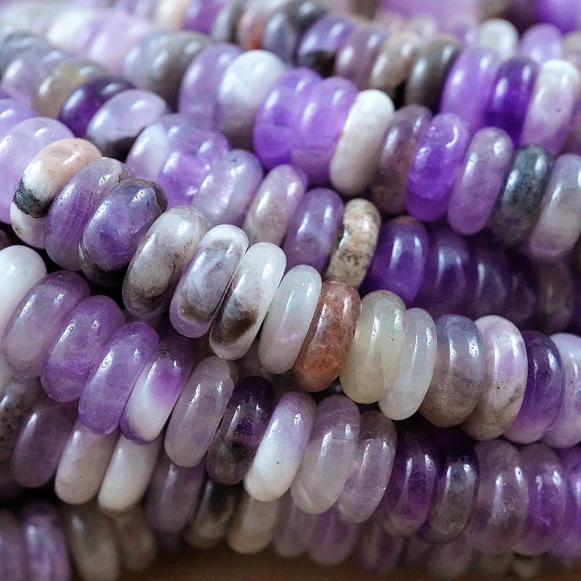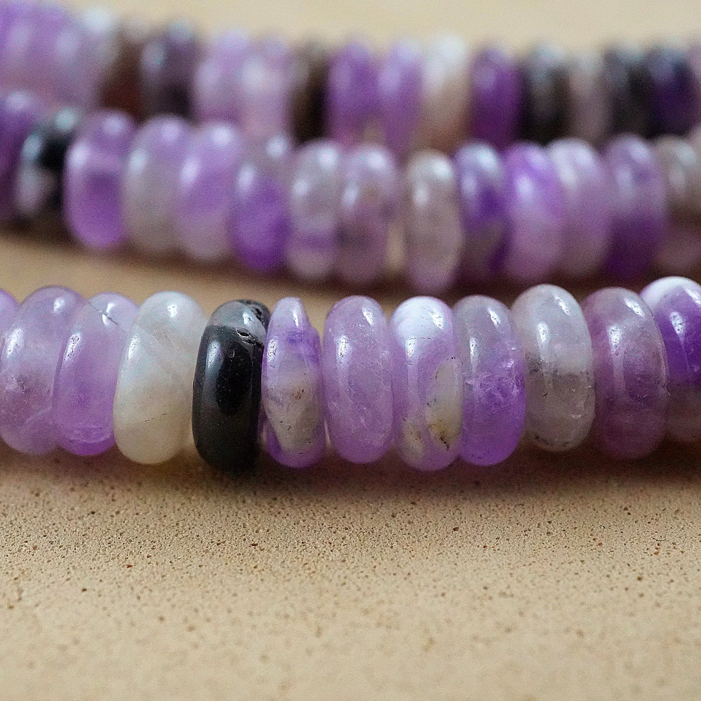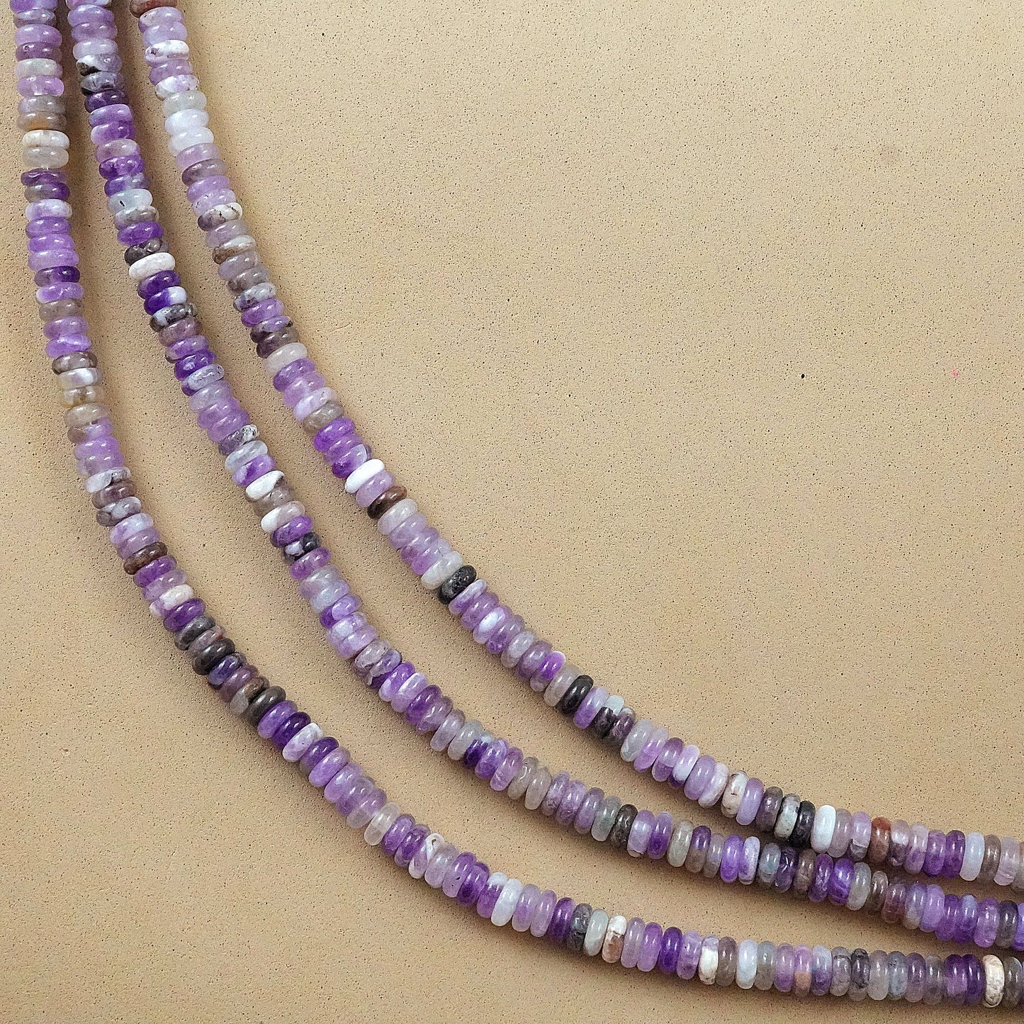 Thin Rondelle beads made out of Chevron Amethyst, known for their stunning purple and white banded pattern, are not only visually captivating but also prized for their healing properties. Chevron Amethyst is a combination of Amethyst and White Quartz, blending the calming energy of Amethyst with the amplifying qualities of Quartz, making it an excellent choice for jewelry making due to its aesthetic appeal and potential to enhance one's spiritual and mental clarity.