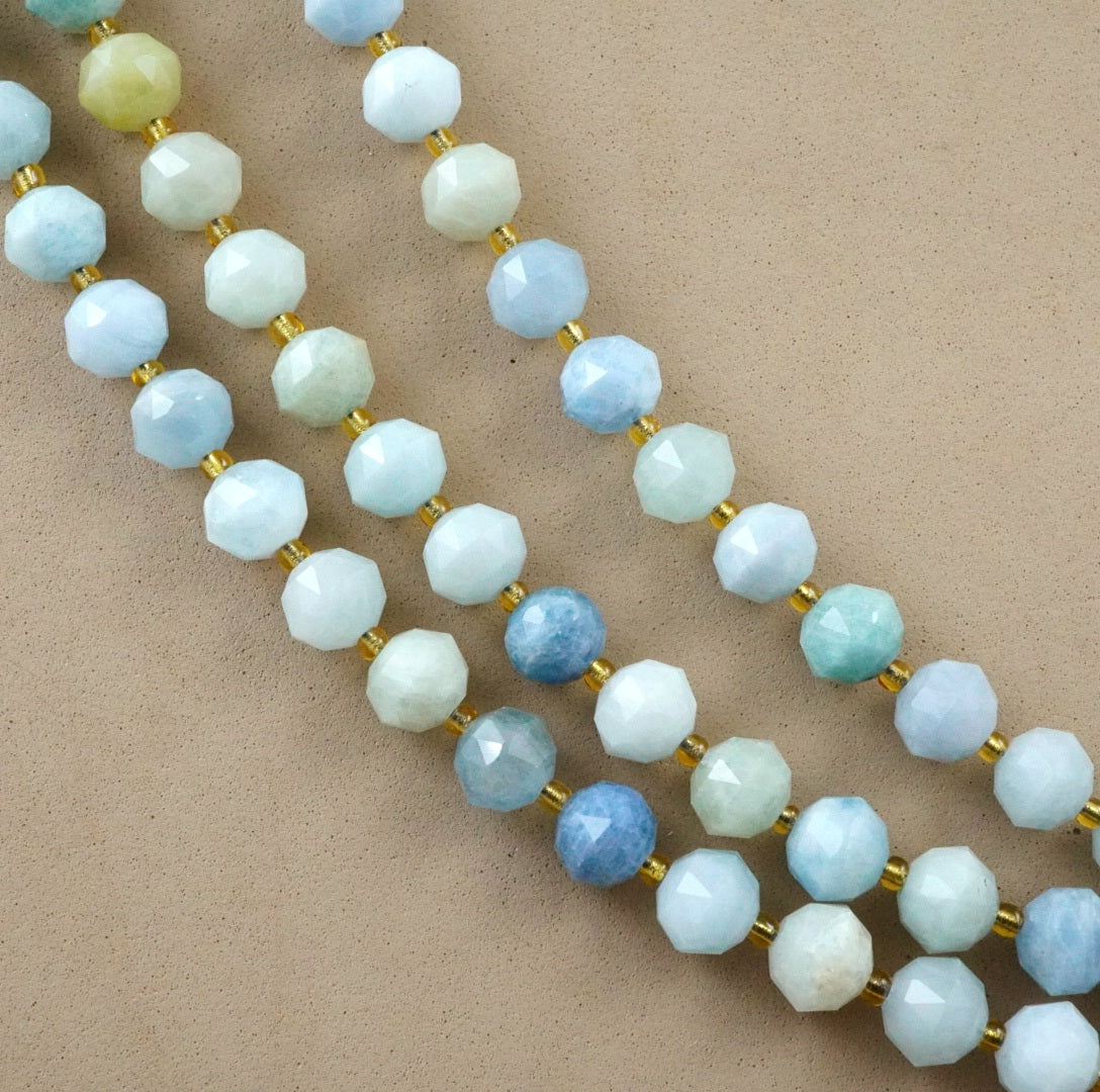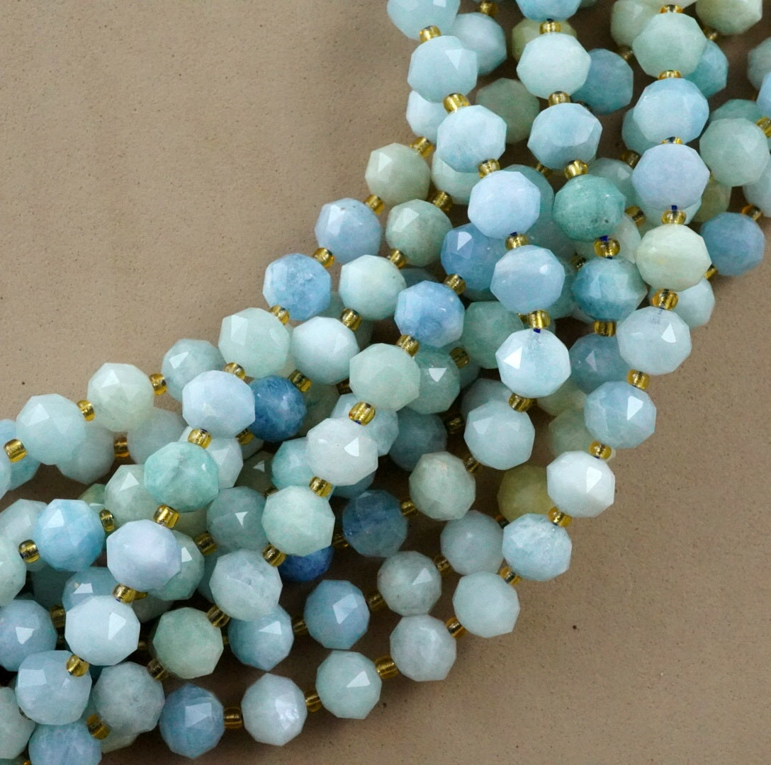 These particular beads have been cut and polished using a distinct style of faceting called, Triangle Faceting. This produces beautiful Triangular shaped facets on the beads, which in turn cause a greater reflection of light due to the larger surface area of the facets. Simply Amazing!