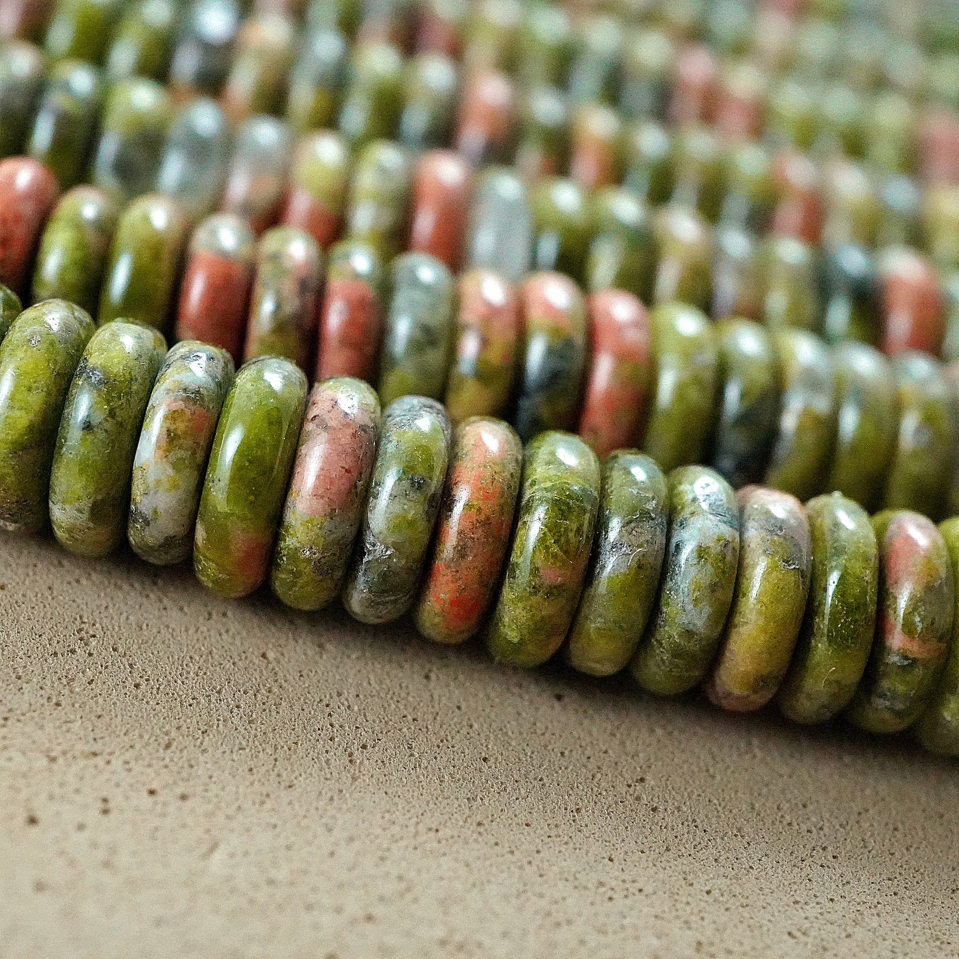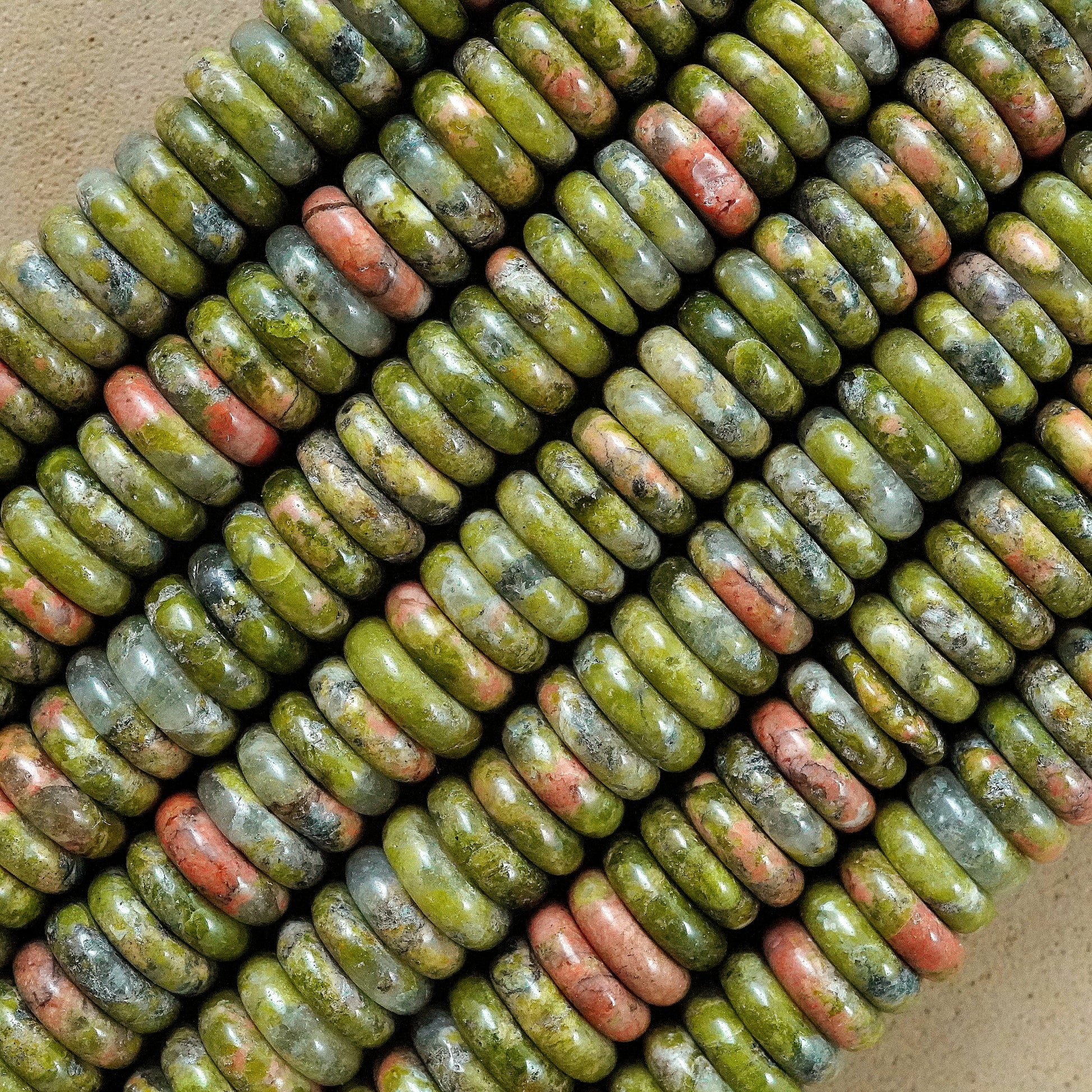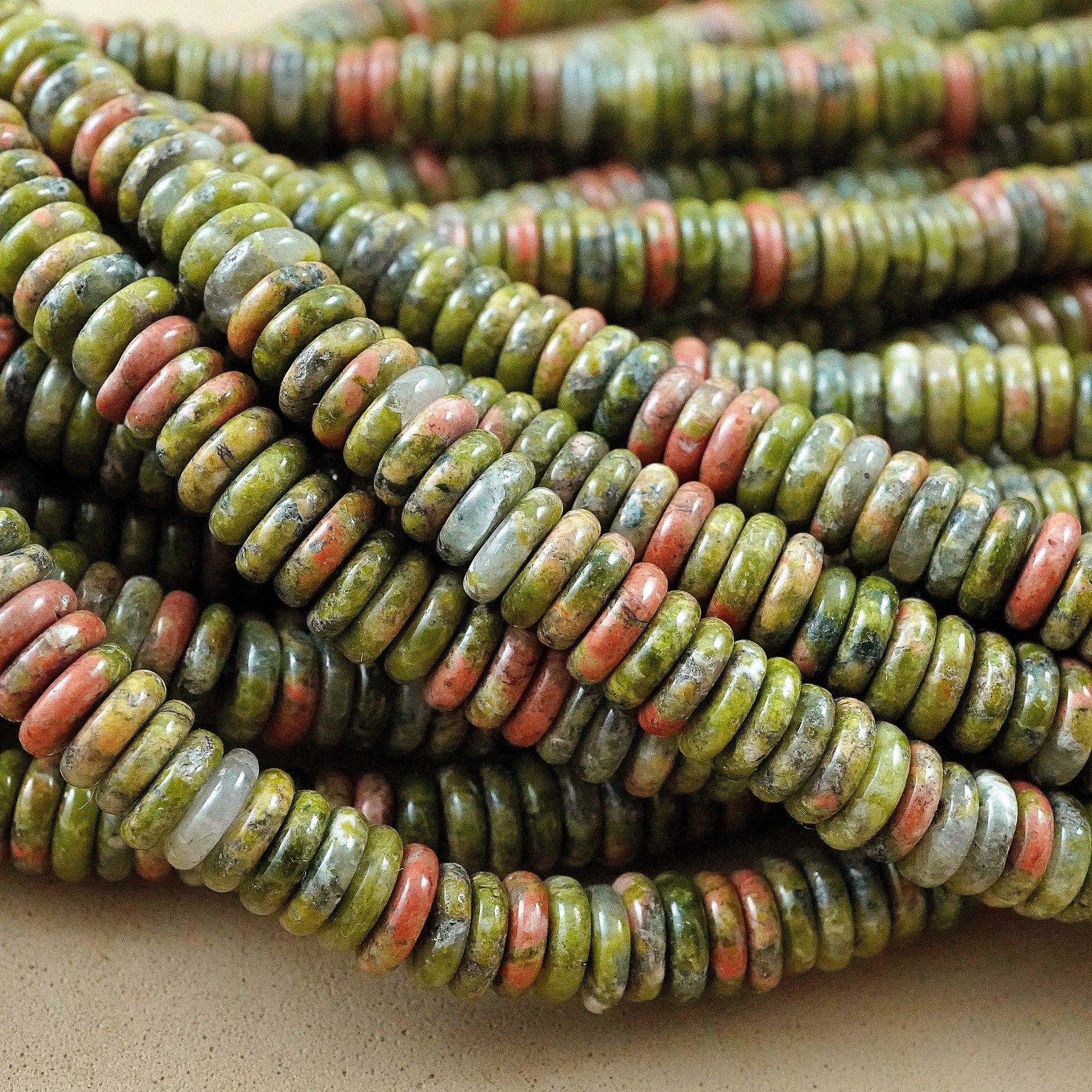 Rondelle beads crafted from Unakite, a unique metamorphic rock composed of pink feldspar, green epidote, and quartz, offer a distinctive blend of colors and natural patterns. Renowned for its harmonizing properties, Unakite is believed to balance emotions and enhance spiritual growth, making these beads not only aesthetically pleasing in jewelry but also meaningful for those seeking a connection with the stone's purported healing energies.