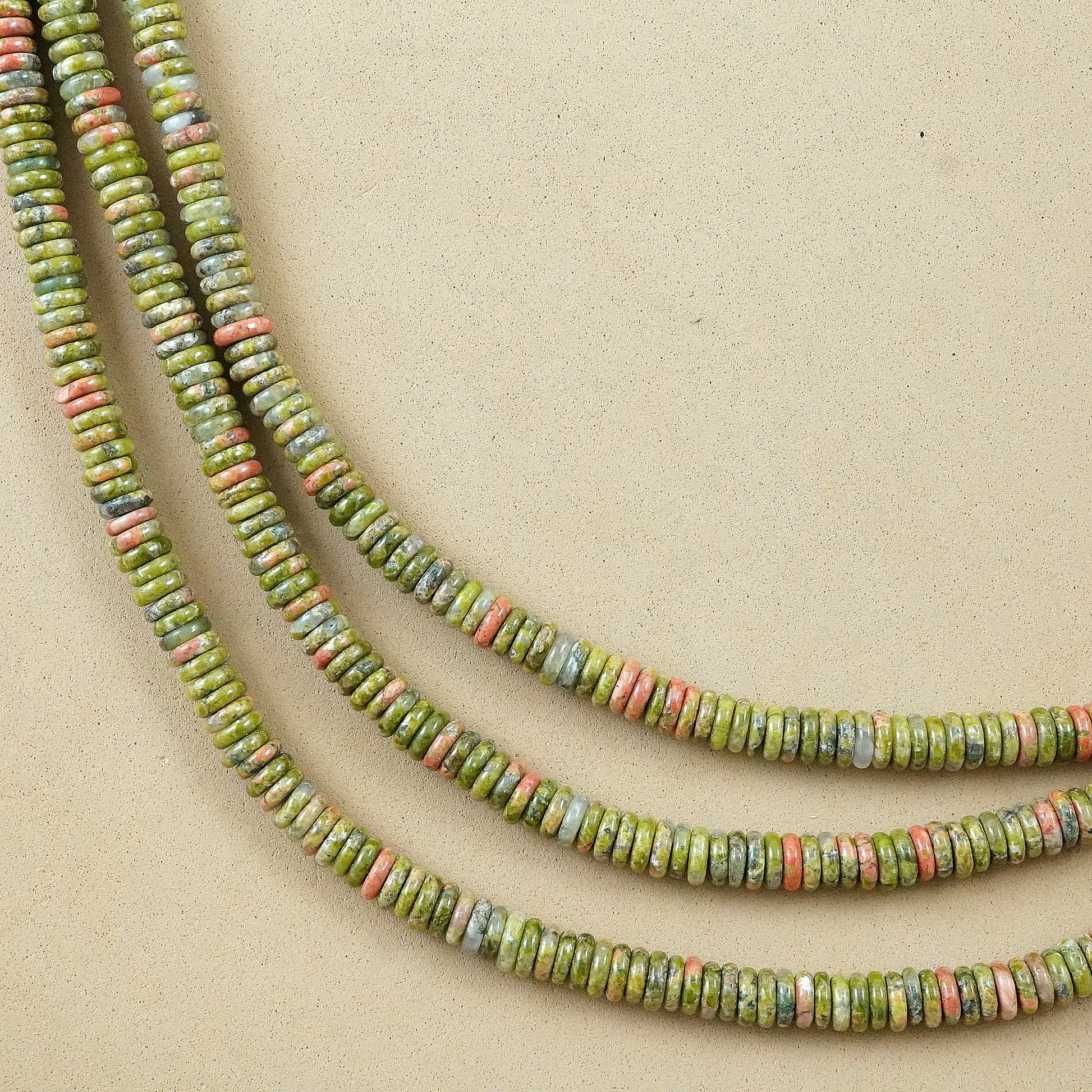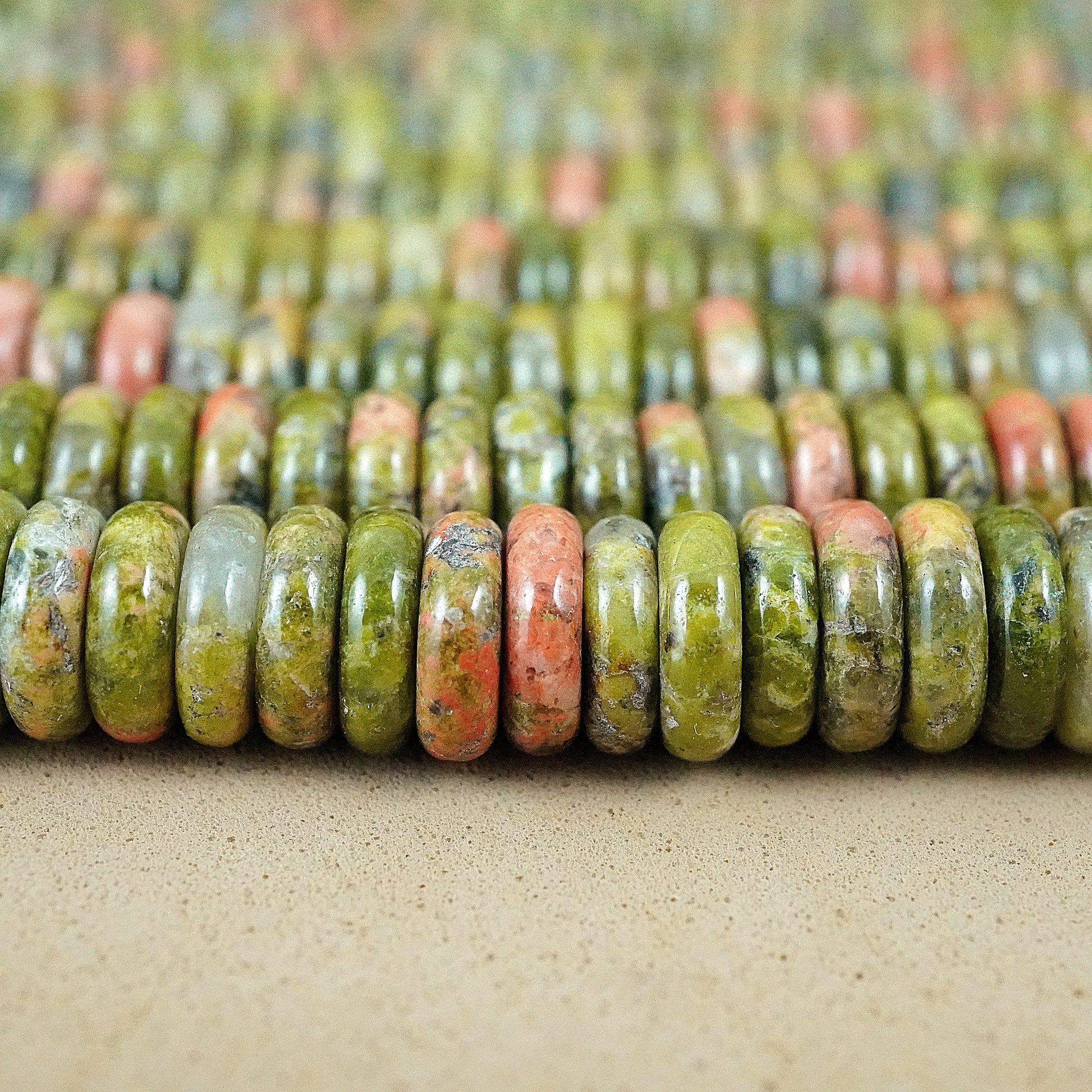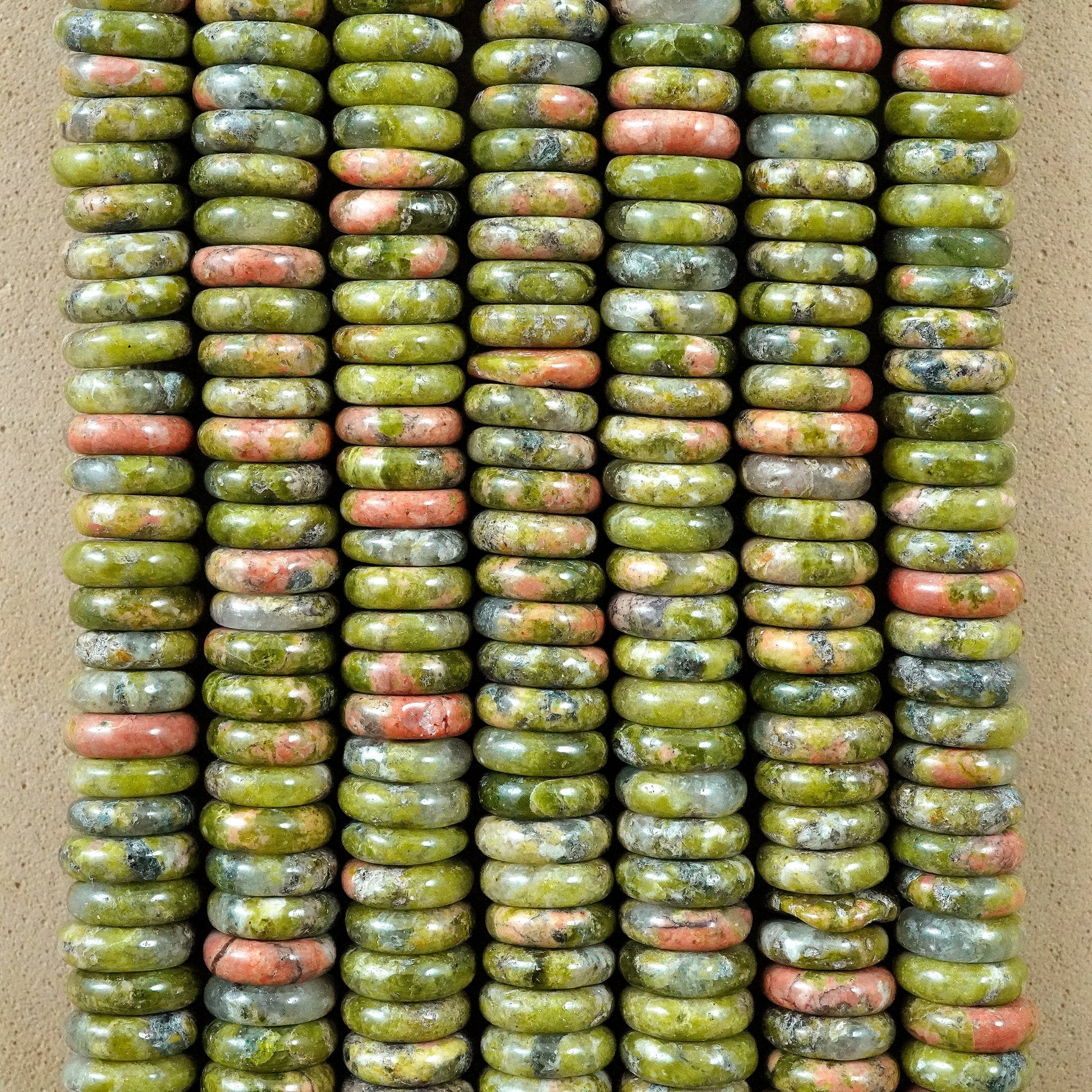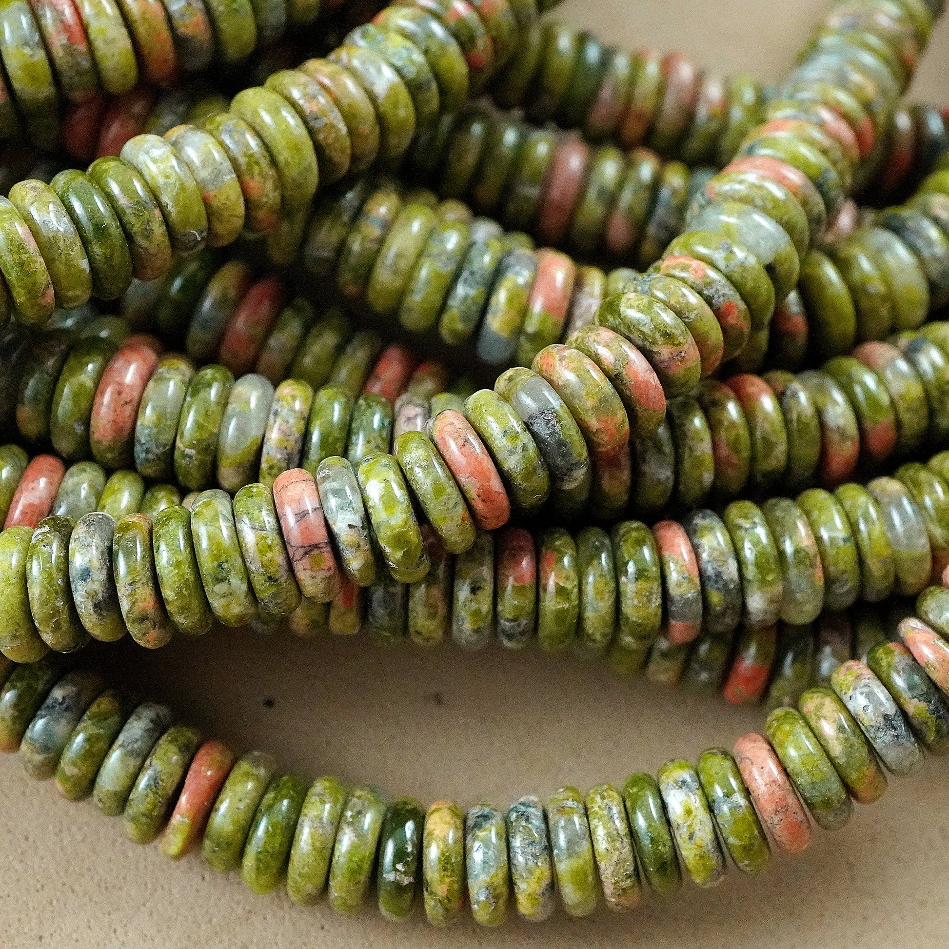 Rondelle beads crafted from Unakite, a unique metamorphic rock composed of pink feldspar, green epidote, and quartz, offer a distinctive blend of colors and natural patterns. Renowned for its harmonizing properties, Unakite is believed to balance emotions and enhance spiritual growth, making these beads not only aesthetically pleasing in jewelry but also meaningful for those seeking a connection with the stone's purported healing energies.