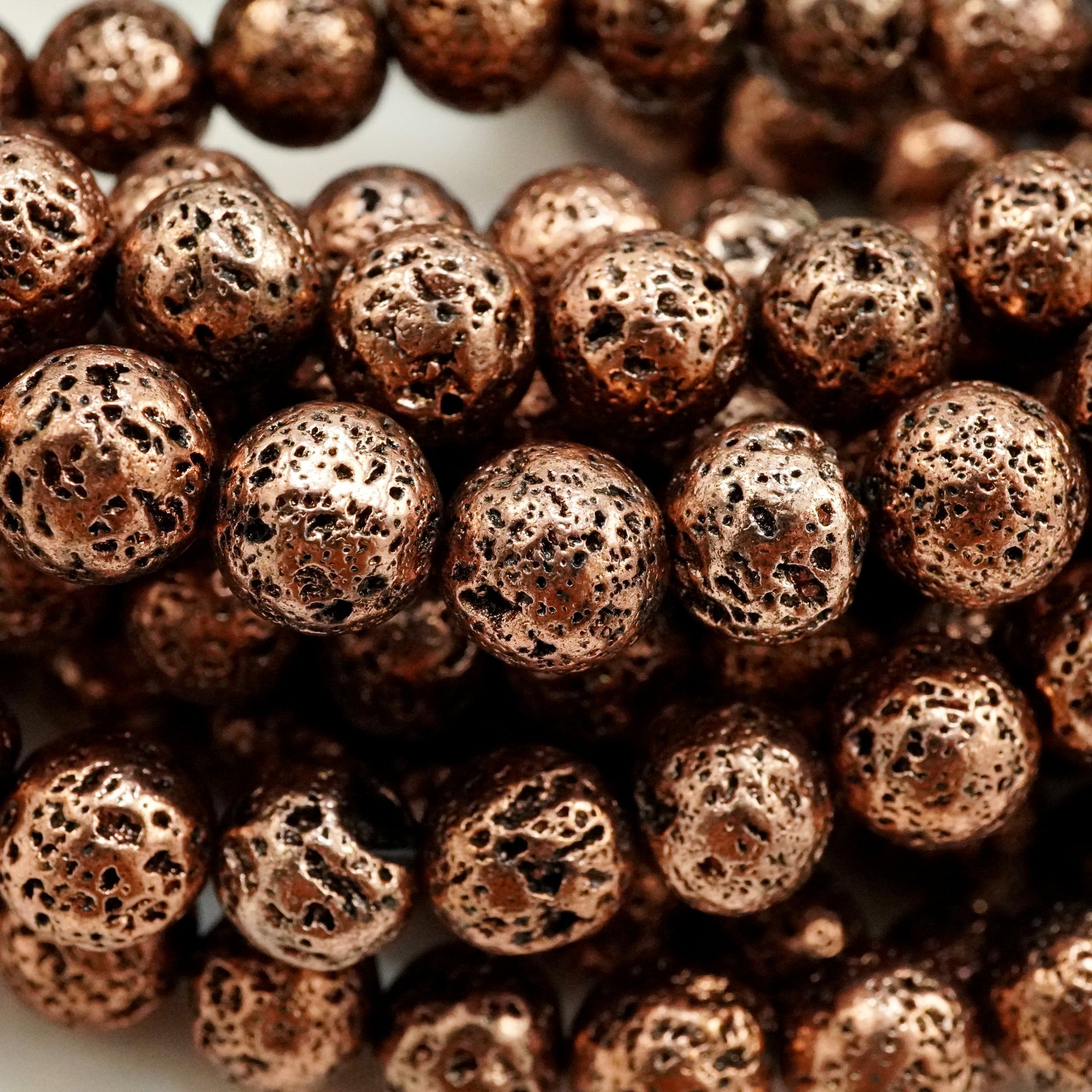 These Lava Beads have been electroplated with a metallic finish giving them an Antique Copper look. They are smooth to the touch yet their pores still remain visible. The metallic color of these beads make them excellent as spacers and as accents as they go well with various stone beads.