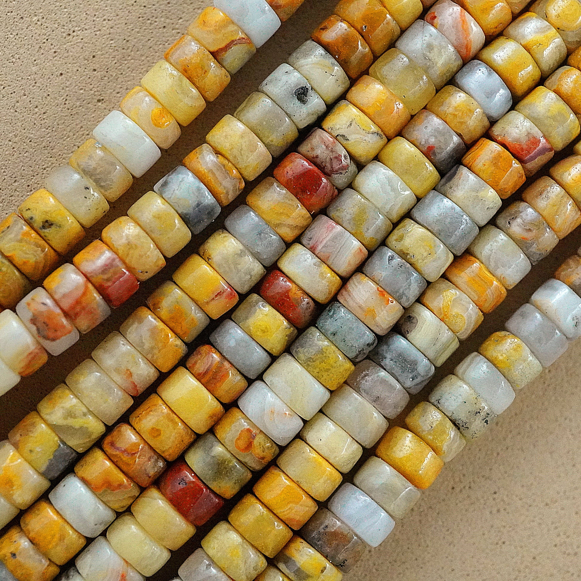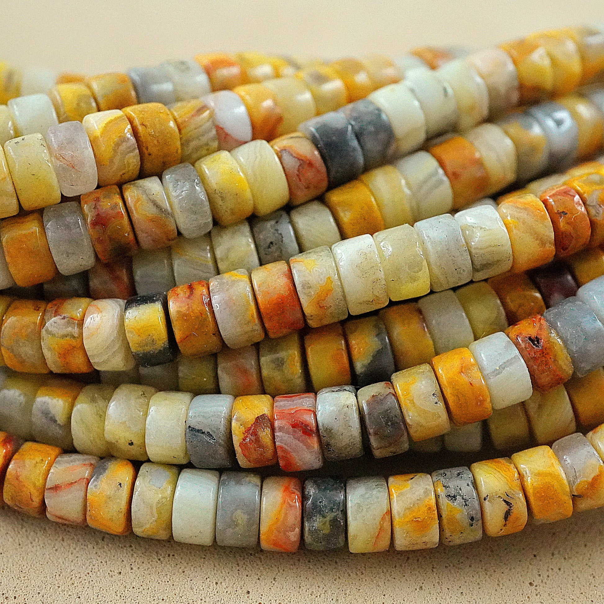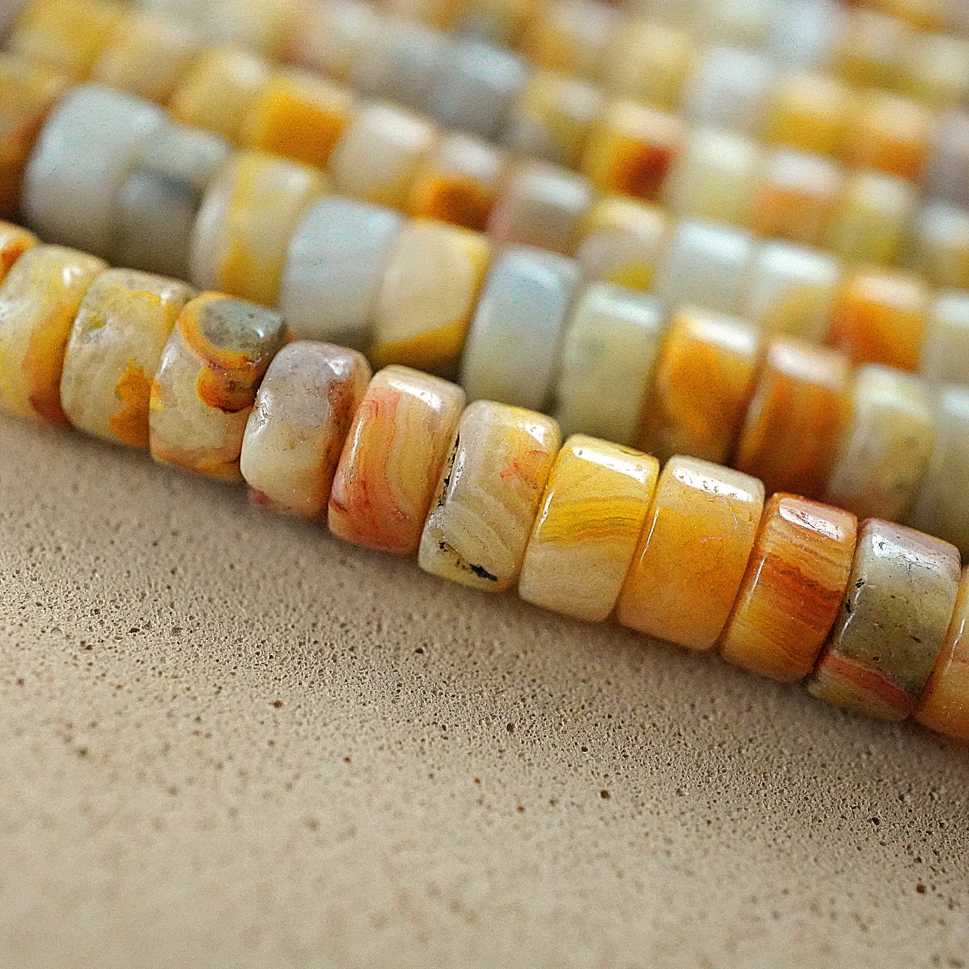 Crazy lace agate is a type of agate that is known for its intricate patterns and vibrant colors, ranging from white and grey to red, orange, and brown. It is primarily composed of silica and is found in Mexico. When cut into heishe beads, crazy lace agate reveals its mesmerizing patterns and color variations, which make it a popular choice for jewelry making. The unique patterns of crazy lace agate resemble a beautifully abstract painting, and its varied hues add depth and character to any piece of jewelry. Its natural beauty and versatile appearance make it a highly sought-after gemstone in the jewelry industry.