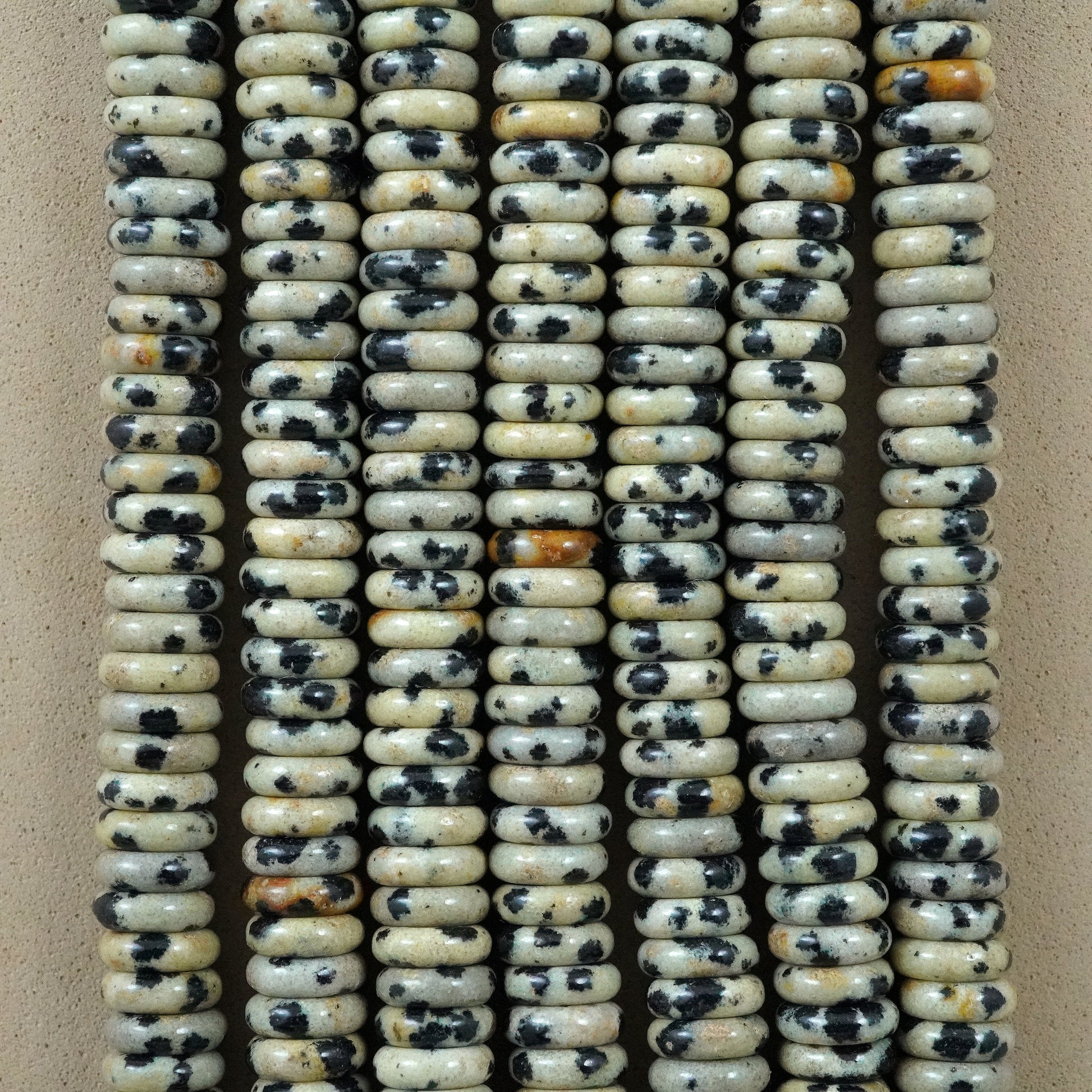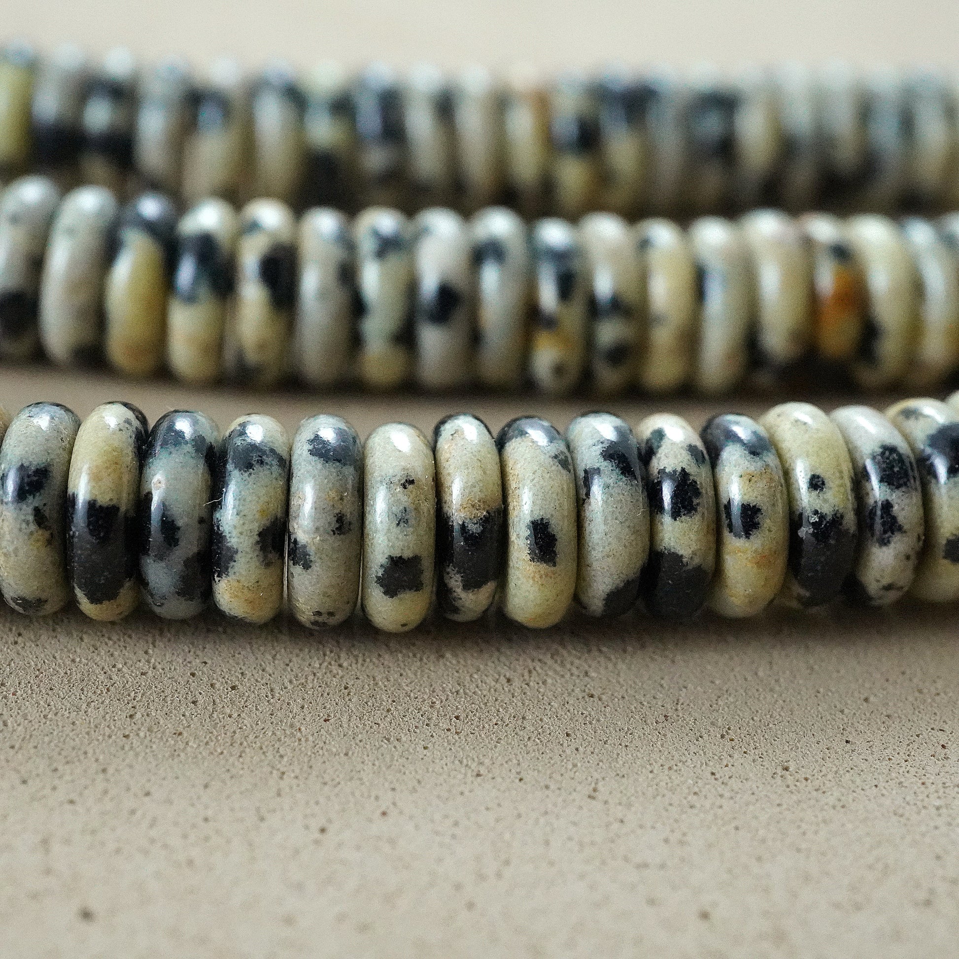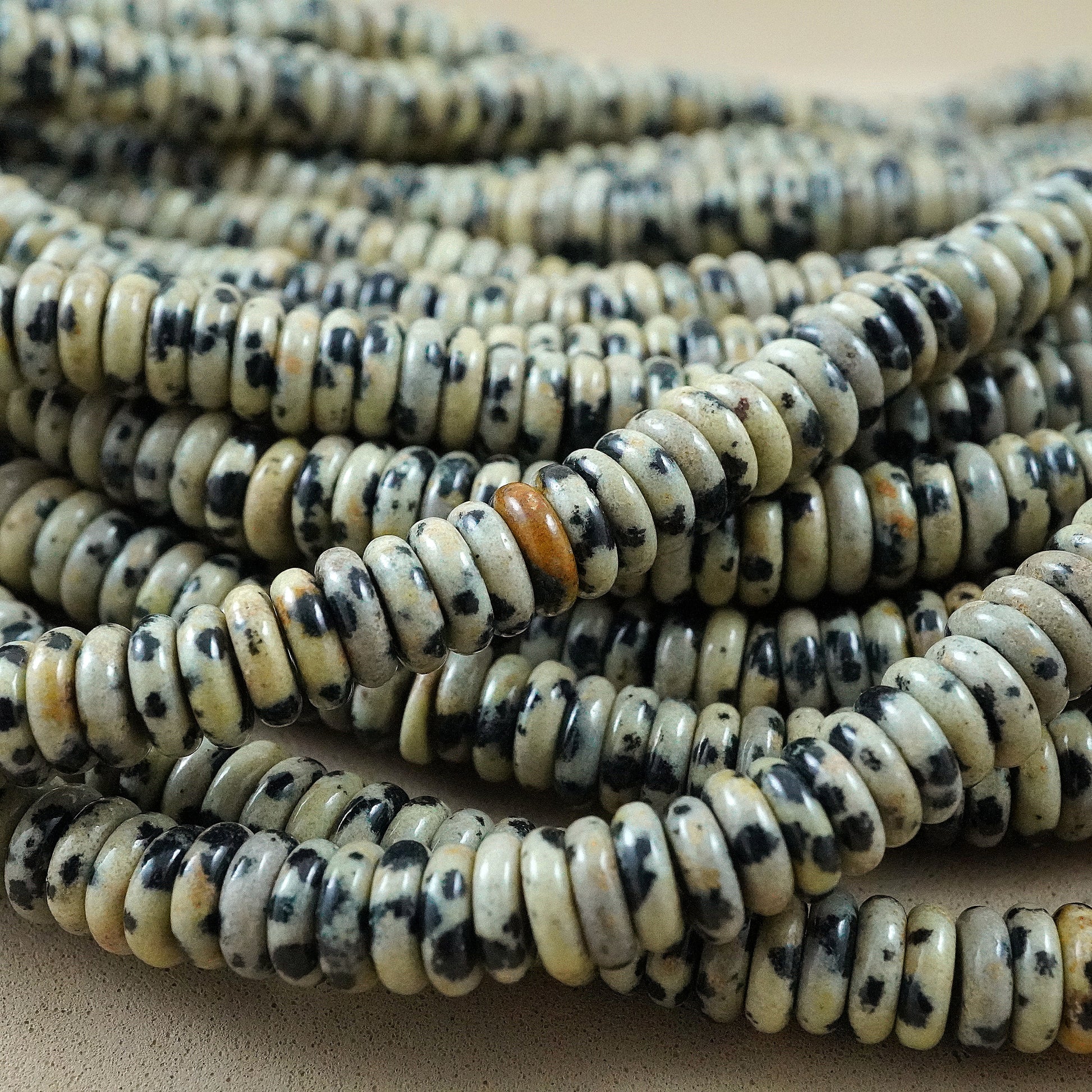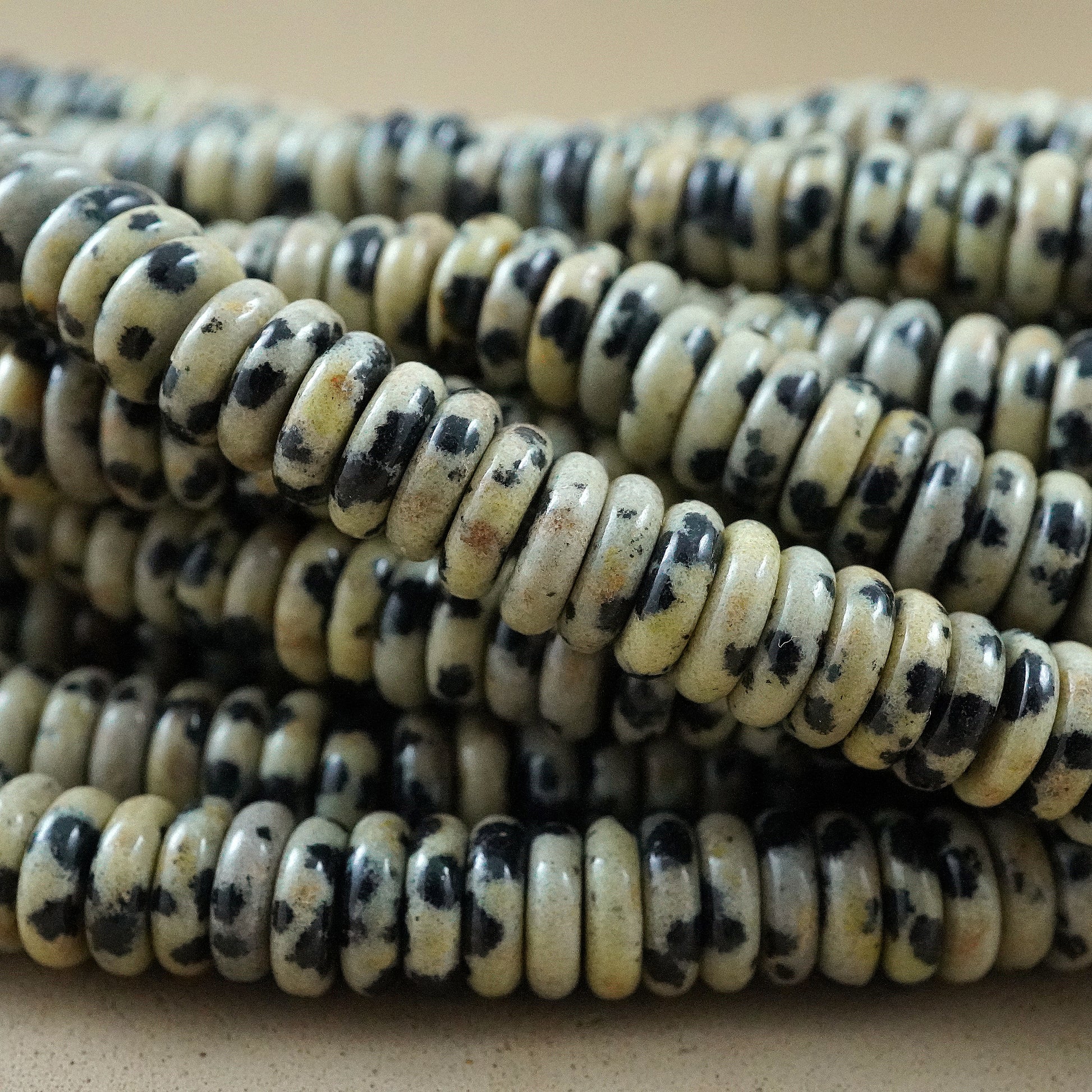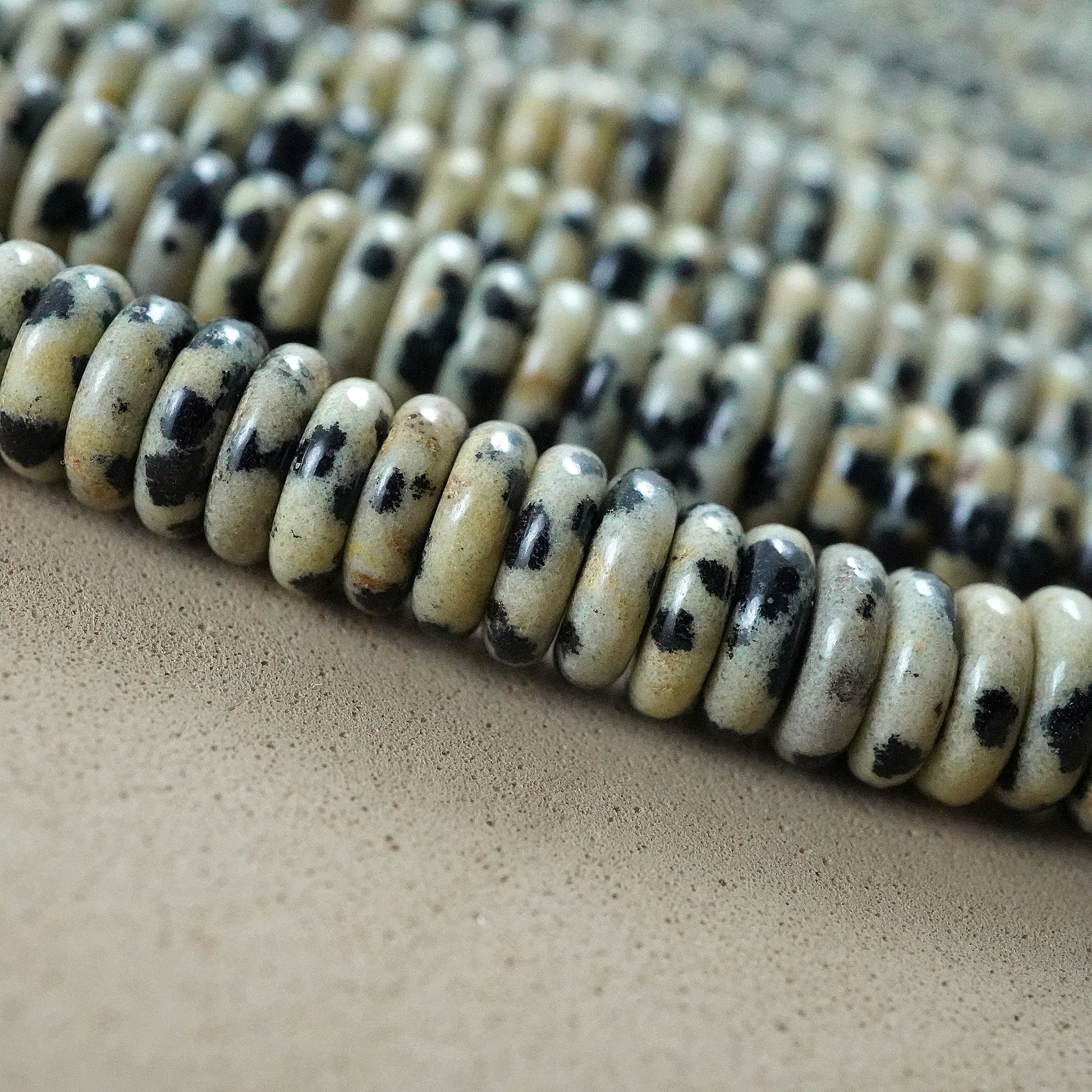 Rondelle beads crafted from Dalmatian Jasper, renowned for its distinctive speckled appearance reminiscent of the famous canine breed, not only add a touch of natural elegance to jewelry but also harness the stone's reputed properties of grounding and fostering a sense of joy. This unique gemstone, known for its combination of creamy beige and black spots, is believed to promote emotional balance and enhance creativity, making Dalmatian Jasper rondelles not only aesthetically appealing but also spiritually meaningful in the realm of jewelry making.