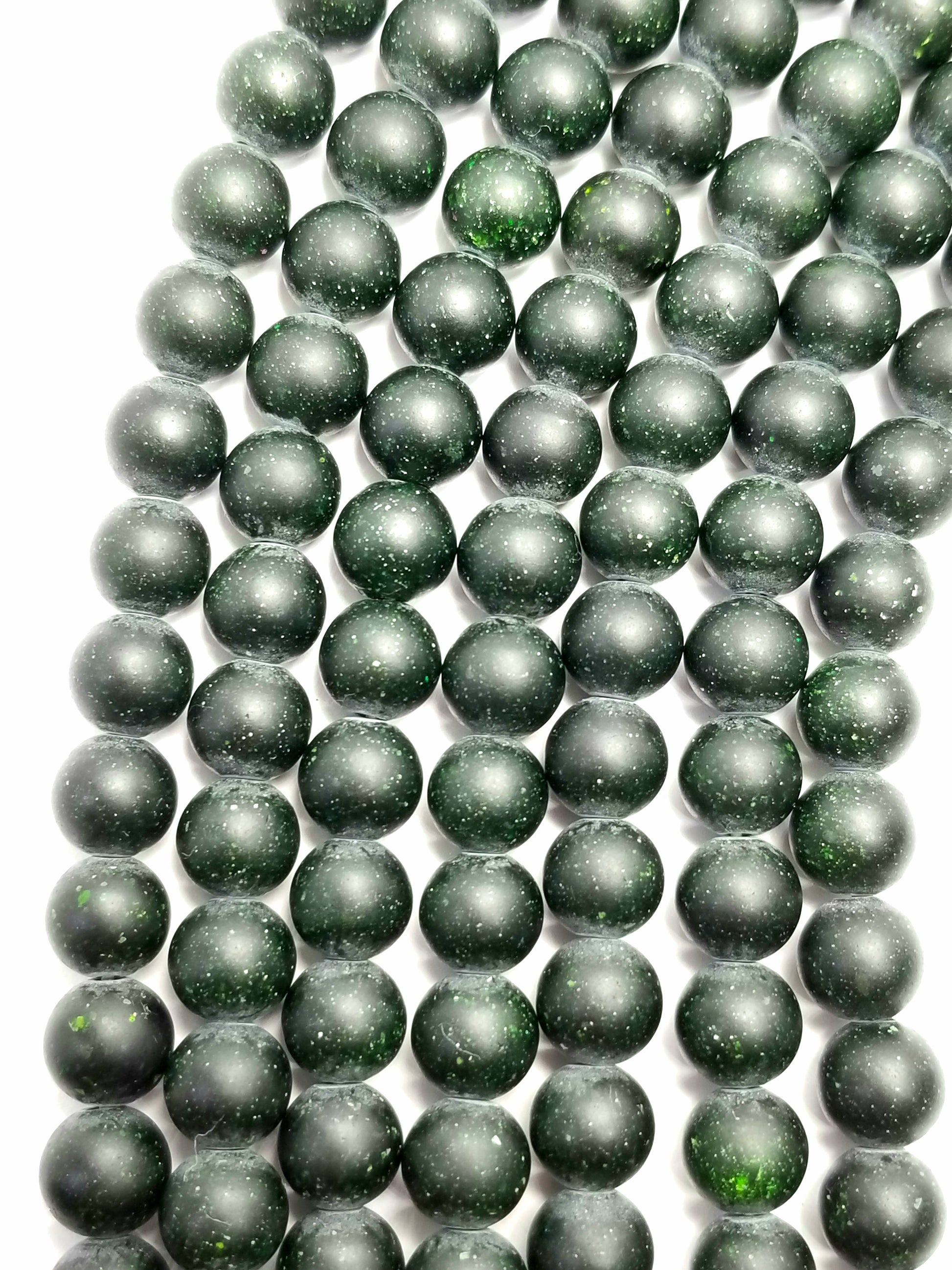 Green Goldstone is the dark green variation of Goldstone. Like Goldstone, it is made of glass infused with copper particles. The change of color is the result of adding Chromium to the mixing process.
