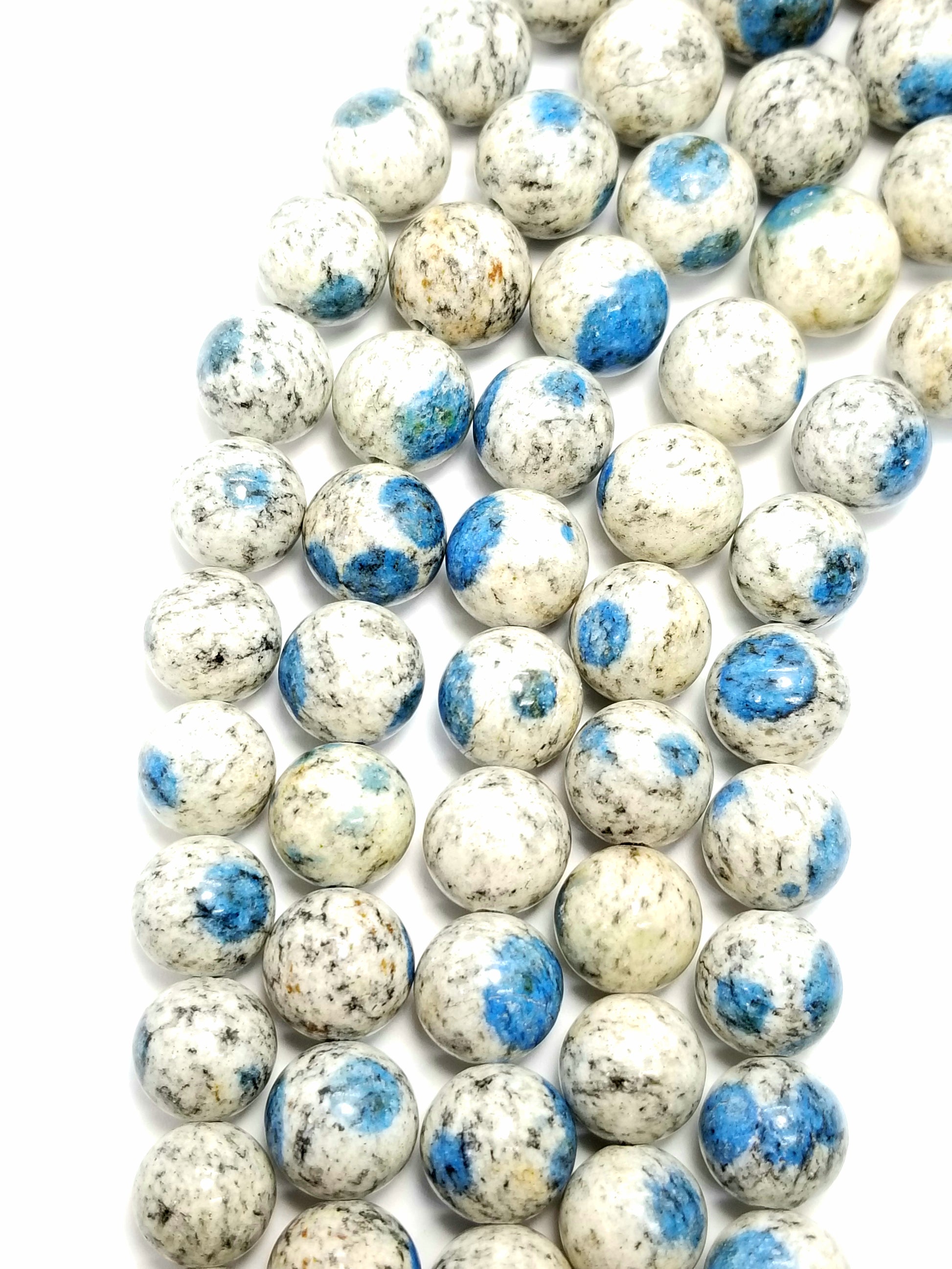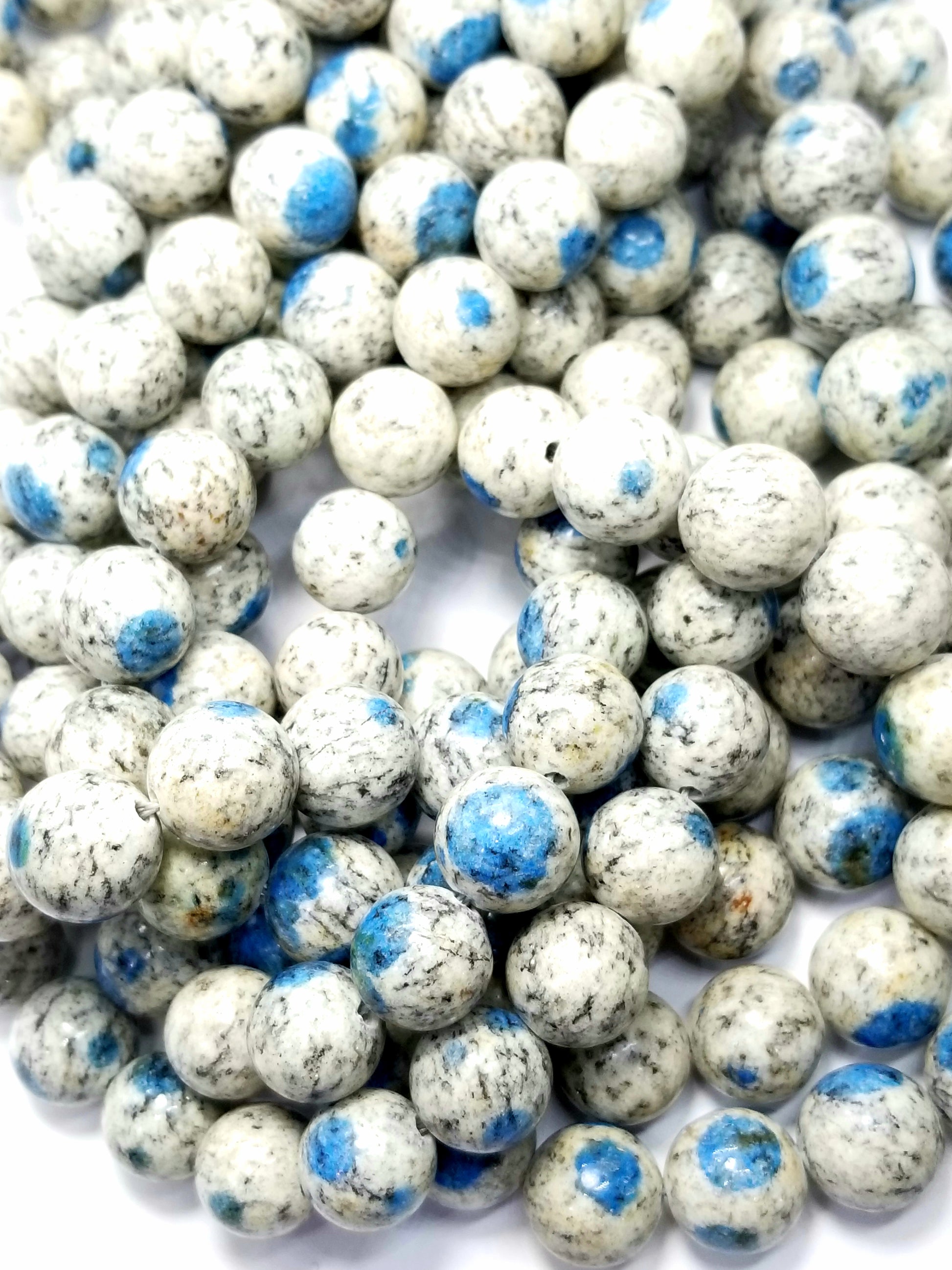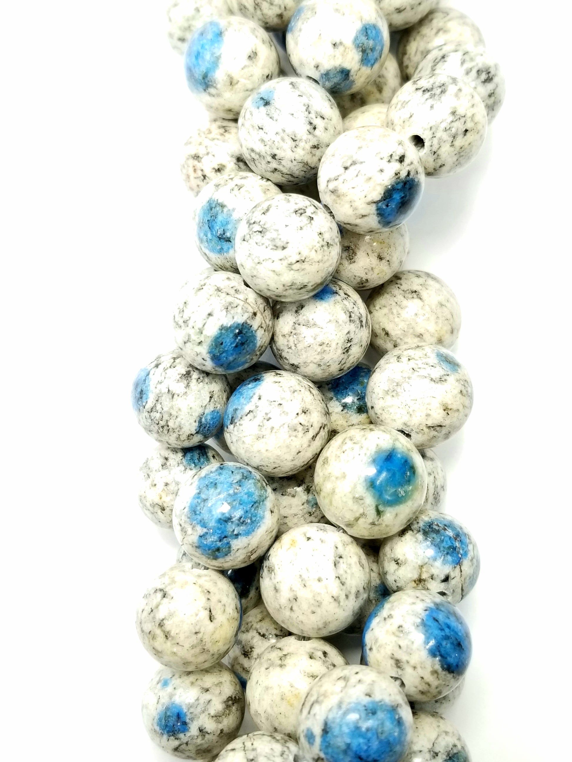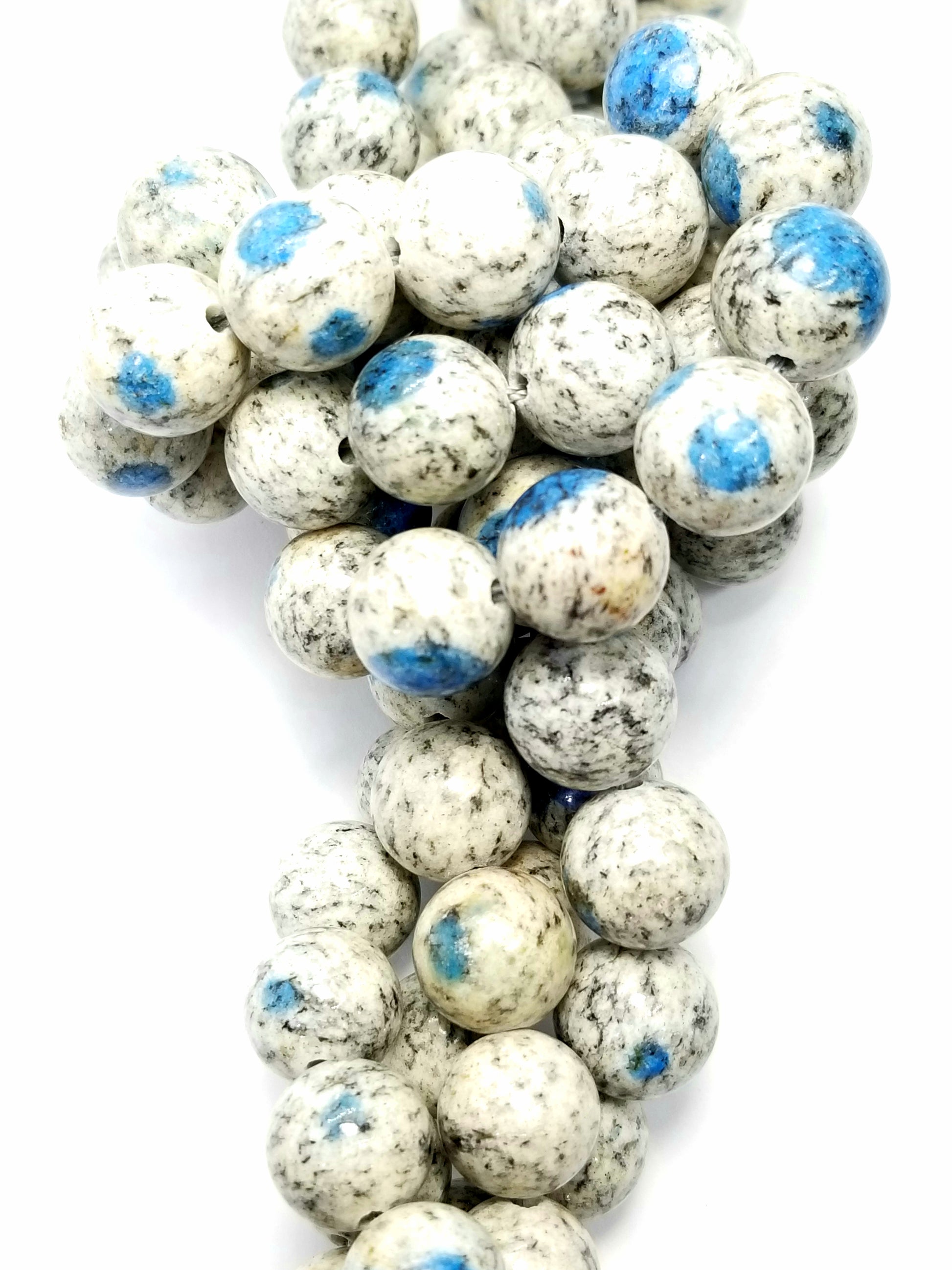 K2 Granite is a rare stone mined near the base of the second tallest mountain in the world, the K2 Mountain. It is made of a white granite base with blue patches of Azurite naturally stained onto the stone. Since these beads are graduated, they are basically ready to be worn.