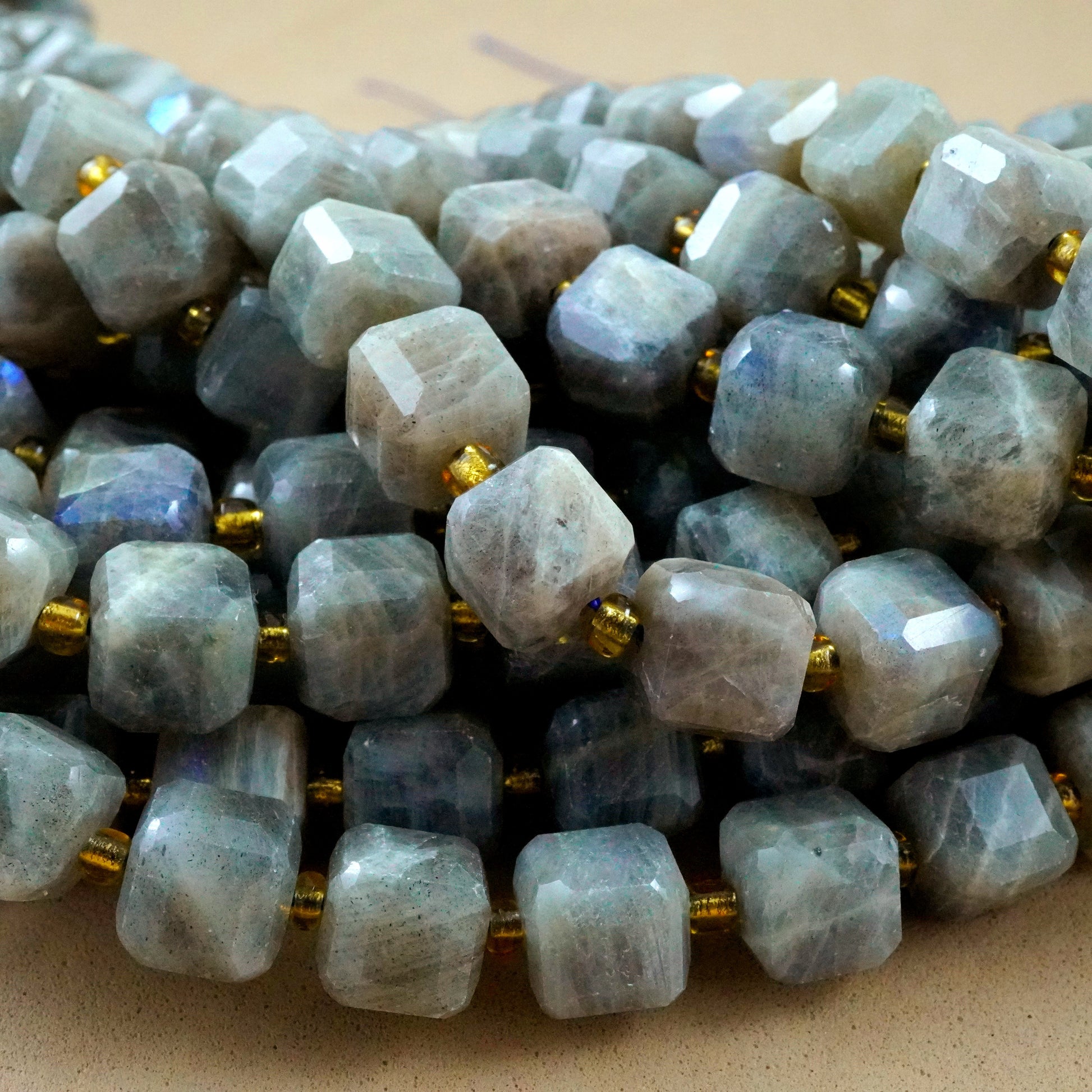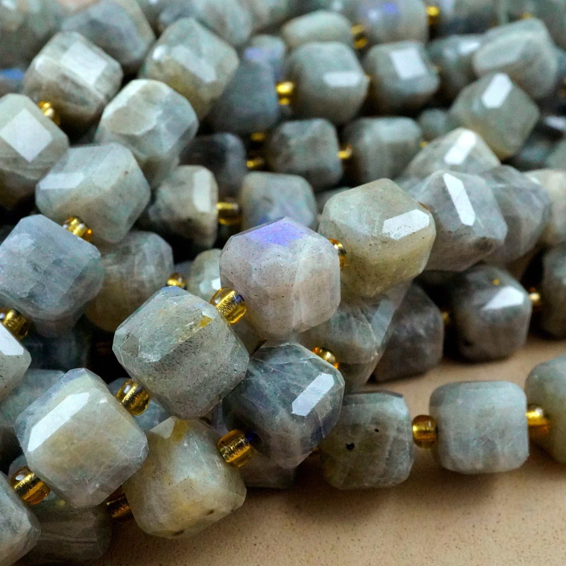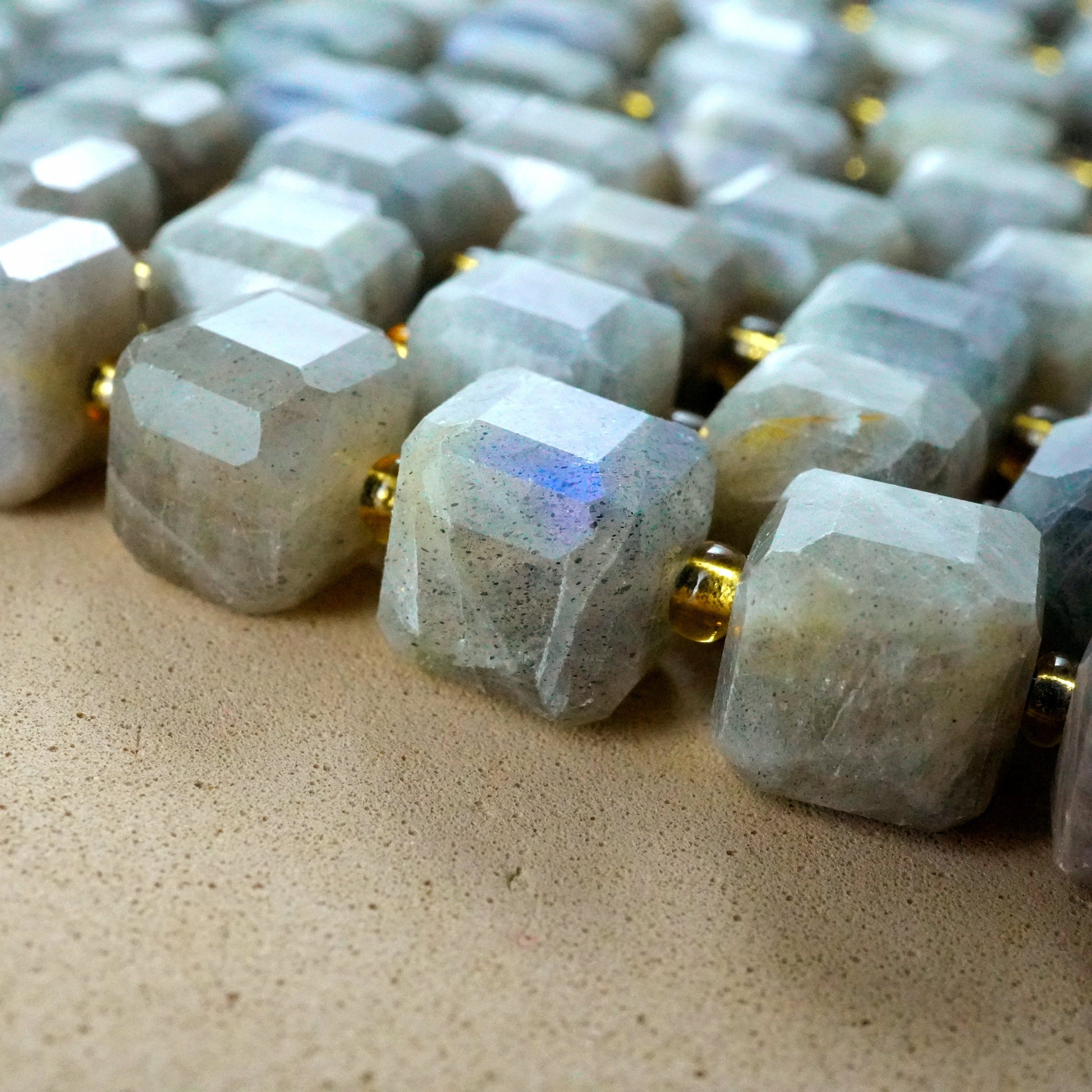 Labradorite is a mesmerizing gemstone that is known for its iridescent play of colors, which range from blues and greens to yellows and oranges. When cut into faceted cube beads, it creates a unique and captivating effect that makes it an excellent choice for jewelry designs. The cube-shaped facets of the labradorite beads reflect and refract light in an intricate and fascinating way, bringing out the stone's natural beauty and adding depth and dimension to any piece of jewelry. Whether used as a focal point or as an accent stone, labradorite in faceted cube bead form is sure to create a striking and memorable look that will turn heads and spark conversation.