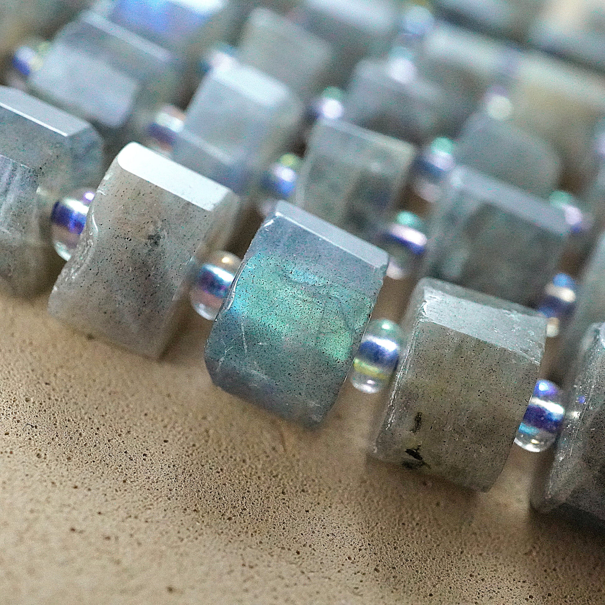 Labradorite is a beautiful Gray stone with a colorful Labradorescence. These beads are cut in a unique form. They are traditional Heishe style beads, but the sides have been faceted to enhance its look. Simply Amazing!