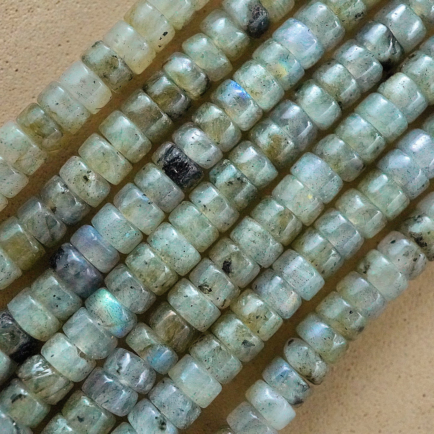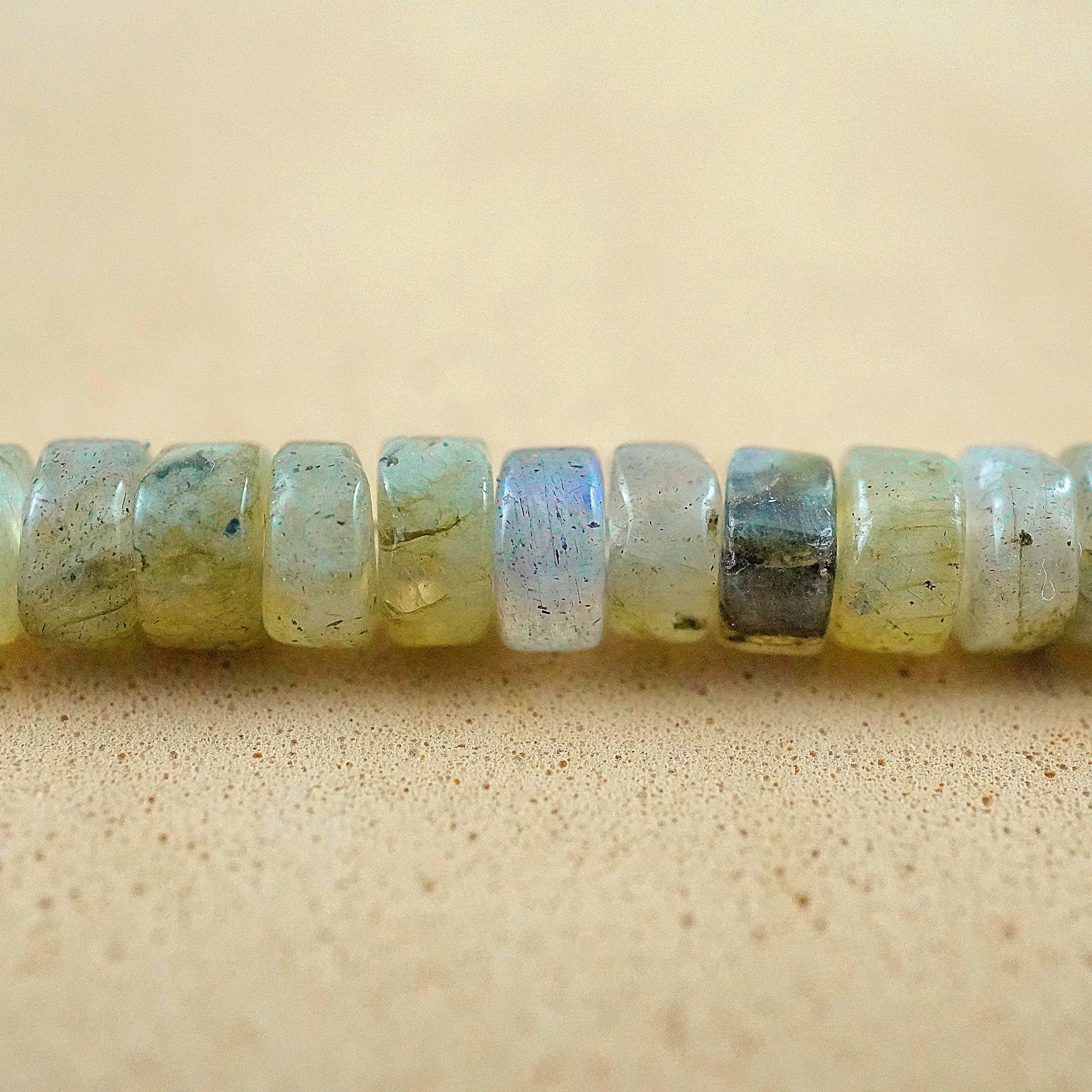 Labradorite is a type of feldspar found worldwide that displays a mesmerizing iridescence called "labradorescence". When cut into small heishe beads, Labradorite showcases its unique flashes of blue, green, and gold. The smooth surface of the beads adds to its mystical appearance, making it a highly prized gemstone in the jewelry industry.