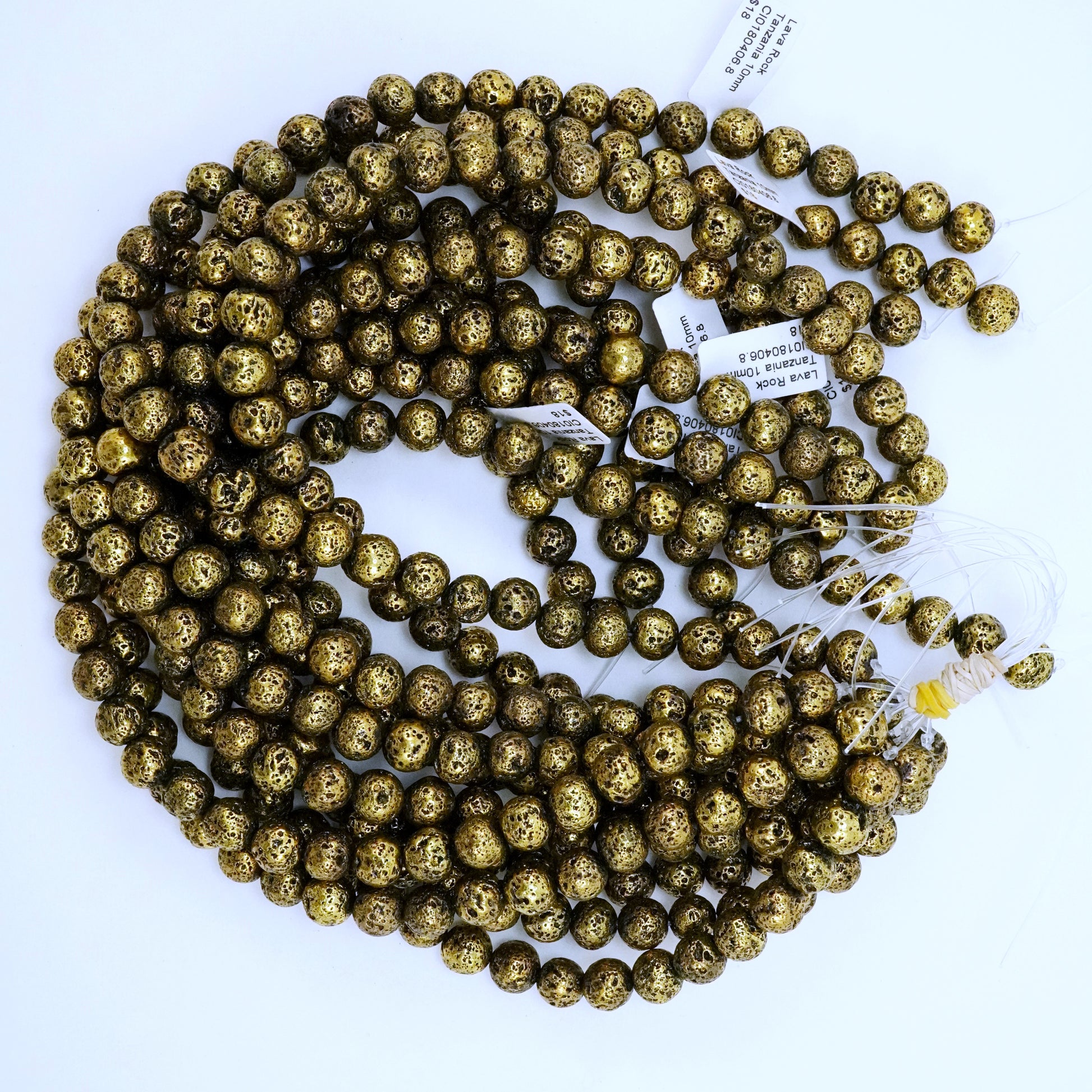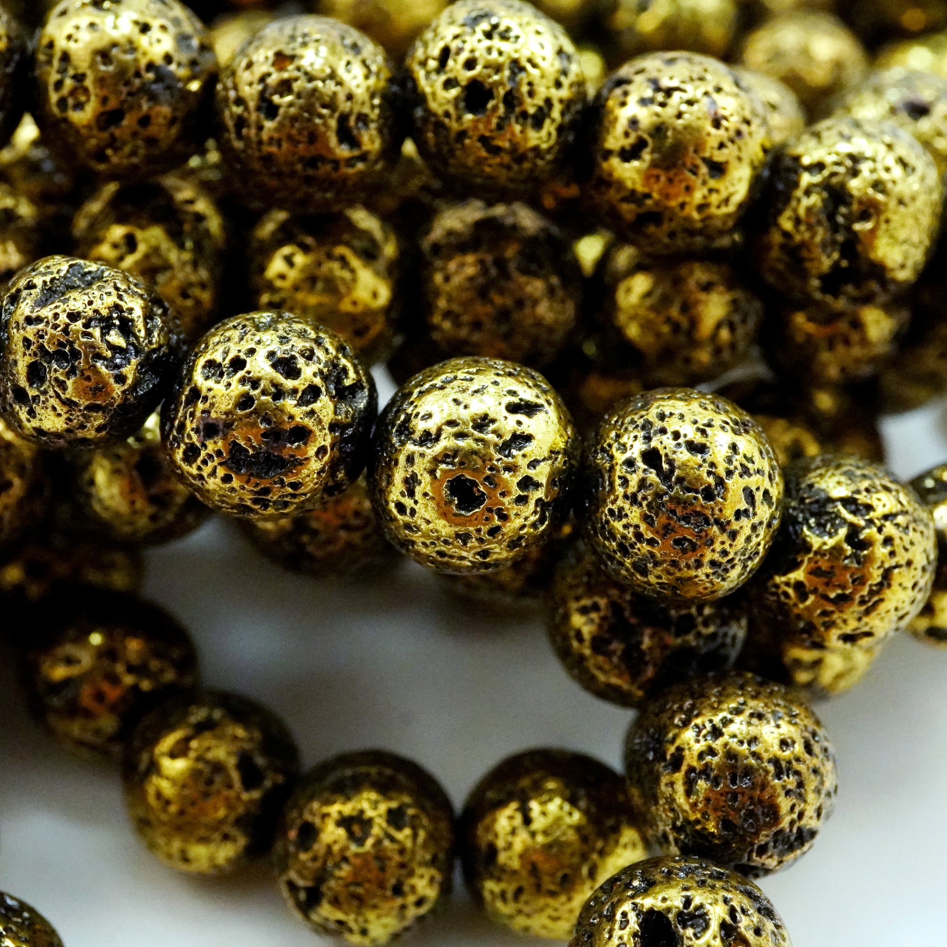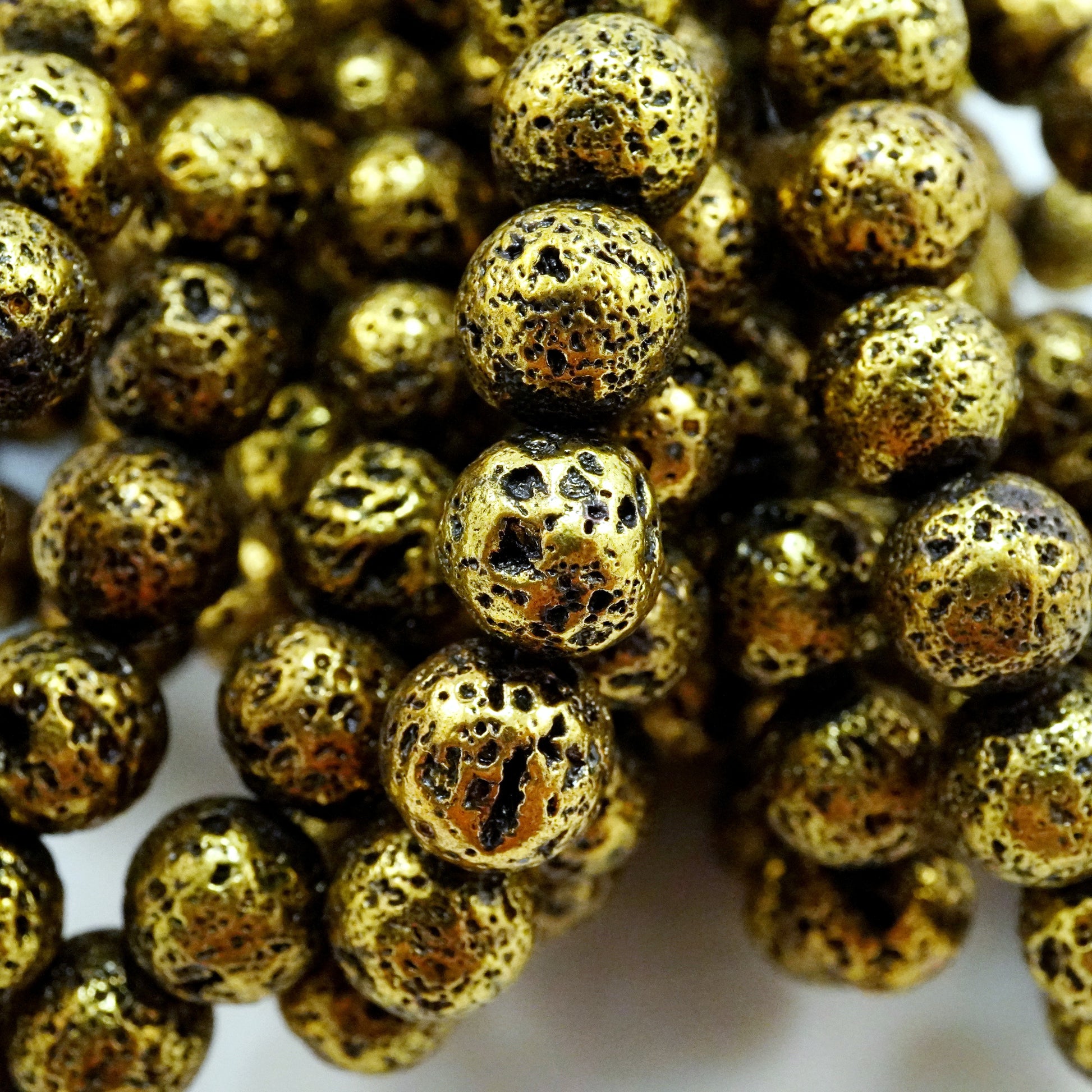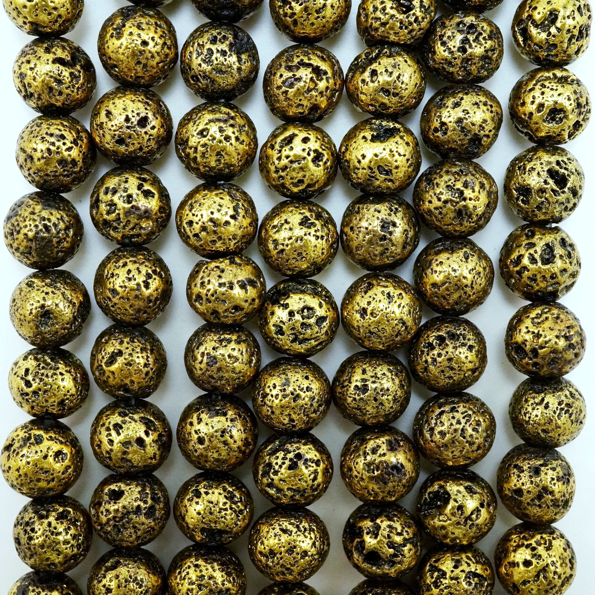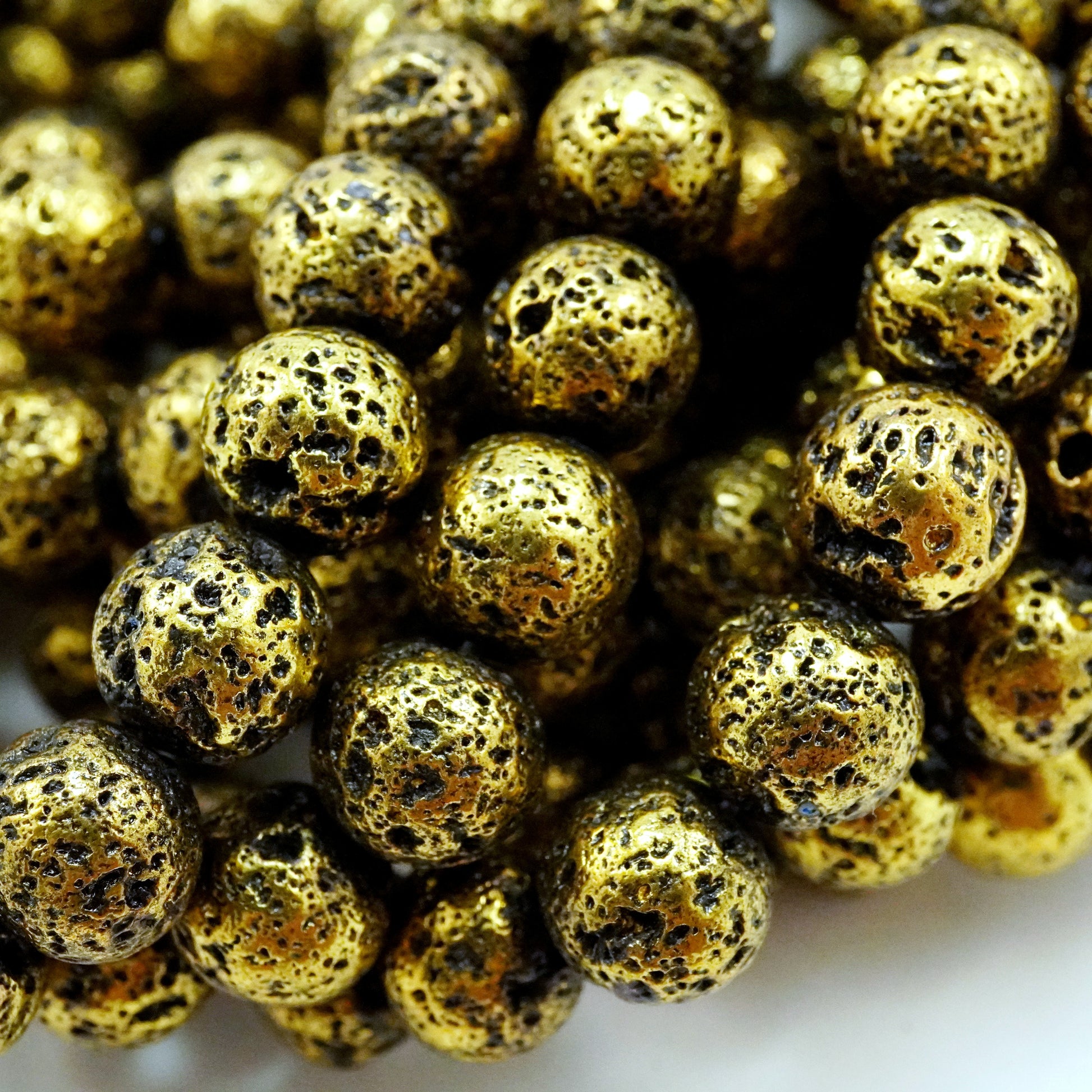 These Lava Beads have been electroplated with a metallic finish giving them an Antique Gold look. They are smooth to the touch yet their pores still remain visible. The metallic color of these beads make them excellent as spacers and as accents as they go well with various stone beads.