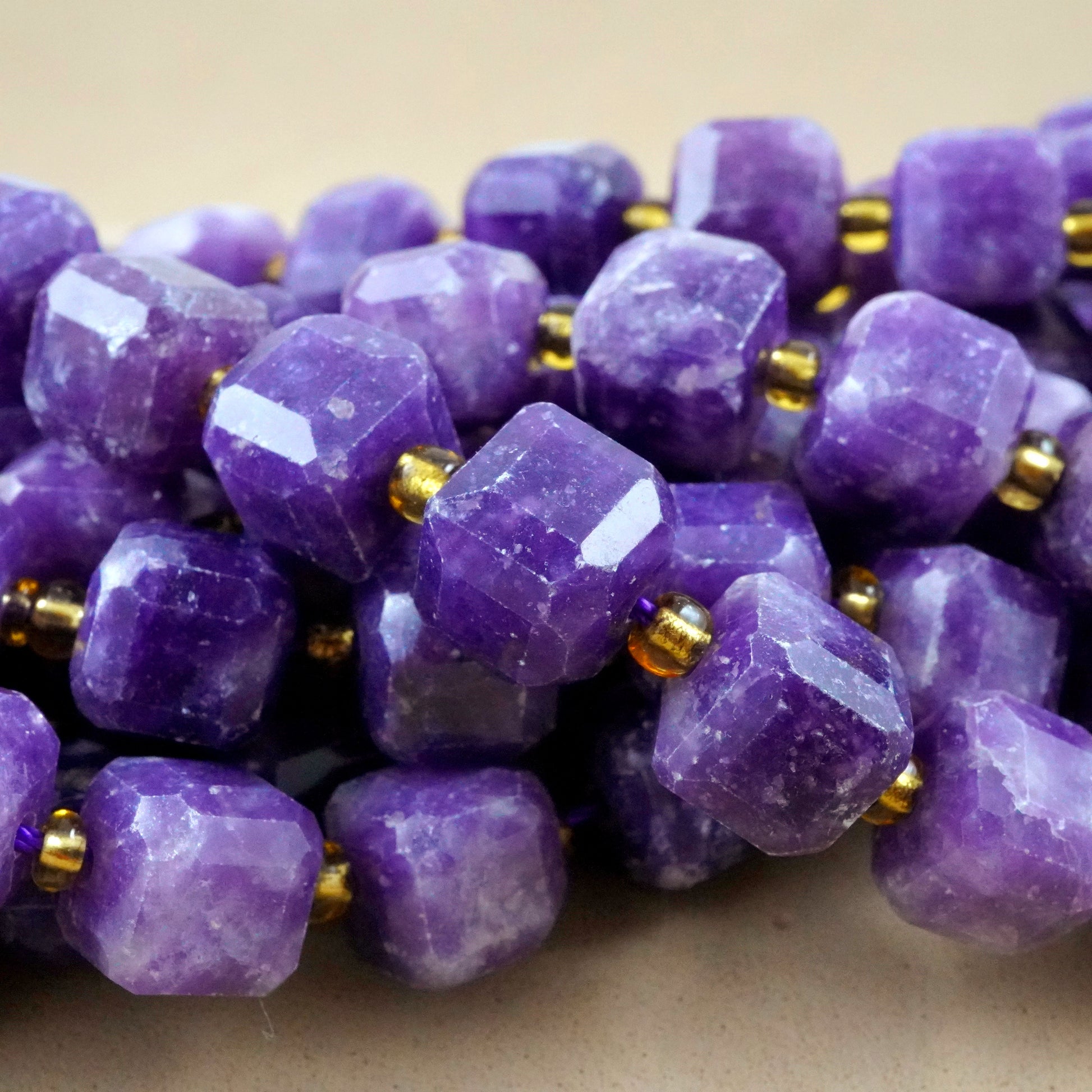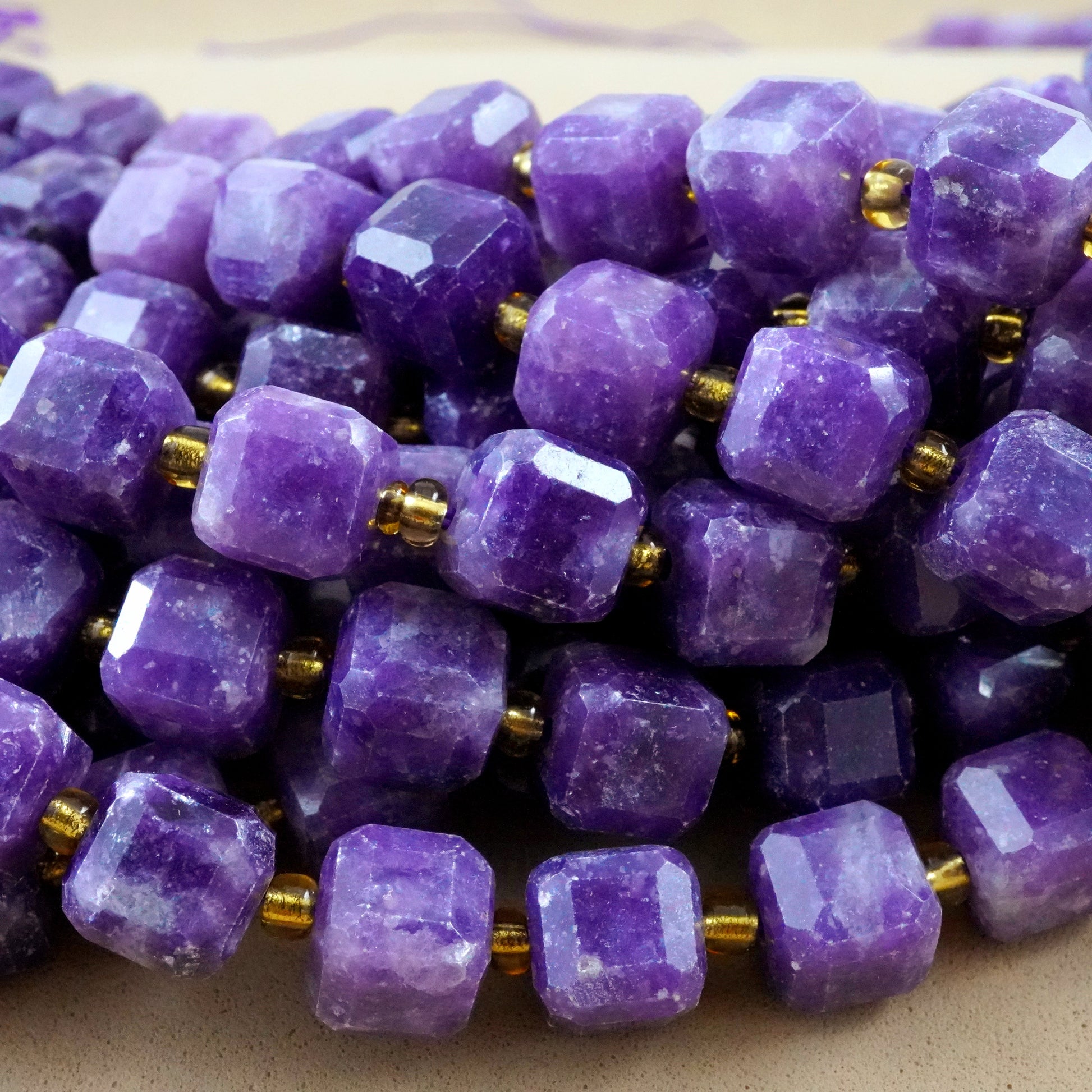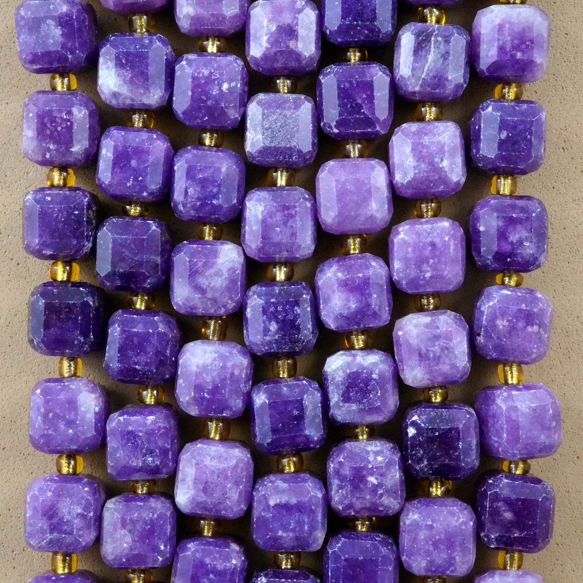 Lepidolite is a beautiful and unique gemstone that is known for its lilac, pink, and purple hues. It is a type of mica mineral that contains lithium, which gives it a calming and soothing energy. When cut into cube beads, lepidolite creates a charming and delicate look that is perfect for adding a subtle touch of color to any jewelry design. The cube-shaped facets of the beads reflect light in a soft and gentle manner, highlighting the stone's natural beauty and giving it a delicate and feminine appearance. Lepidolite is also a relatively soft gemstone, with a hardness rating of 2.5 to 3 on the Mohs scale, which makes it easy to cut and shape into various forms, including cube beads. Overall, lepidolite in faceted cube bead form is a pretty and versatile gemstone that is ideal for creating feminine and delicate jewelry pieces.