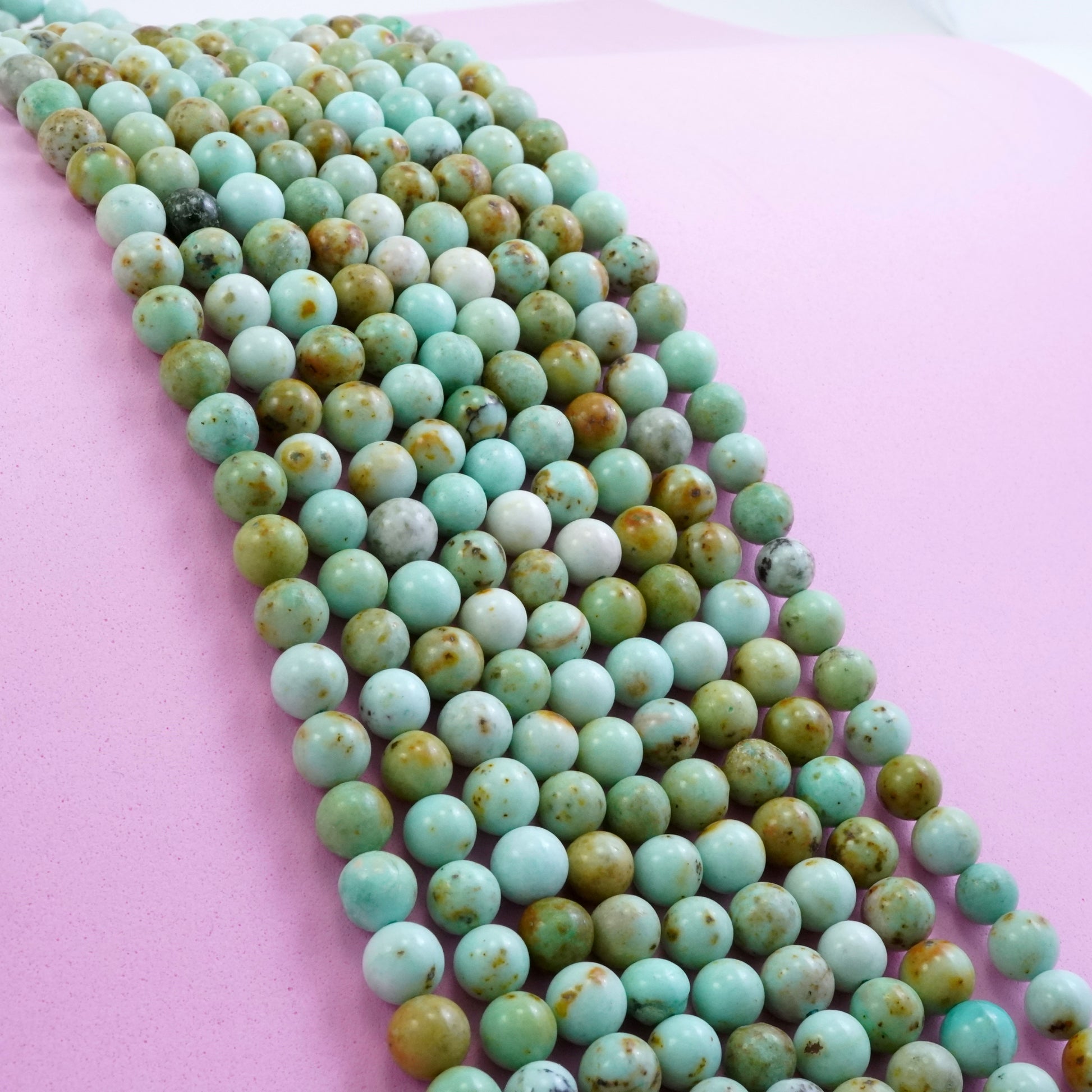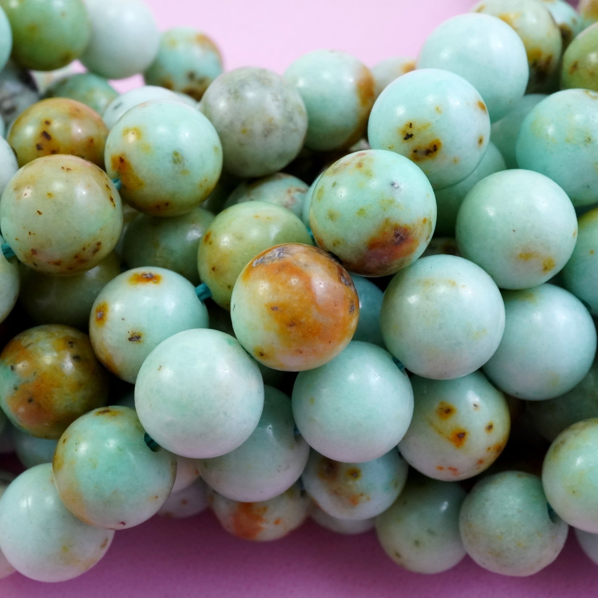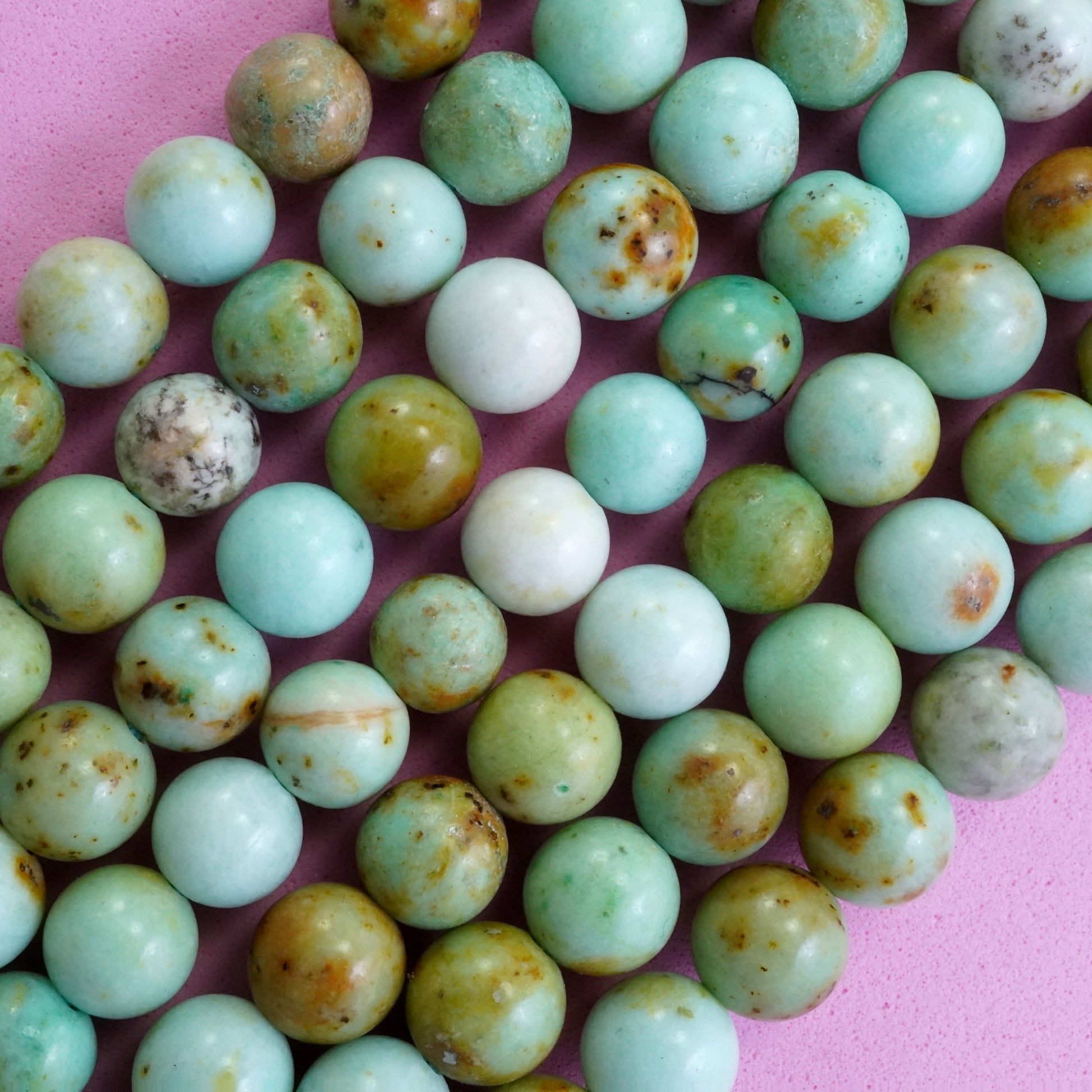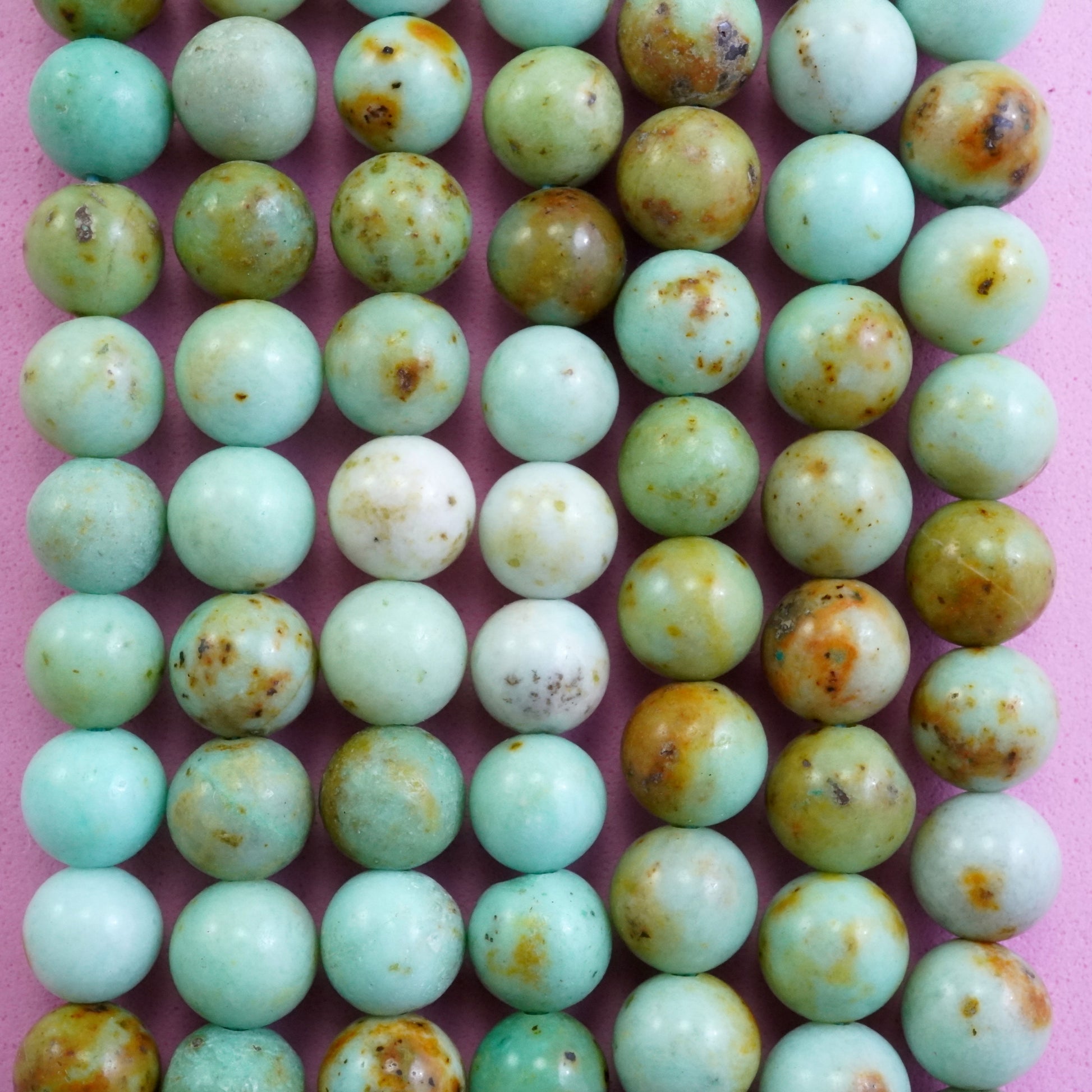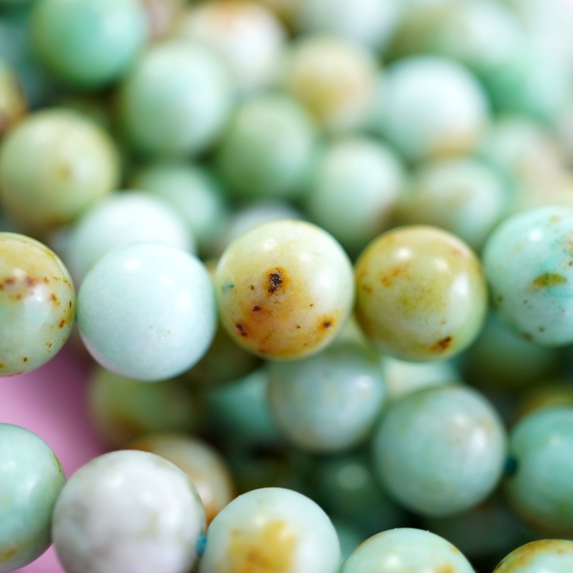 Chrysoprase is the rarest variation of Chalcedony. It comes in shades of Apple Green with the occasional brown iron inclusions. These particular beads come in light milky tones giving the beads a more solid look.