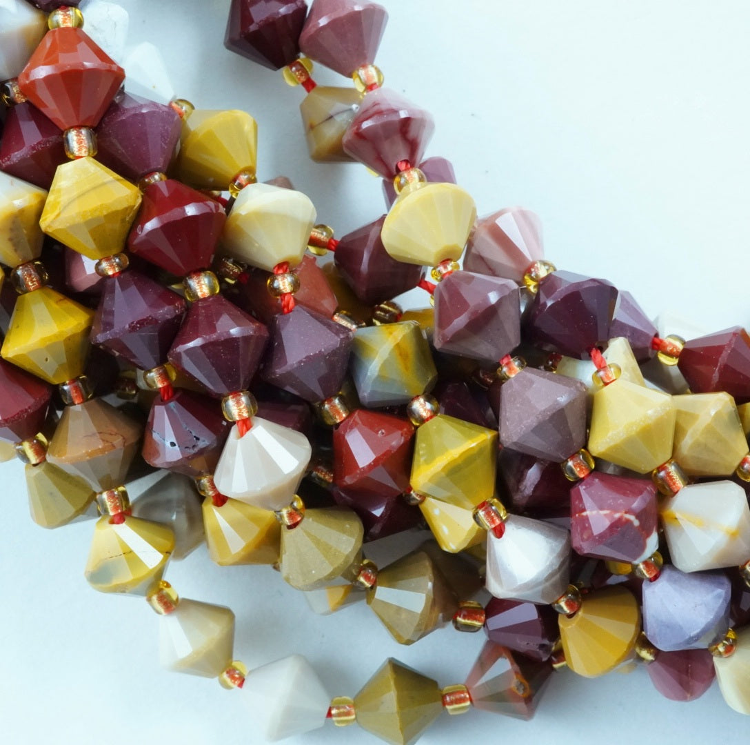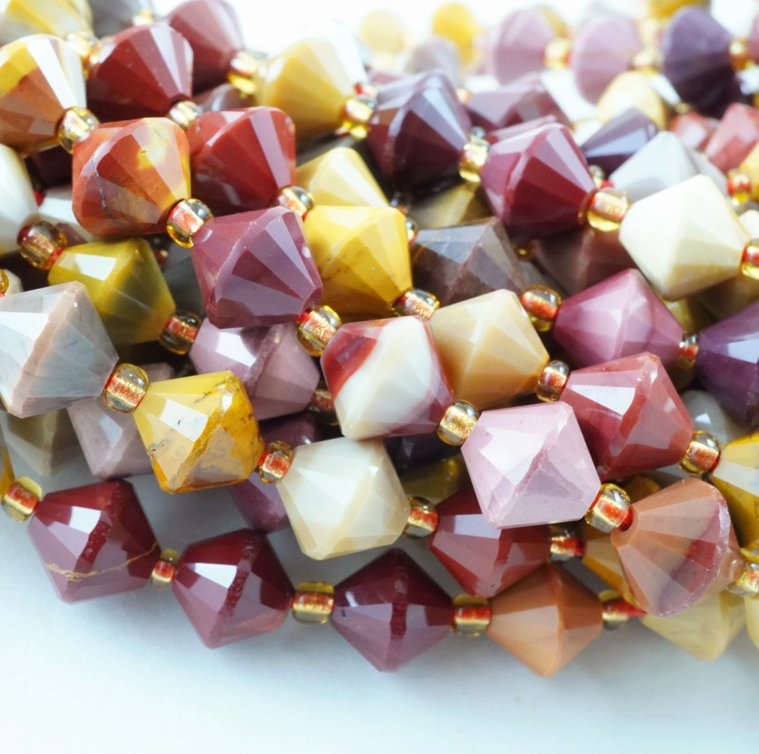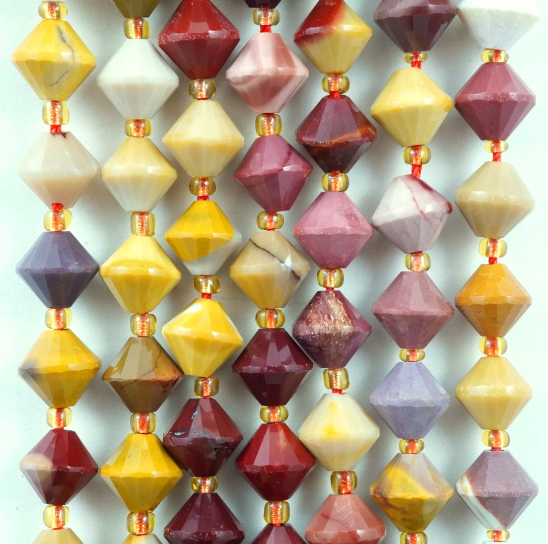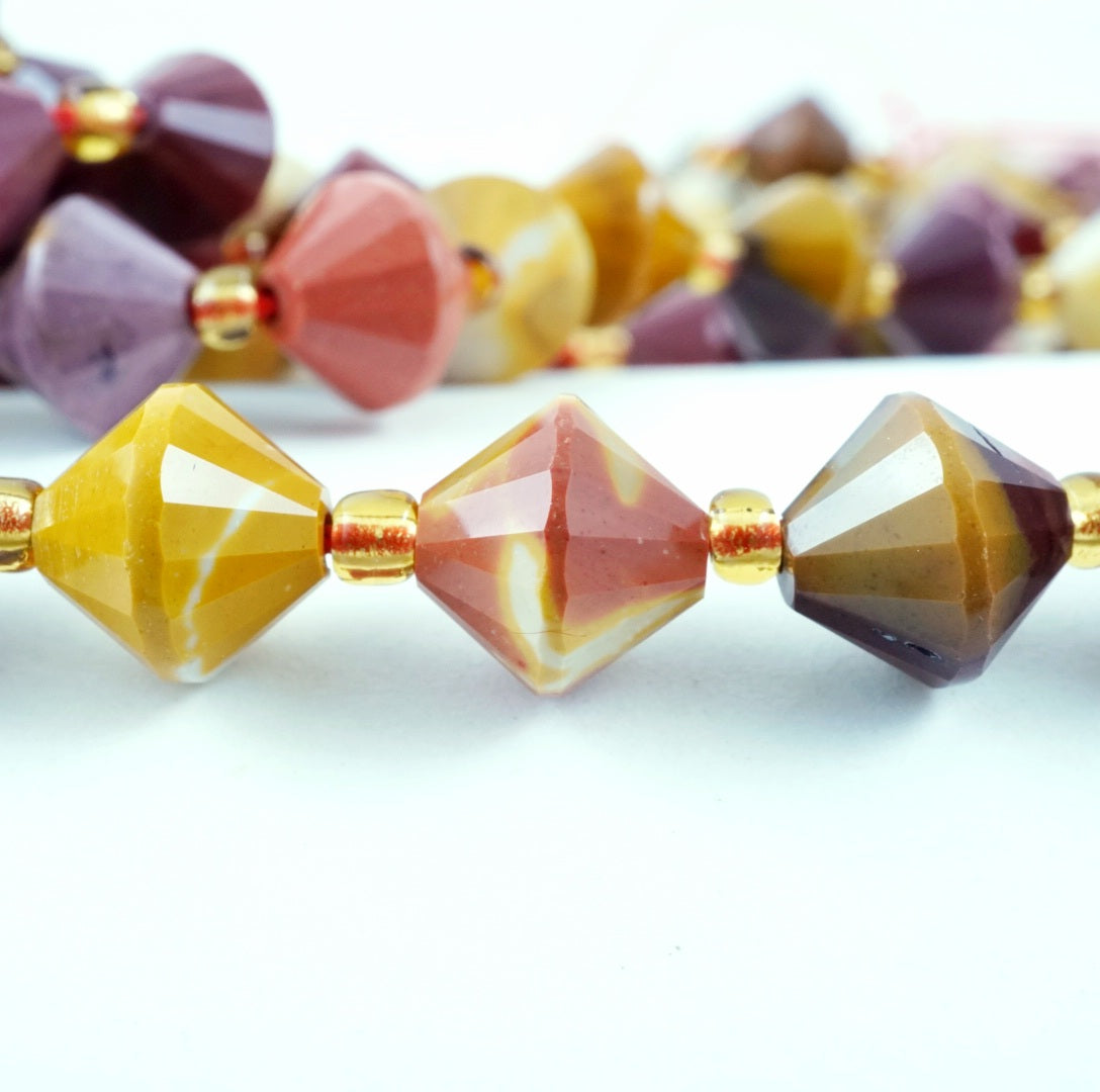 Mookaite is a sedimentary rock that is named after the Mooka Creek of Western Australia. These particular beads are cut and polished into beautiful Faceted Bicone beads.
