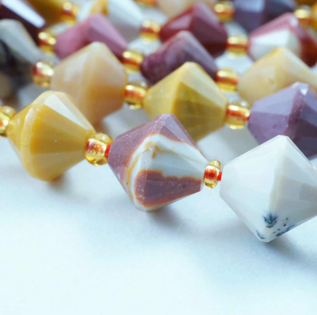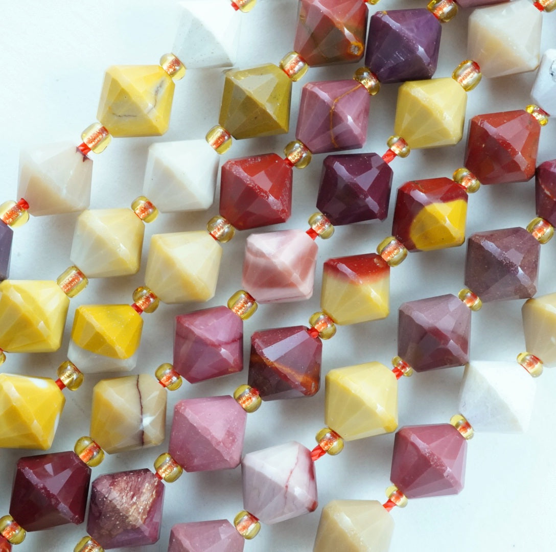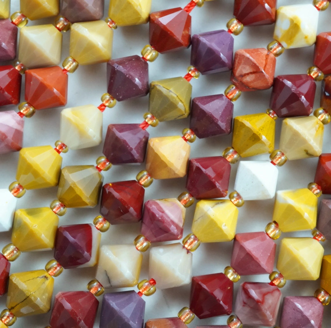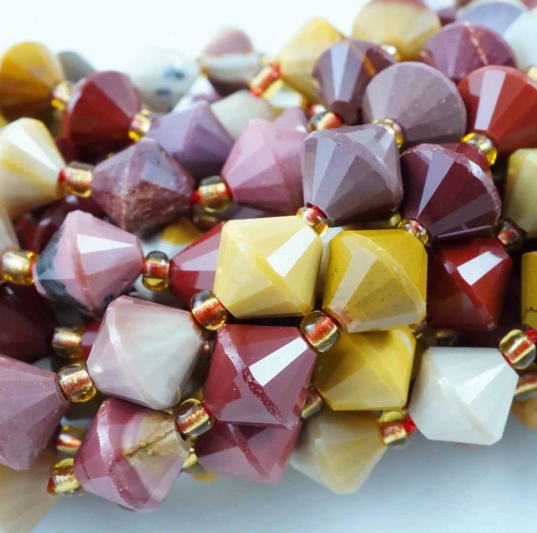 Mookaite is a sedimentary rock that is named after the Mooka Creek of Western Australia. These particular beads are cut and polished into beautiful Faceted Bicone beads.