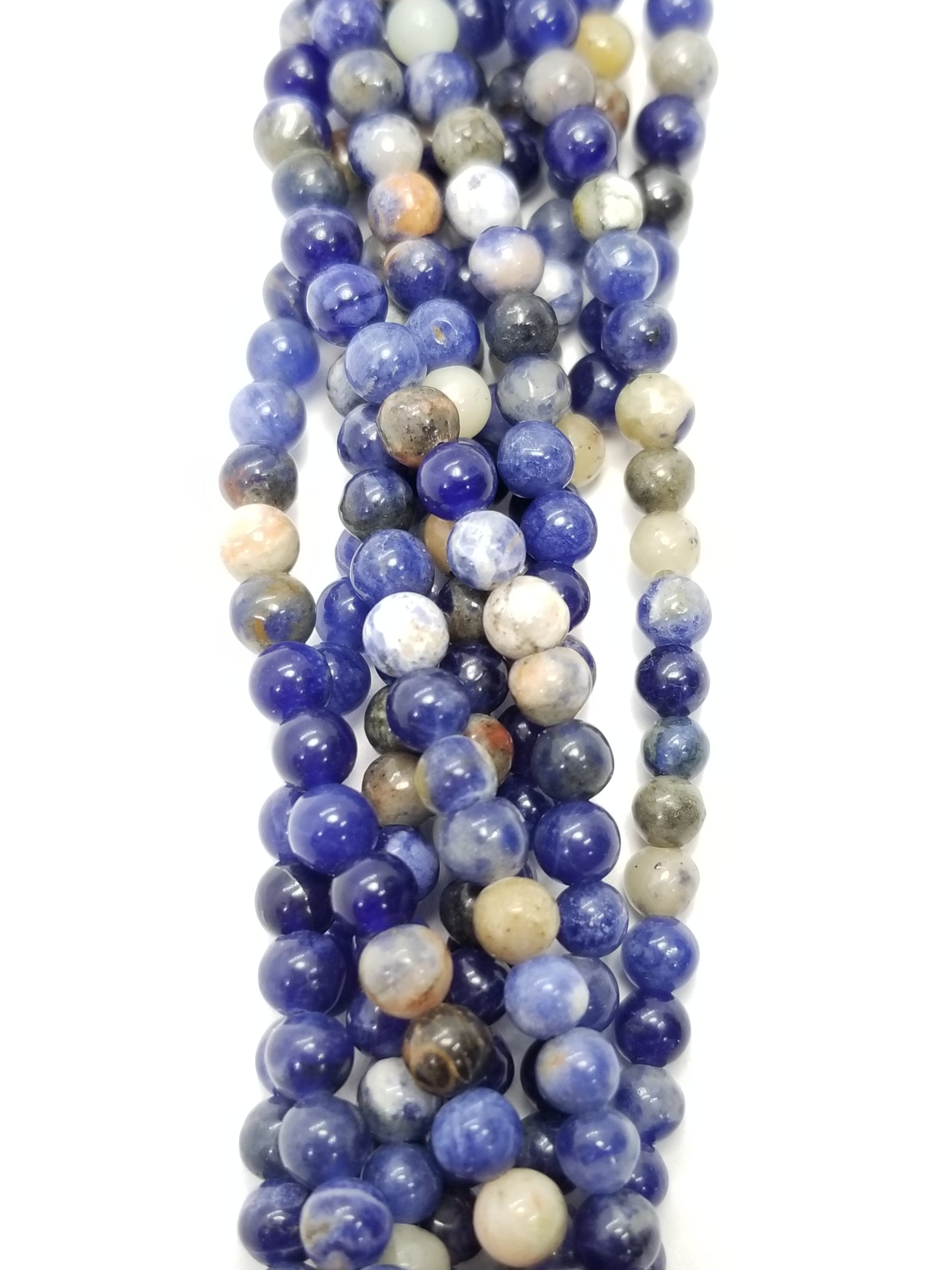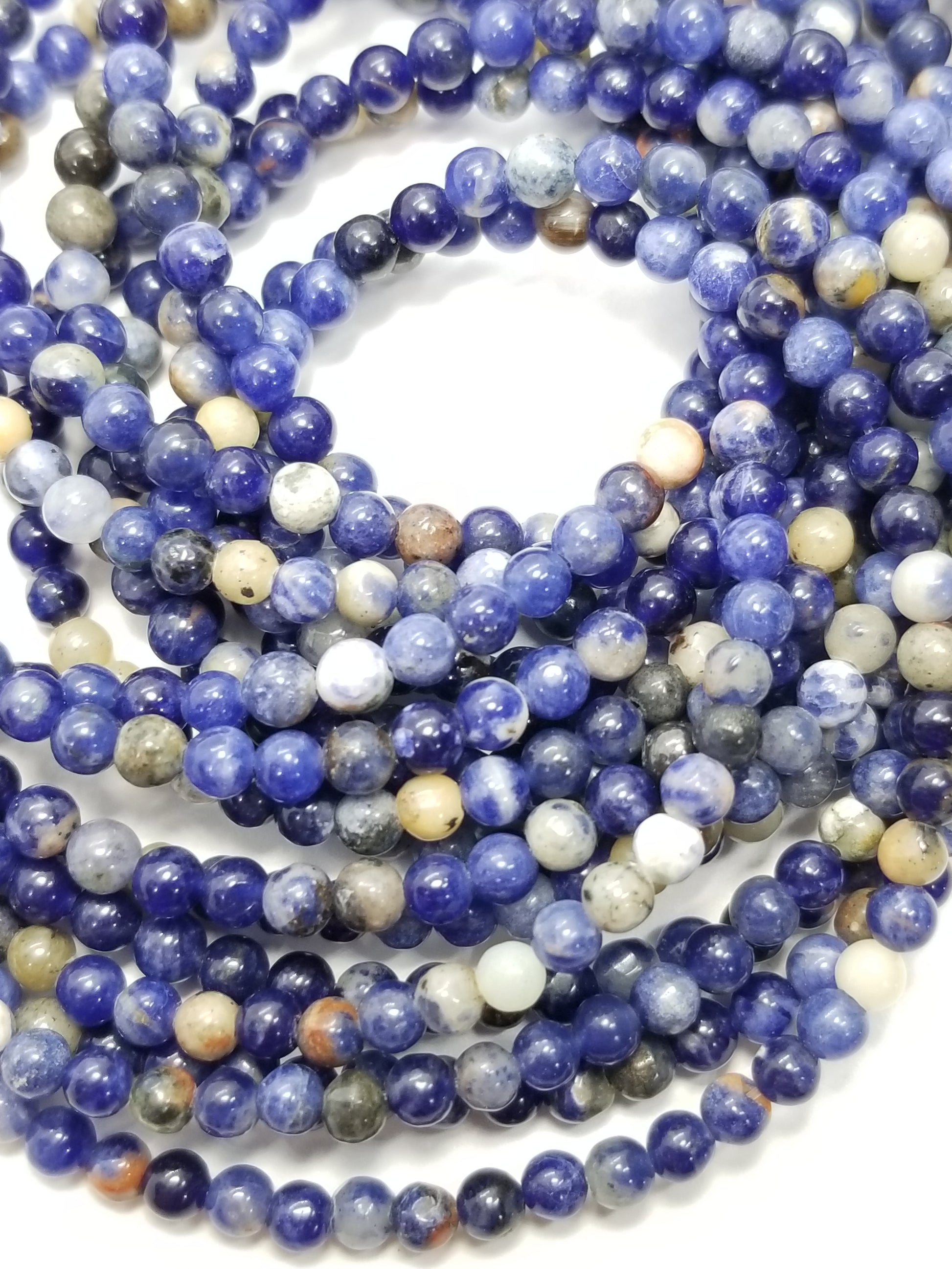 Sodalite is a stone named after its high sodium content. It usually displays patterns made of white calcite but can also be found with orange calcite markings as well.