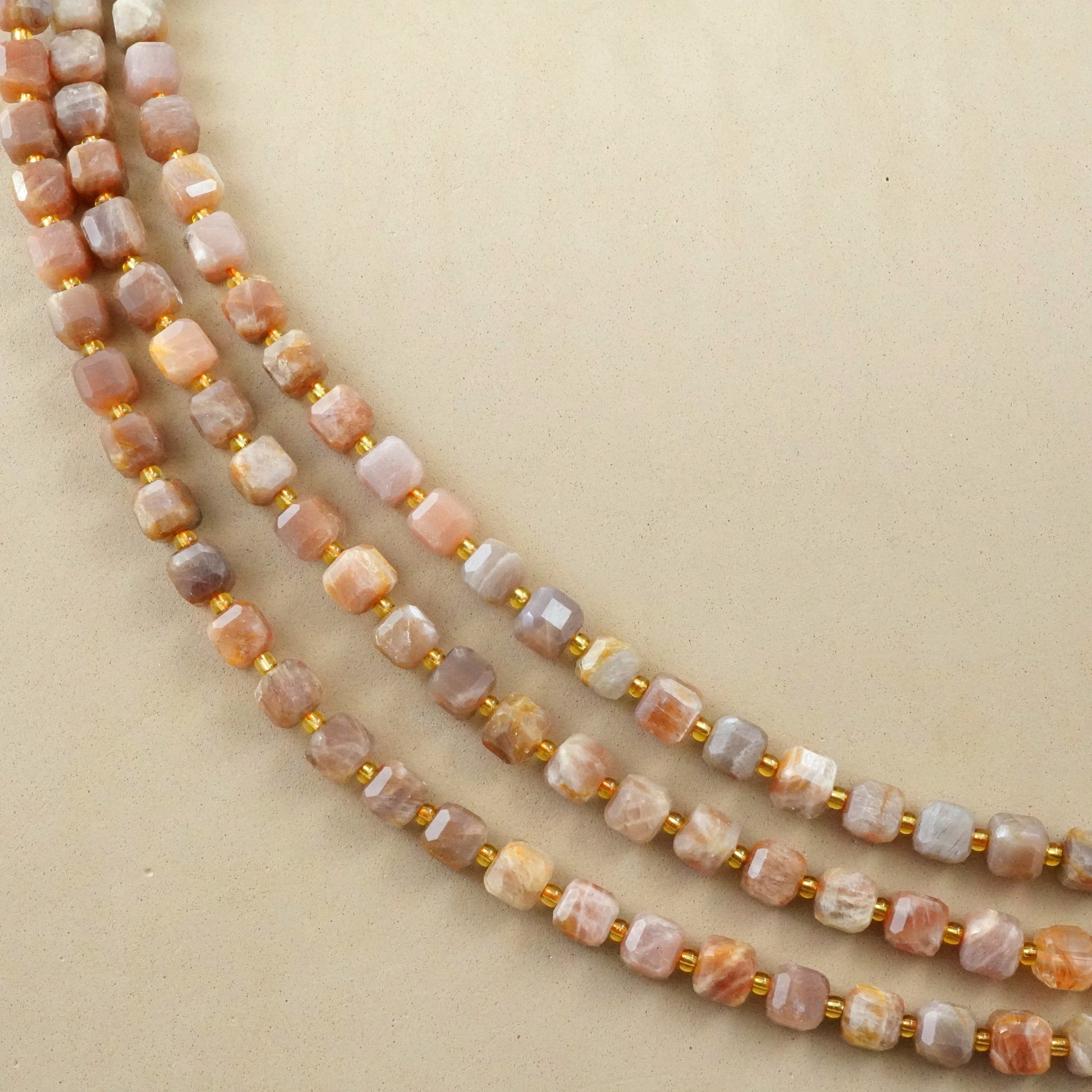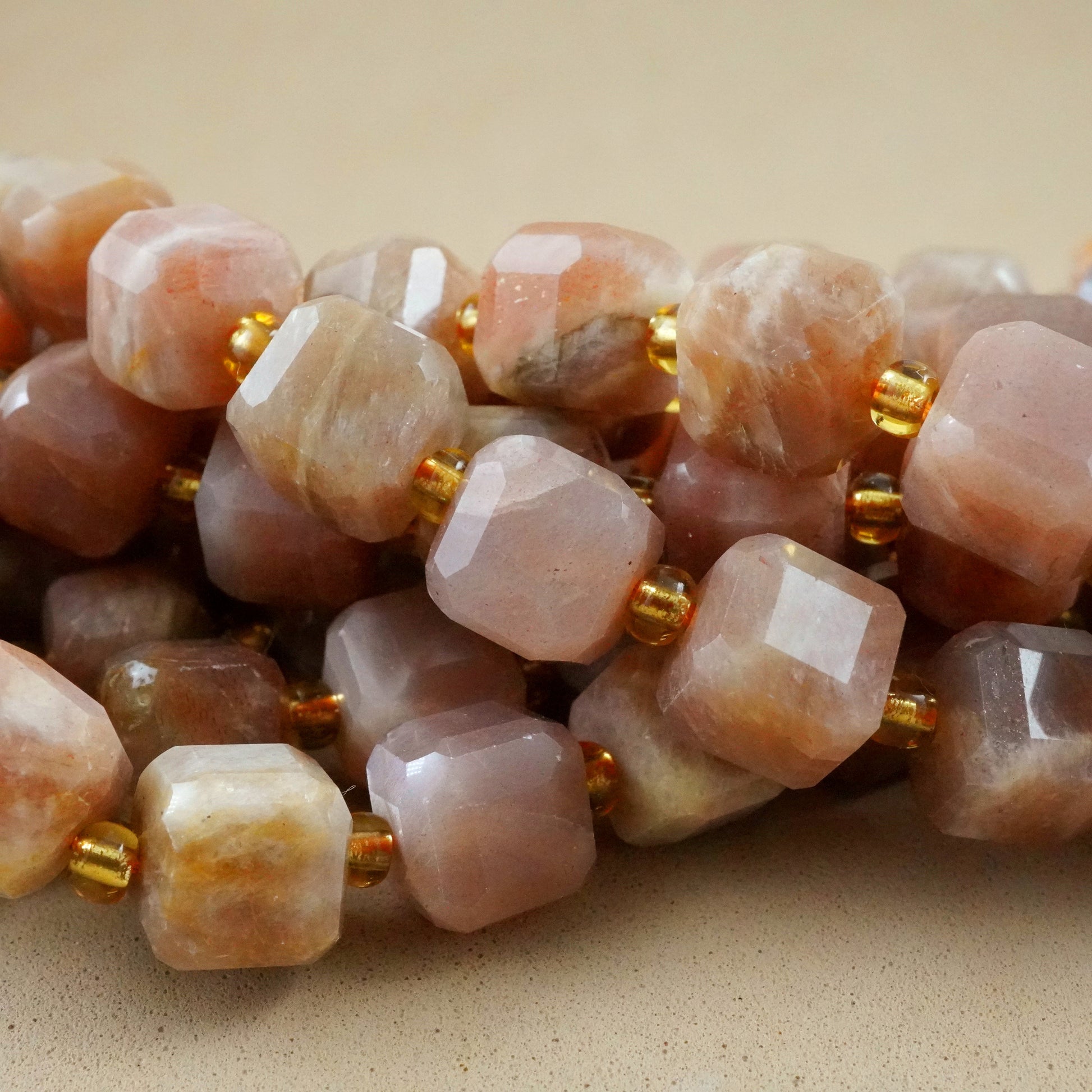 Peach moonstone is a beautiful and unique gemstone that is known for its delicate peachy-pink color and its iridescent glow, which is caused by the presence of orthoclase and albite minerals. When cut into faceted cube beads, peach moonstone creates a charming and feminine look that is perfect for adding a touch of elegance to any jewelry design. The cube-shaped facets of the beads reflect light in a soft and gentle manner, emphasizing the stone's natural color and giving it a delicate and sophisticated appearance. Peach moonstone is also a relatively hard gemstone, with a hardness rating of 6 to 6.5 on the Mohs scale, which makes it ideal for cutting and shaping into various forms, including cube beads. Overall, peach moonstone in faceted cube bead form is a pretty and versatile gemstone that is perfect for creating delicate and sophisticated jewelry pieces that are sure to catch the eye and capture the heart.