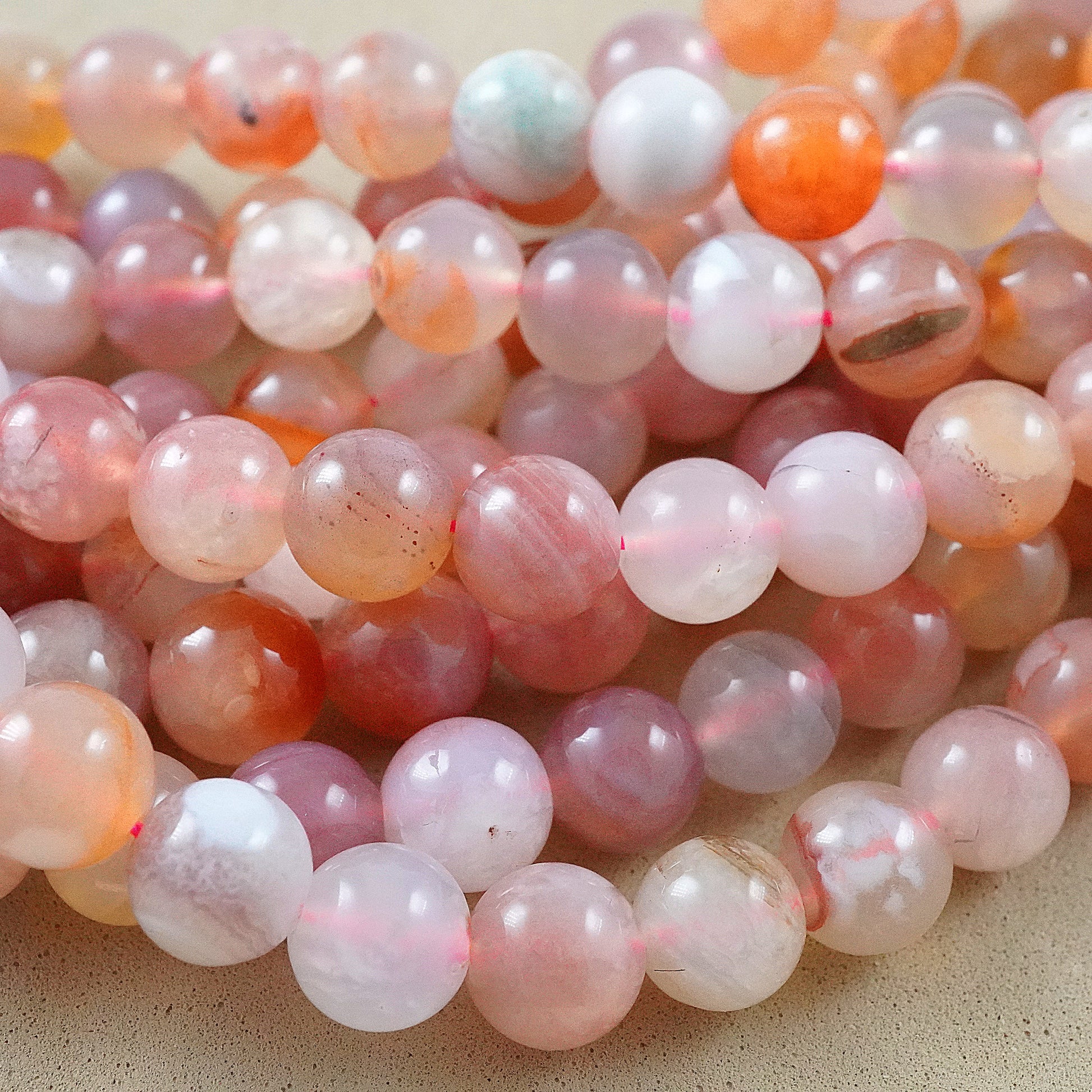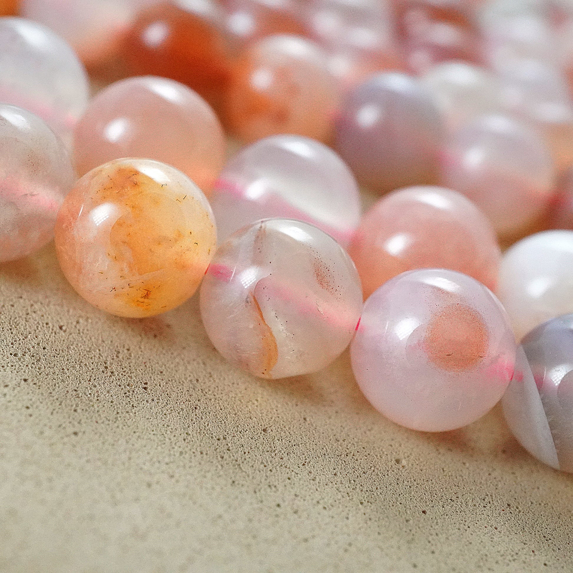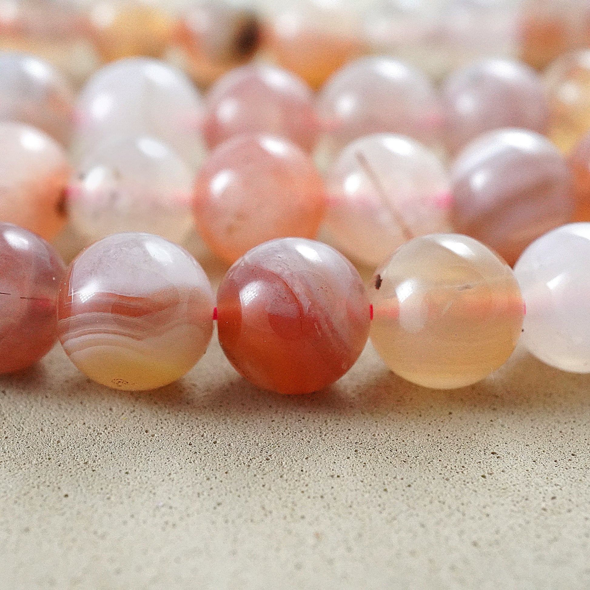 Crafted with precision and care, these beads feature delicate shades of pink, accented by swirling bands of white and occasional hints of gray or peach. Their smooth, polished surface exudes elegance, making them perfect for creating stunning bracelets, necklaces, earrings, and other accessories.