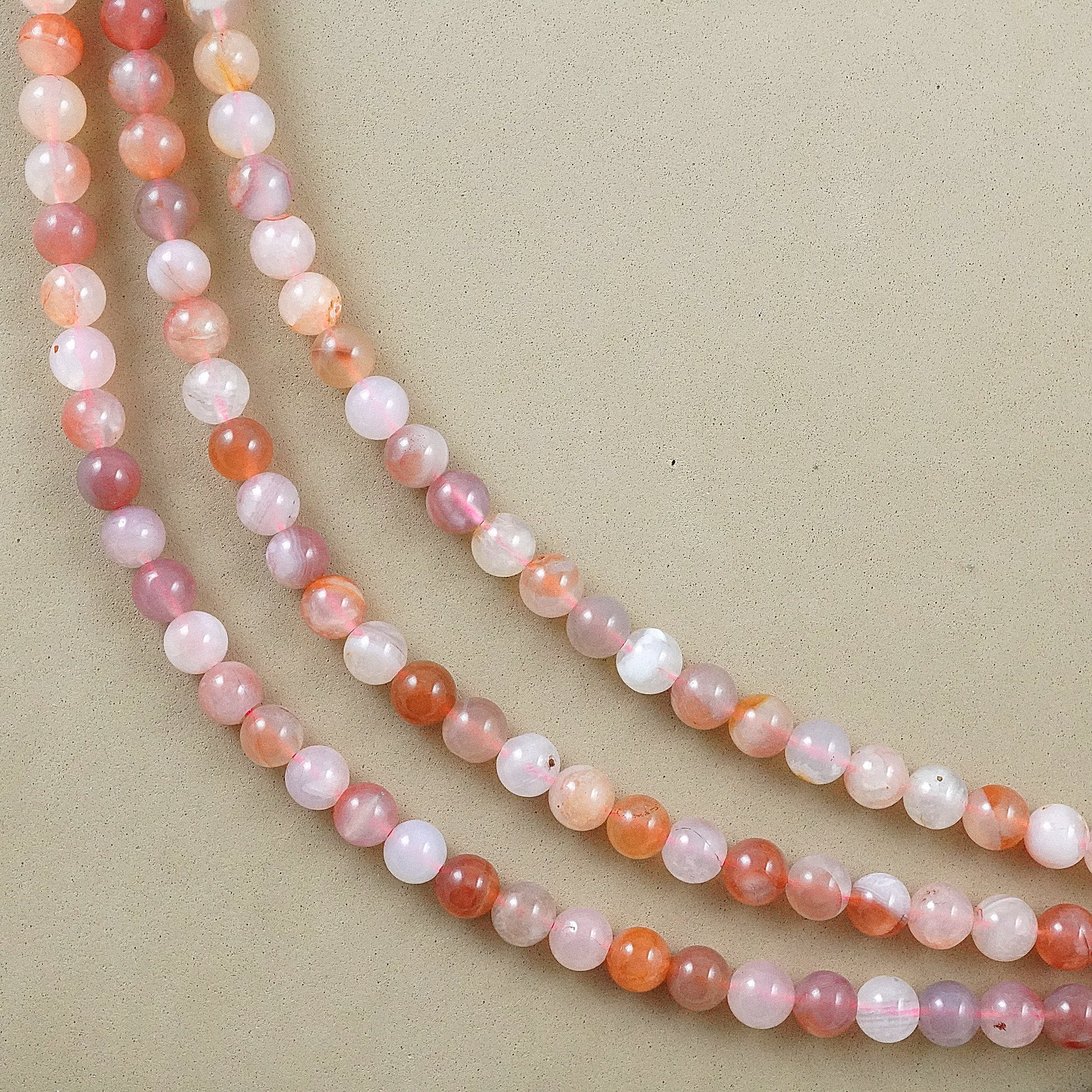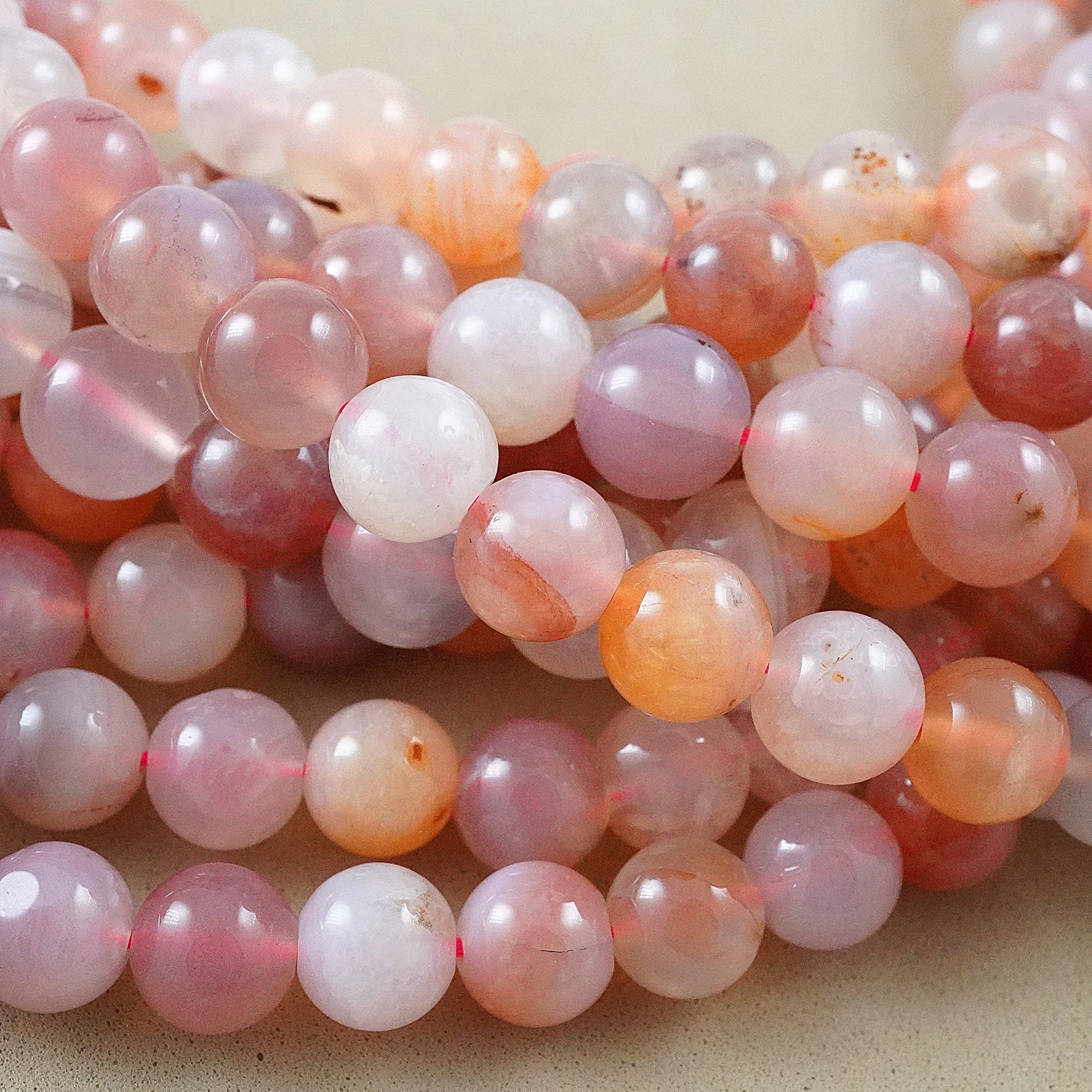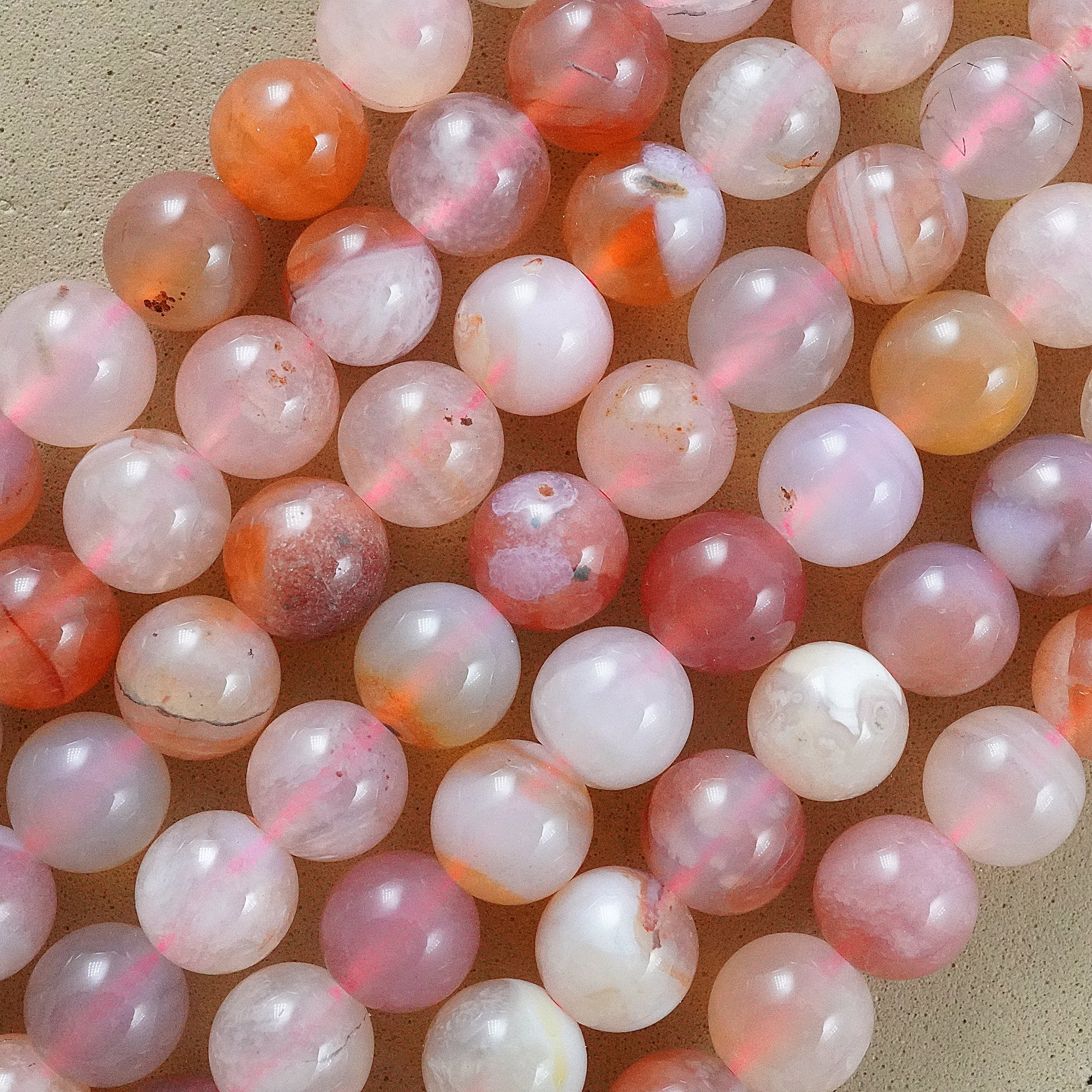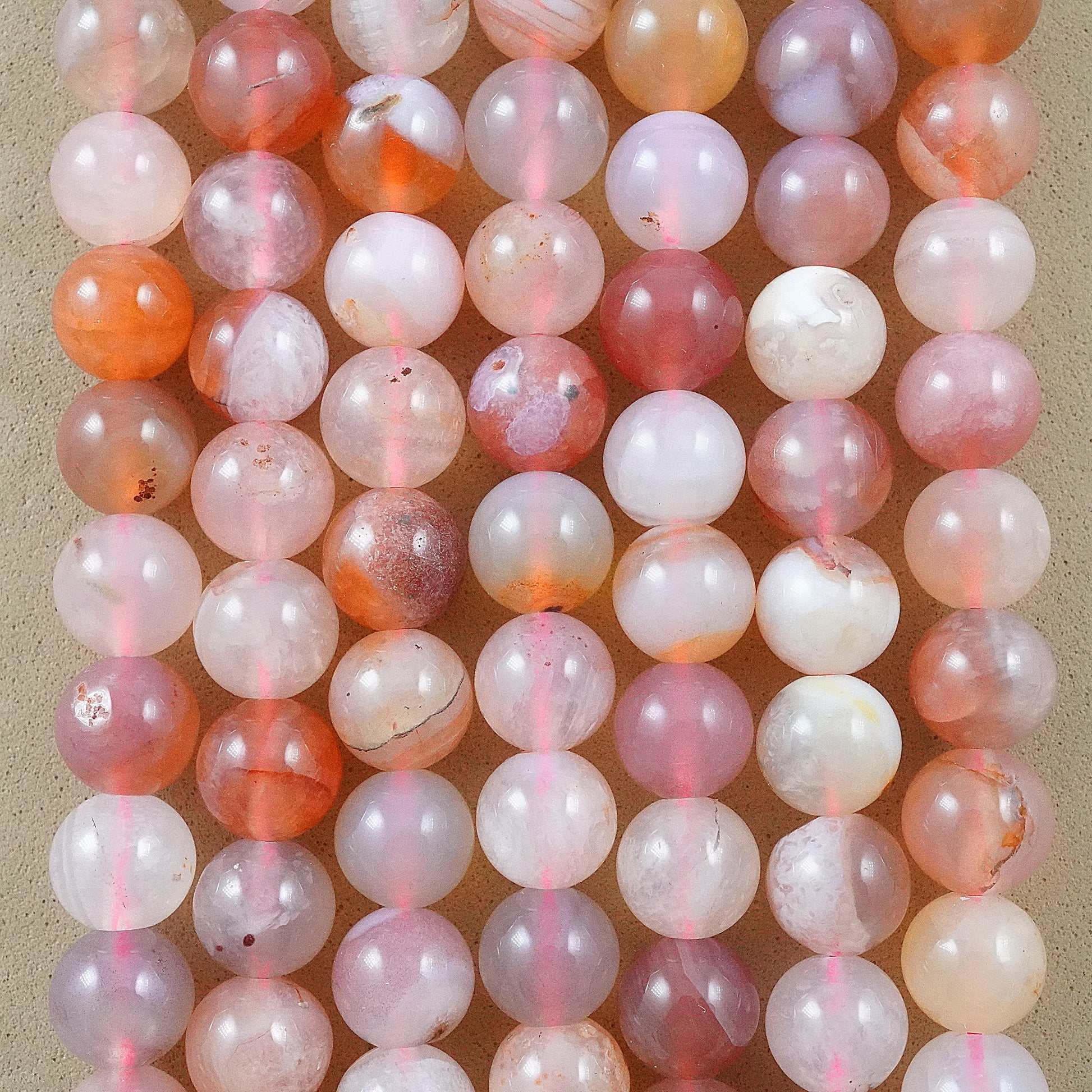 Crafted with precision and care, these beads feature delicate shades of pink, accented by swirling bands of white and occasional hints of gray or peach. Their smooth, polished surface exudes elegance, making them perfect for creating stunning bracelets, necklaces, earrings, and other accessories.