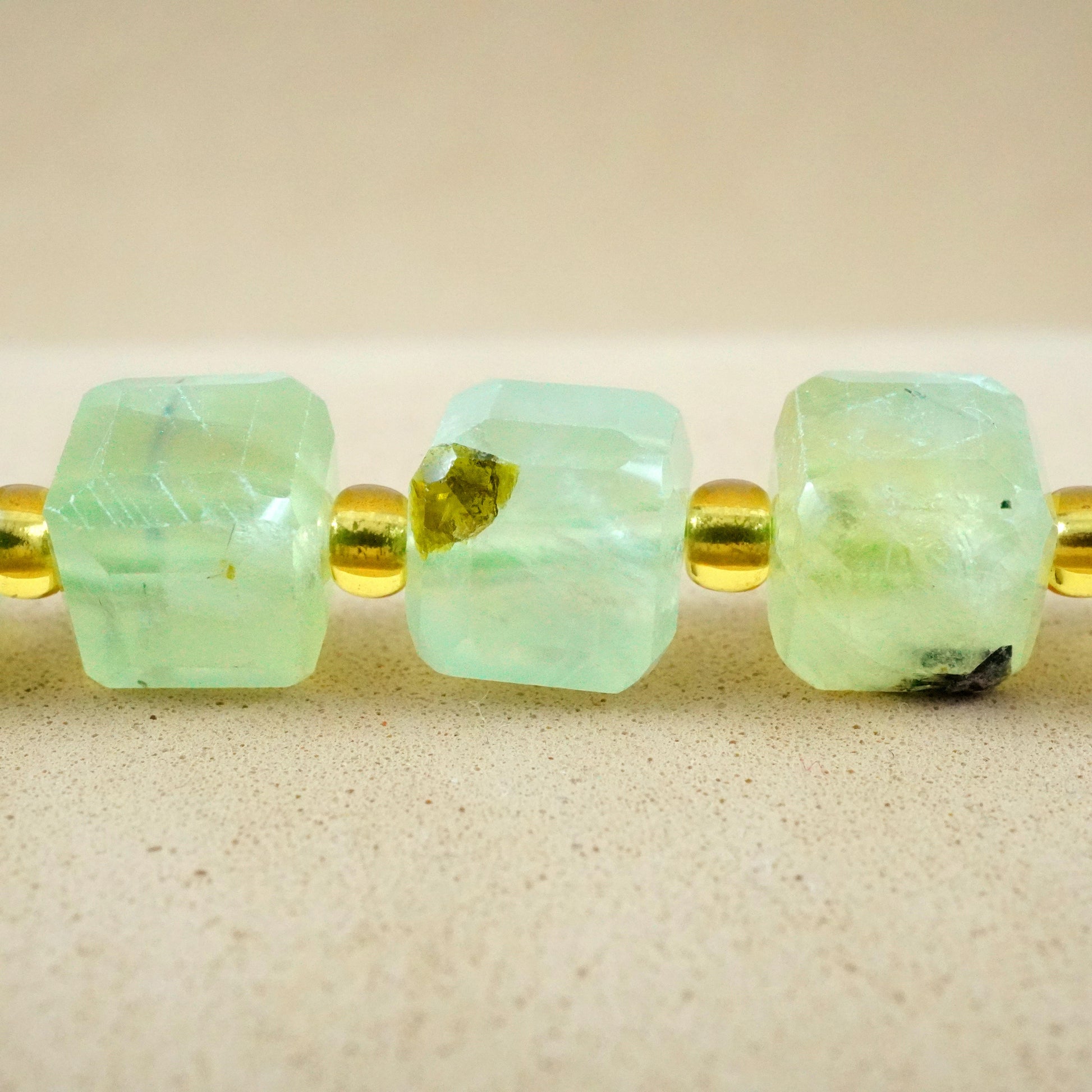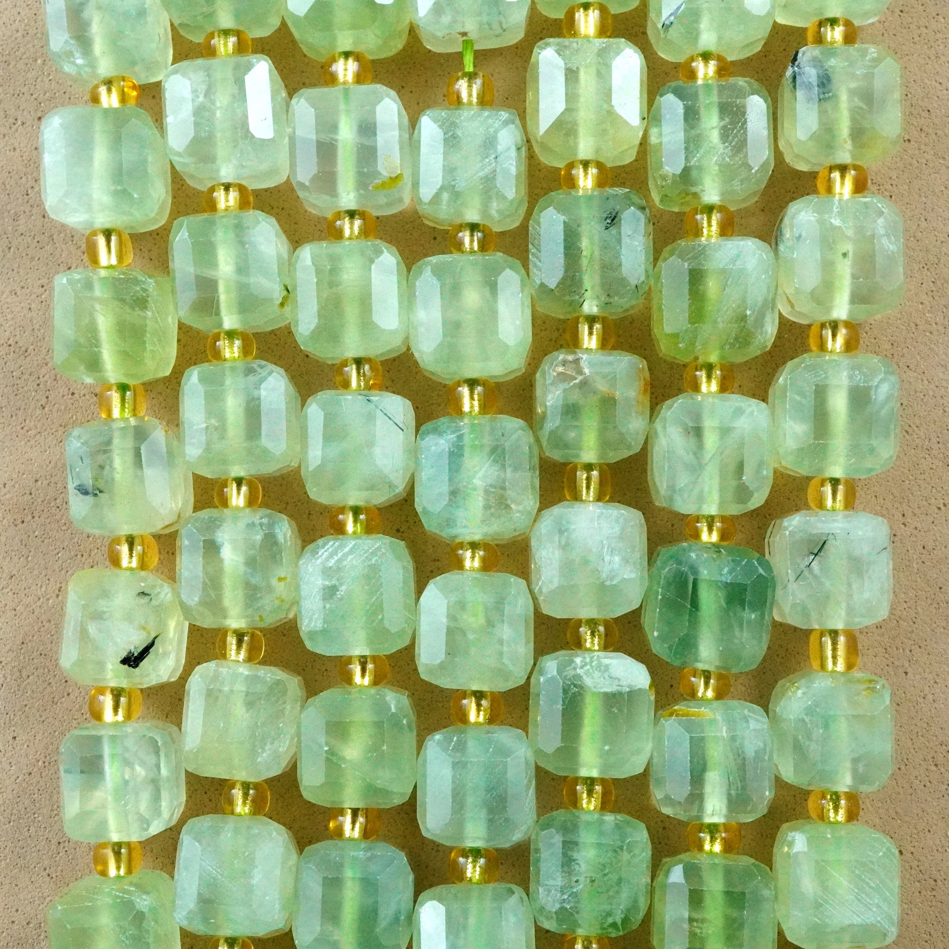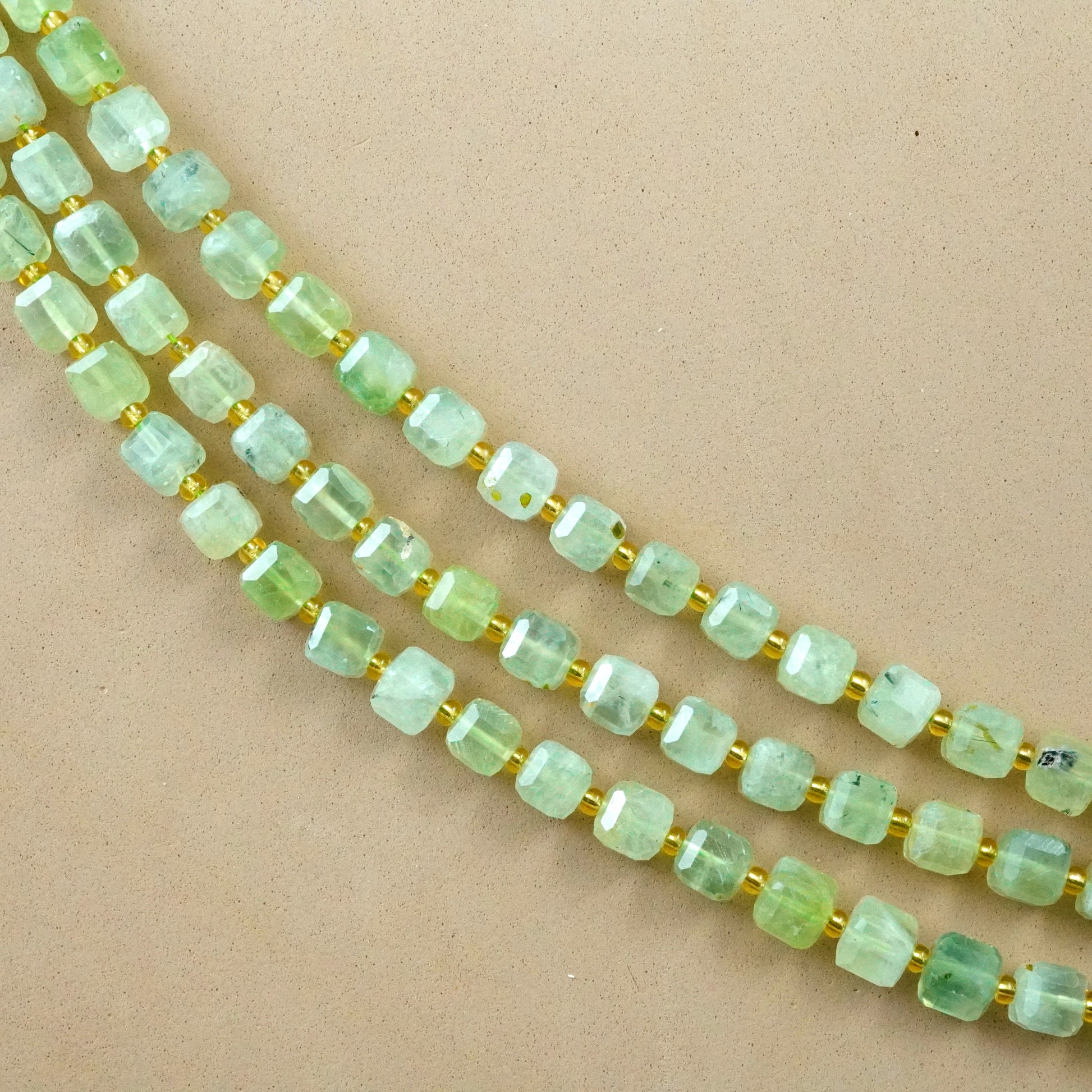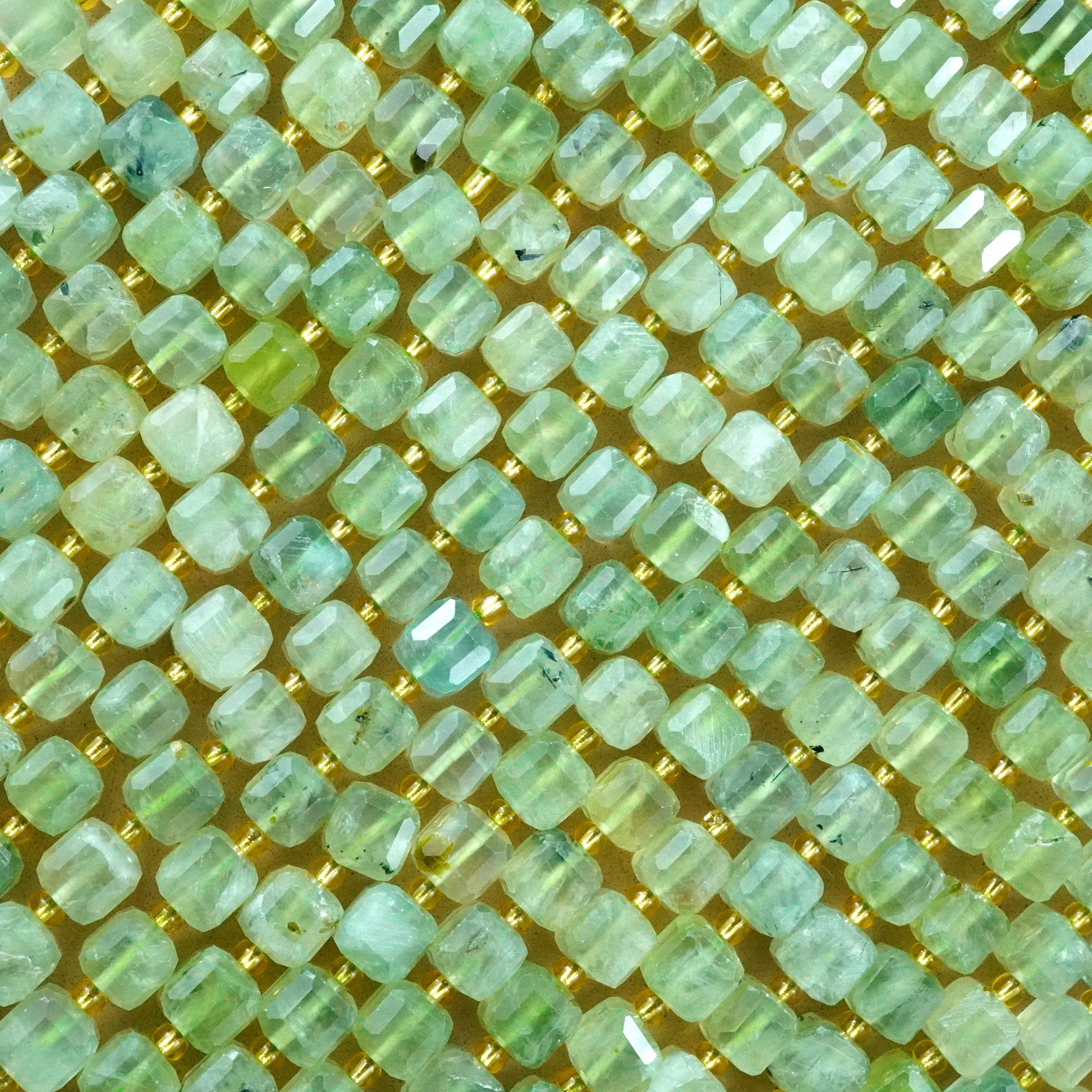 Prehnite is a beautiful and unique gemstone that is known for its soft and subtle green color, which can range from pale yellow-green to a deeper olive-green. It is composed mainly of calcium and aluminum, with small amounts of iron and other minerals that give it its characteristic color. When cut into faceted cube beads, prehnite creates a stunning and sophisticated look that is perfect for adding a touch of elegance to any jewelry design. The cube-shaped facets of the beads reflect light in a subtle and gentle manner, emphasizing the stone's natural color and giving it a delicate and refined appearance. Prehnite is also a relatively durable gemstone, with a hardness rating of 6 to 6.5 on the Mohs scale, which makes it ideal for cutting and shaping into various forms, including cube beads. Overall, prehnite in faceted cube bead form is a beautiful and versatile gemstone that is perfect for creating elegant and refined jewelry pieces that are sure to impress and inspire.