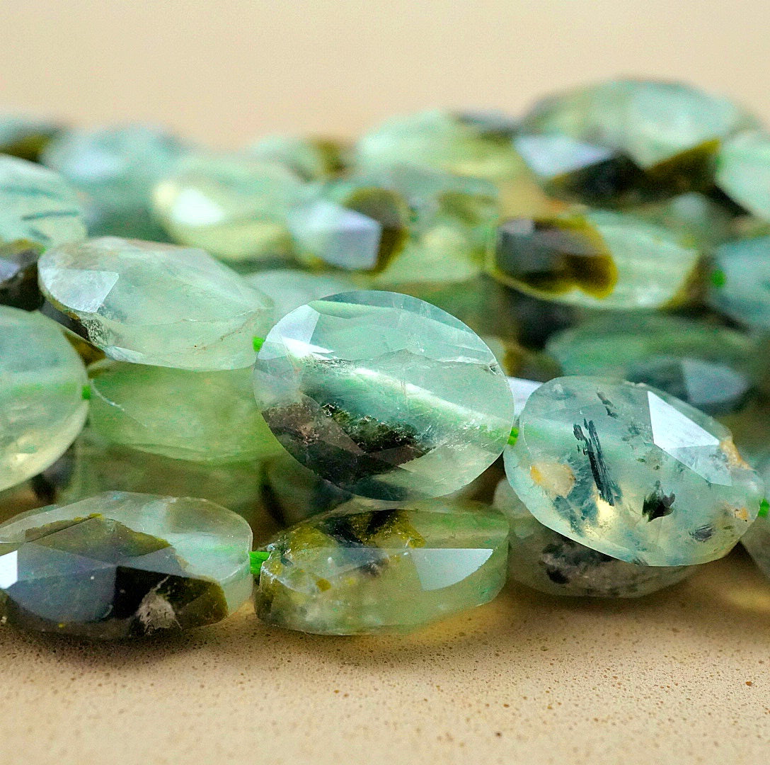 Elevate your jewelry designs with the serene elegance of faceted oval Prehnite beads. Known for its soothing green hues and calming energy, Prehnite is a stone of harmony and renewal. The faceted cuts bring out a soft, luminous glow, making each bead a gentle yet captivating focal point. Perfect for adding a touch of natural beauty and tranquility to your creations, these beads are ideal for those seeking both style and spiritual connection. Transform your designs with the timeless charm of faceted oval Prehnite beads.