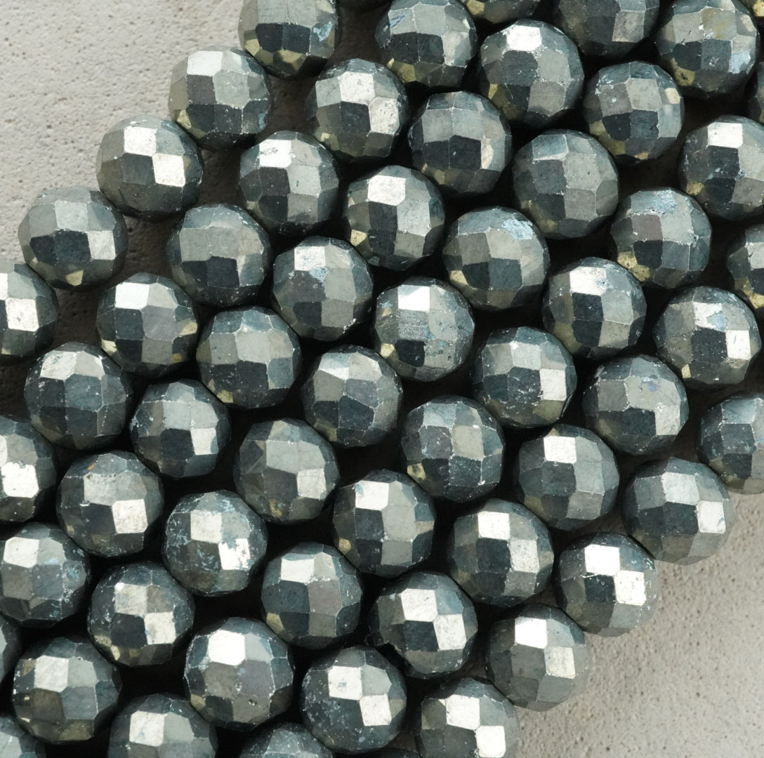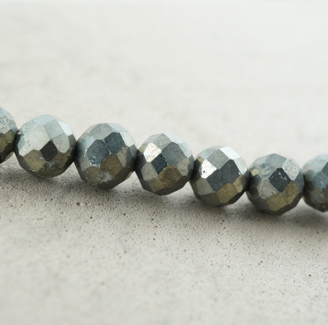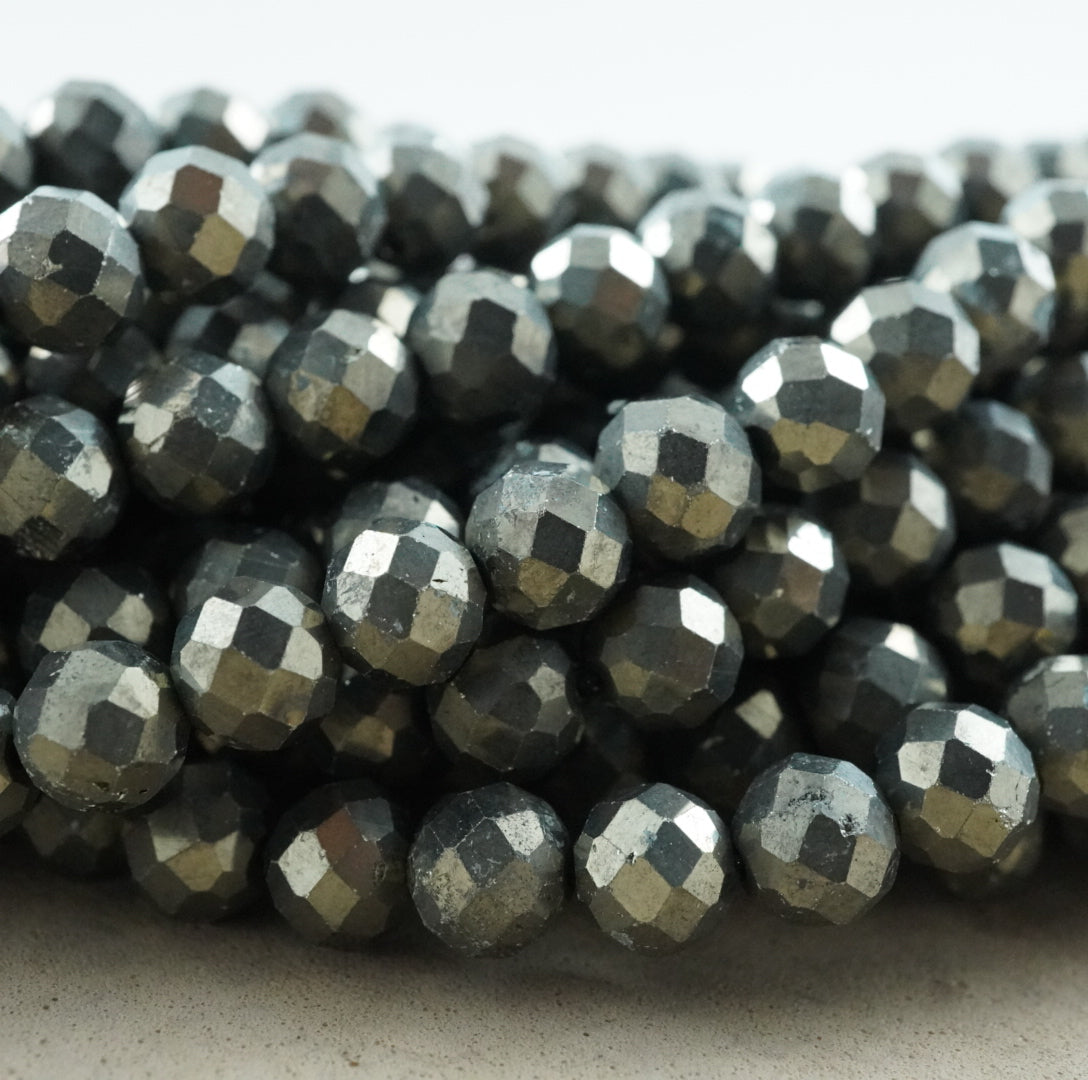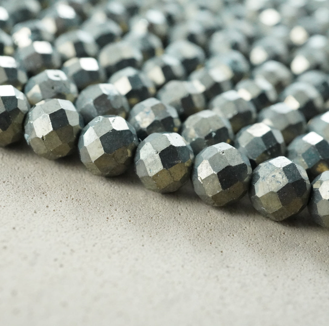 Pyrite is an iron sulfide mineral and is the stone known as "fool's gold". Its name originates from the Greek word for fire, because striking two pieces together can create sparks. Beads made of this stone are very popular due to their neutral tone and ability to blend in with almost anything.
