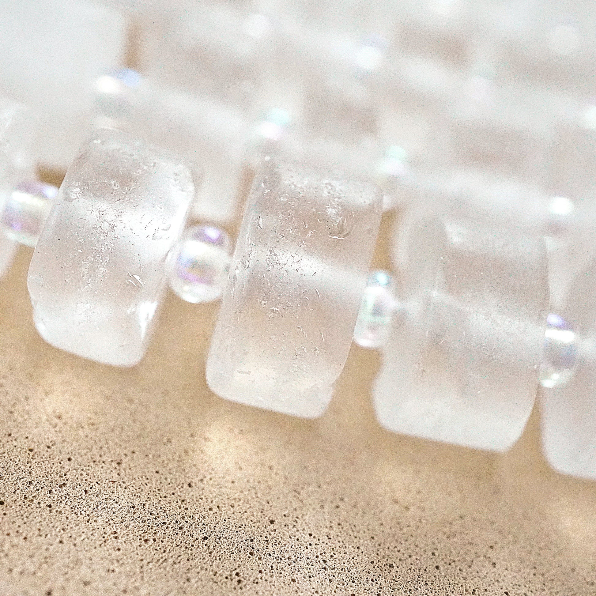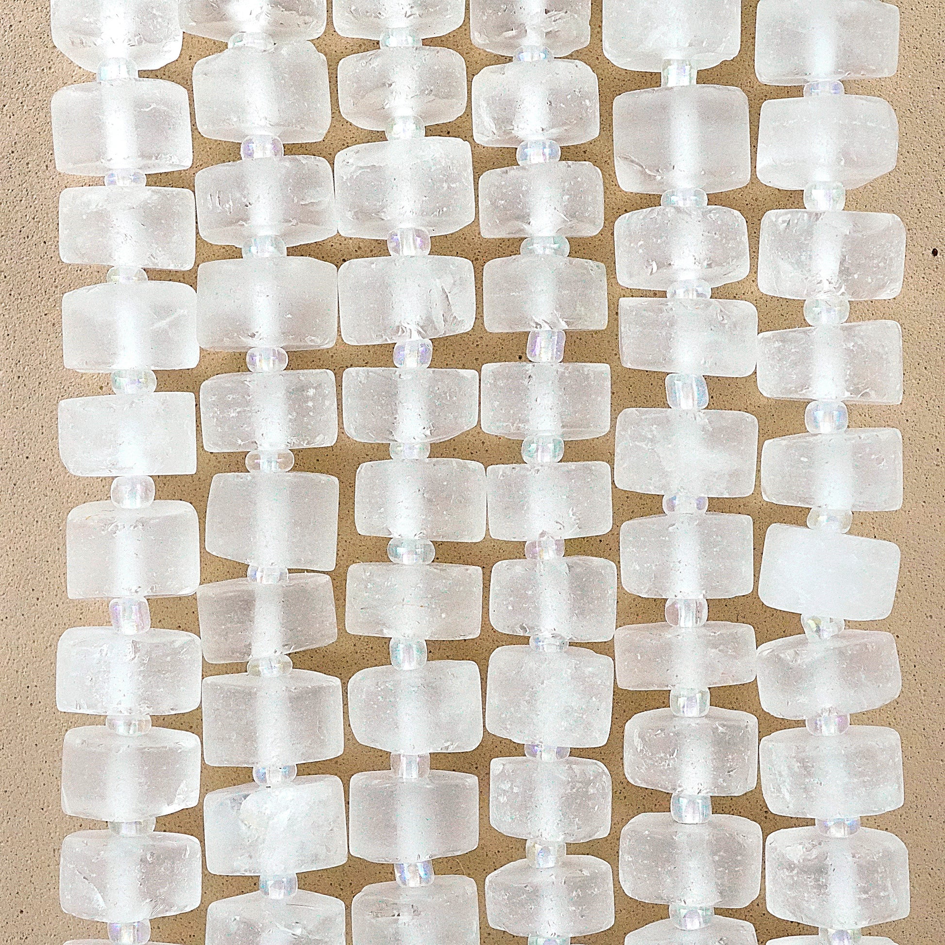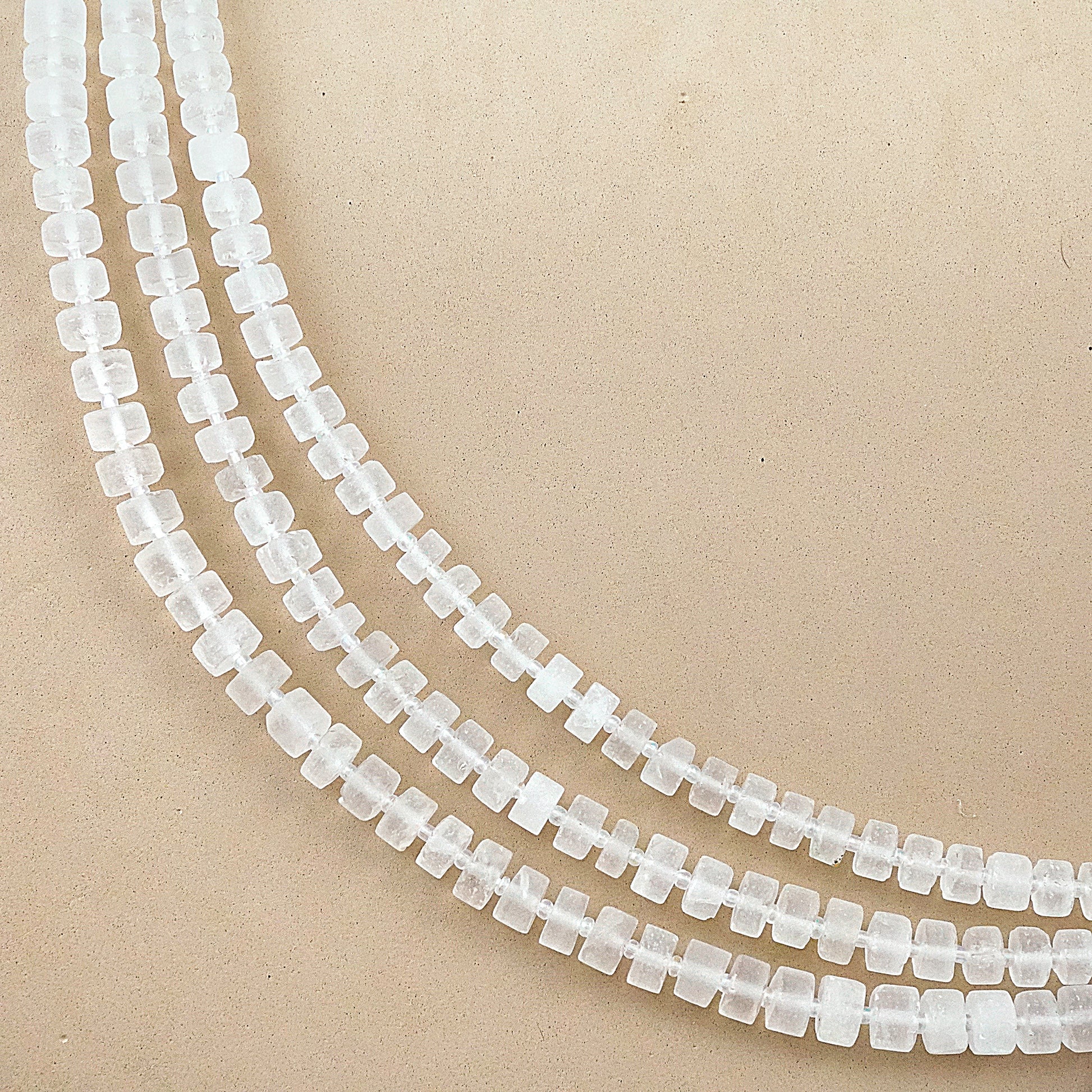 These Quartz beads are clear and matted. They are cut into a Heishe style bead which gives them a distinct natural look.