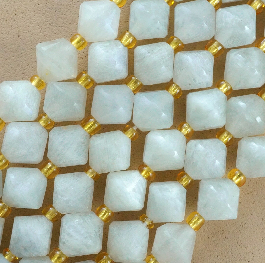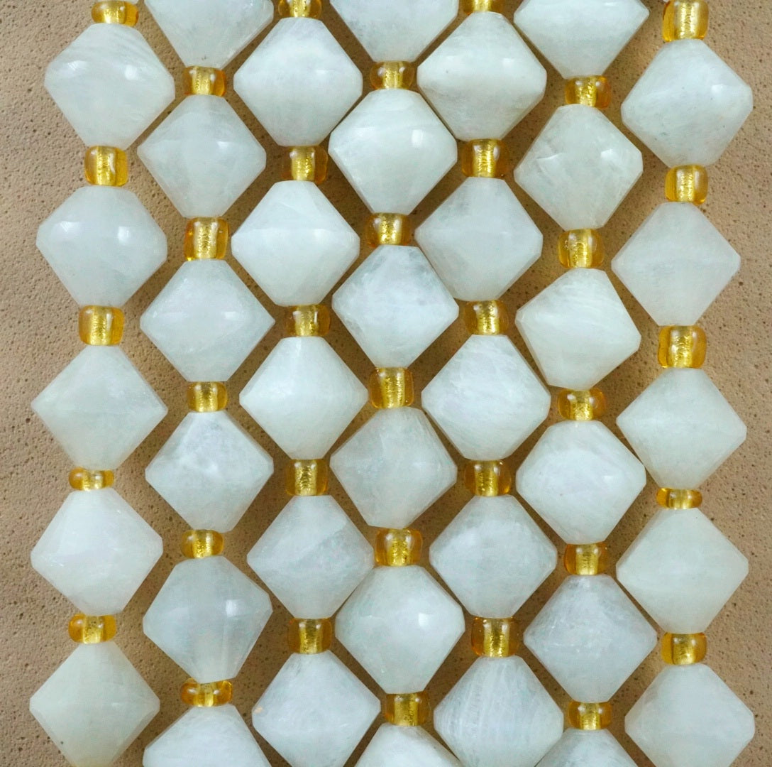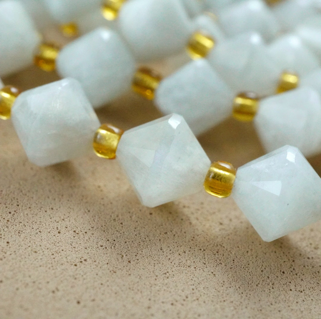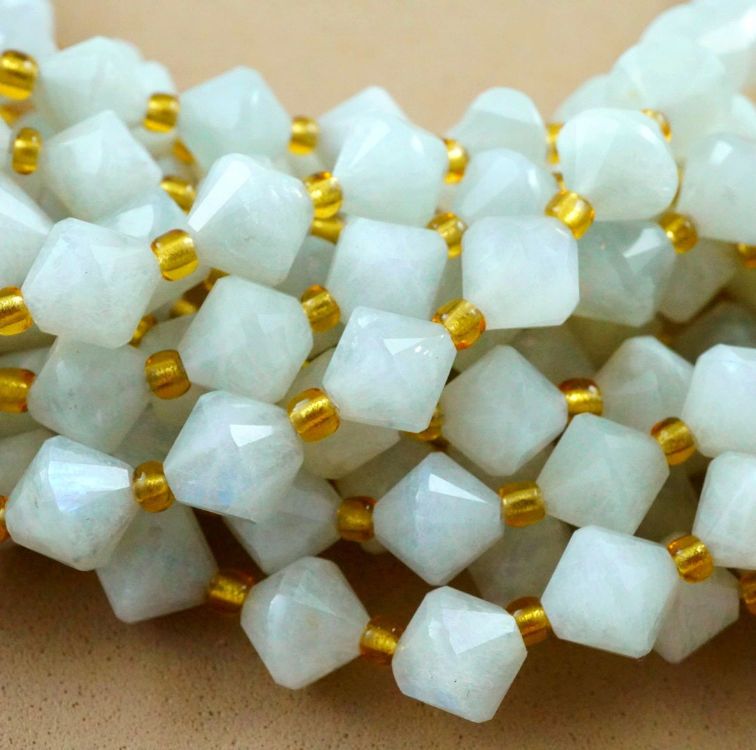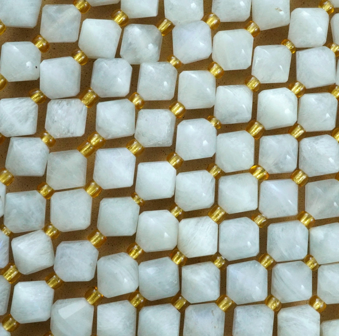 Rainbow Moonstone is a white variation of Feldspar that has a unique rainbow sheen that resembles the light of the Moon. These particular beads have been cut and polished into Faceted Bicone beads