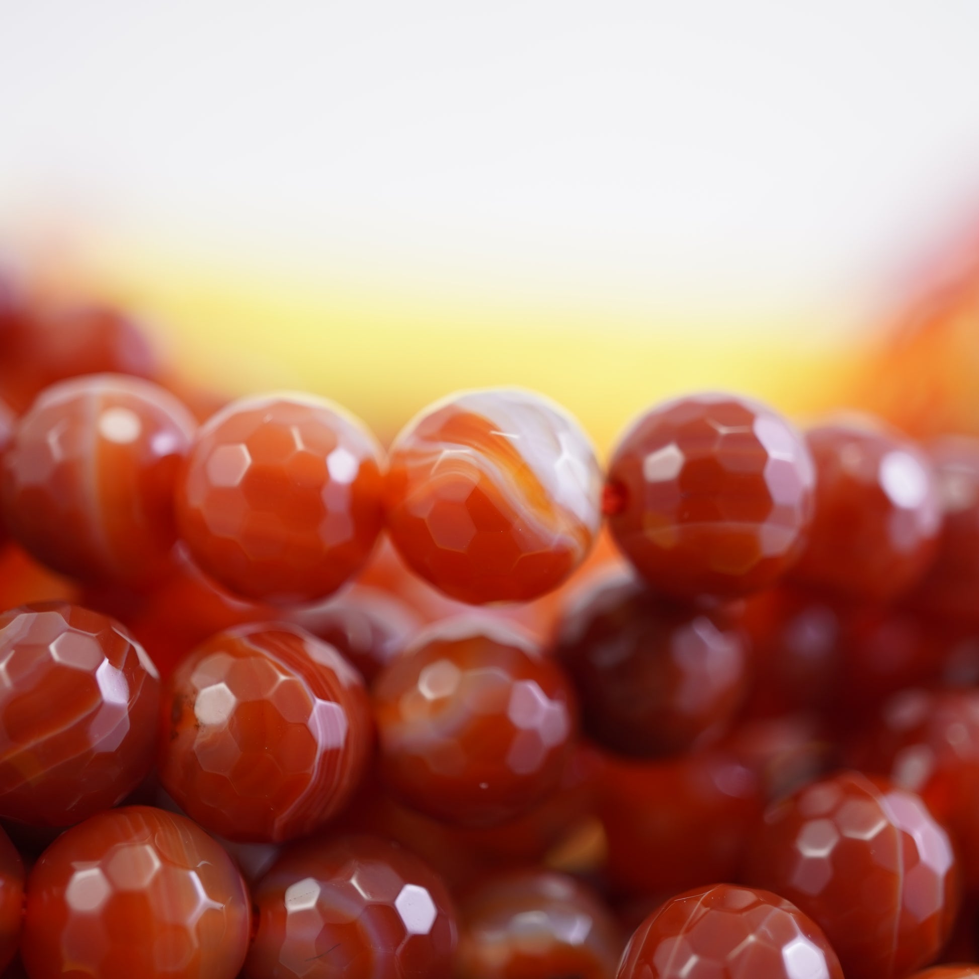 Red Sardonyx, also known as Red Banded Agate is a red chalcedony with white parallel bands. It is used in Jewelry since ancient times. These particular strands have been faceted to enhance their shine.