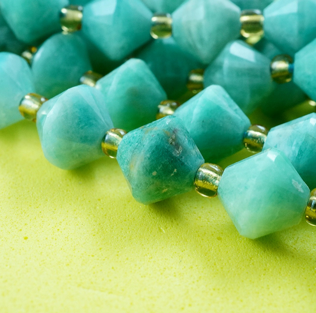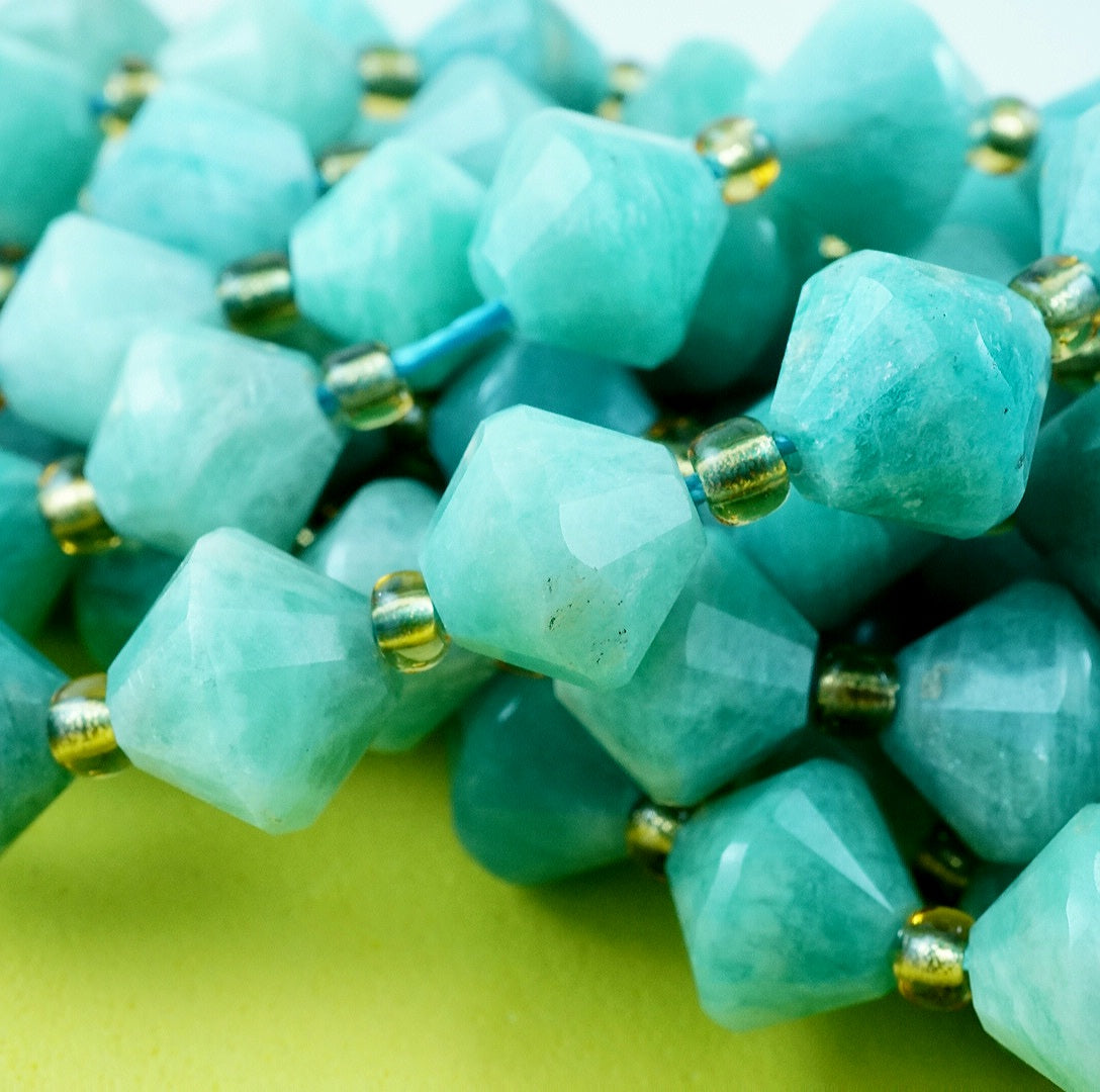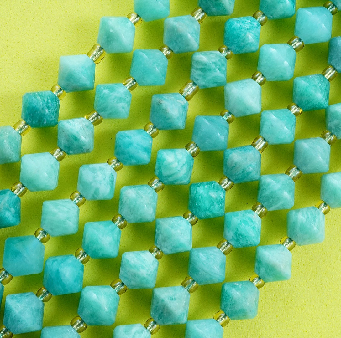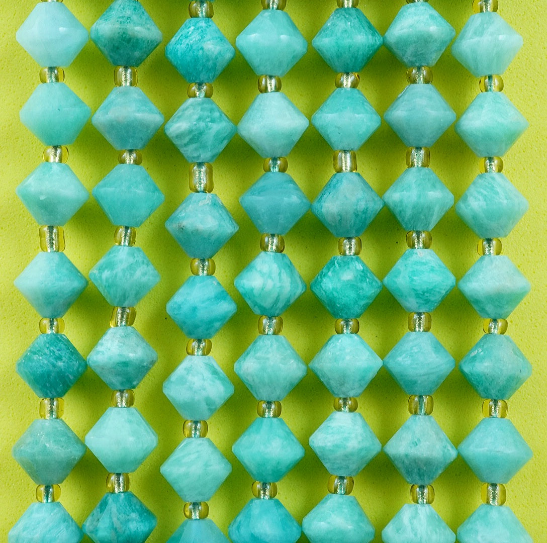 Russian Amazonite is a blue green variation of Feldspar that is considered as the finest quality Amazonite in the World. These particular beads have been cut and polished into Faceted Bicone beads
