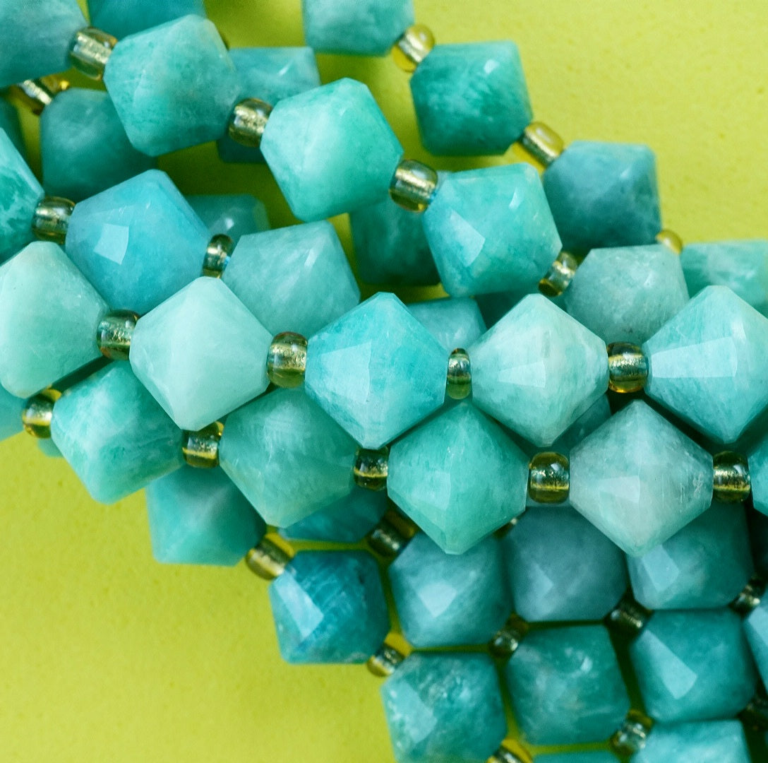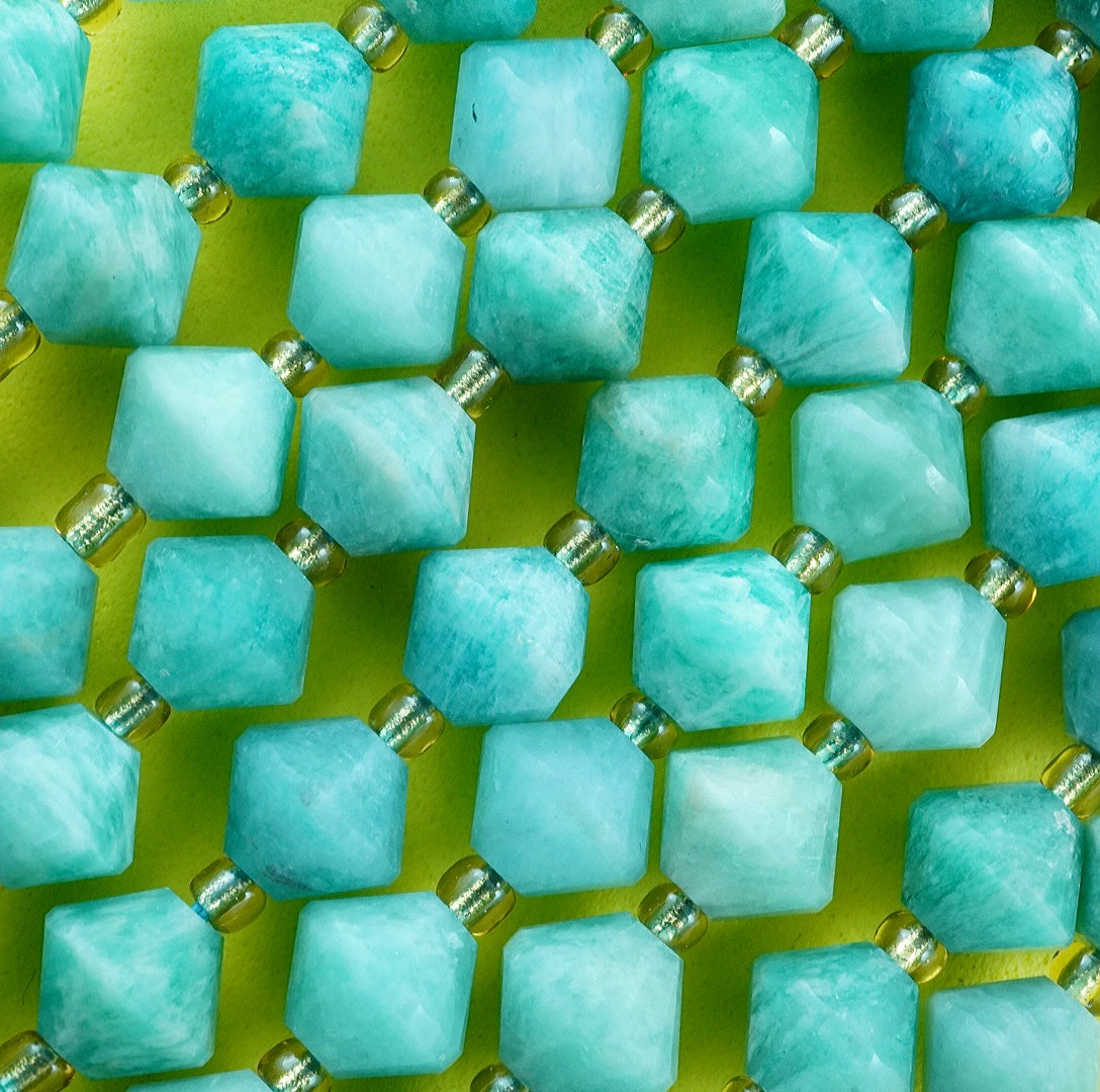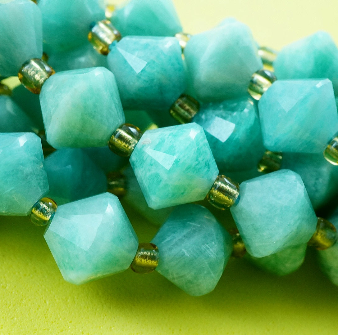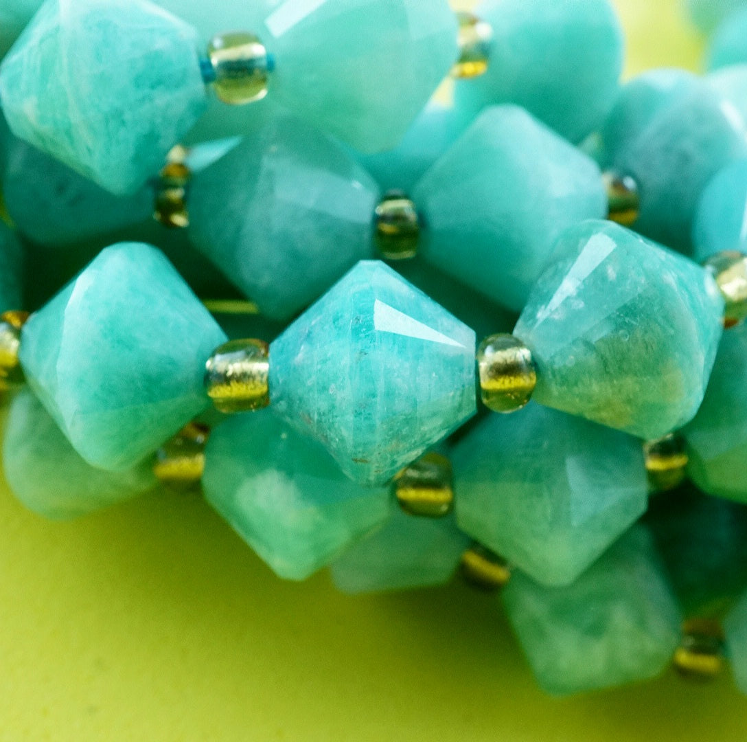 Russian Amazonite is a blue green variation of Feldspar that is considered as the finest quality Amazonite in the World. These particular beads have been cut and polished into Faceted Bicone beads