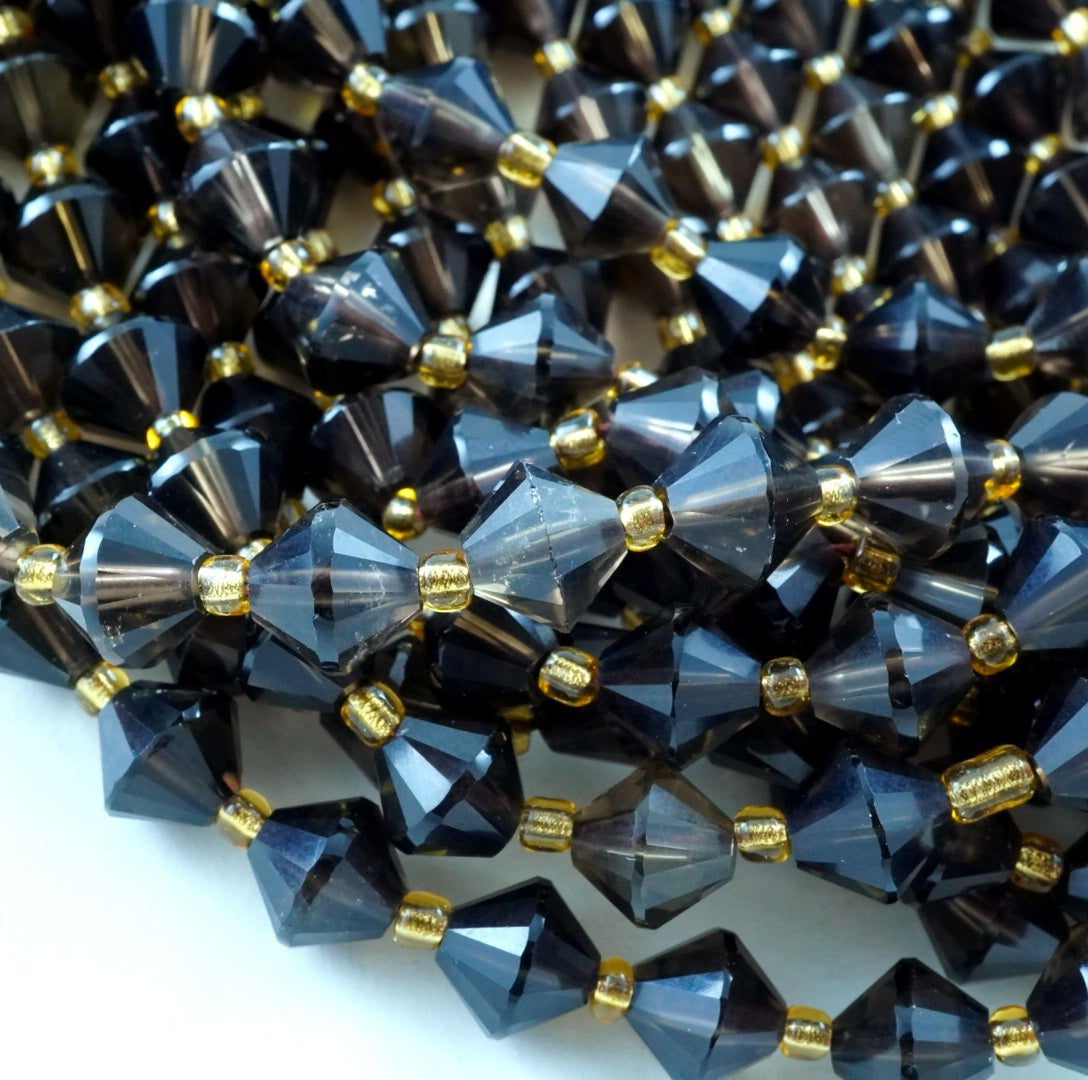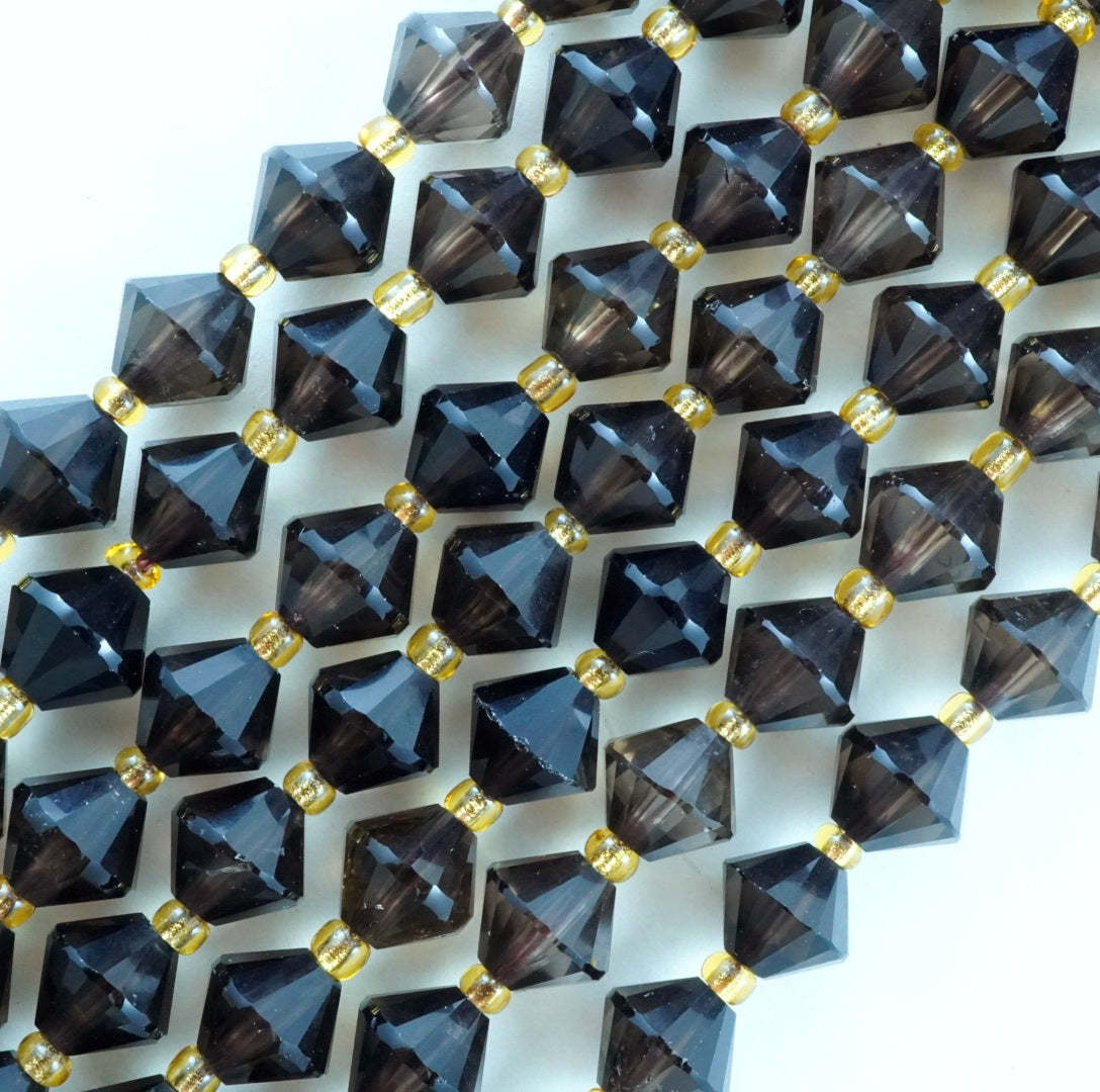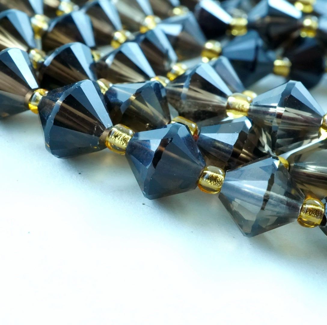 Smoky Quartz is a grey, translucent variation of Quartz. These particular beads have been cut and polished into Faceted Bicone Beads.