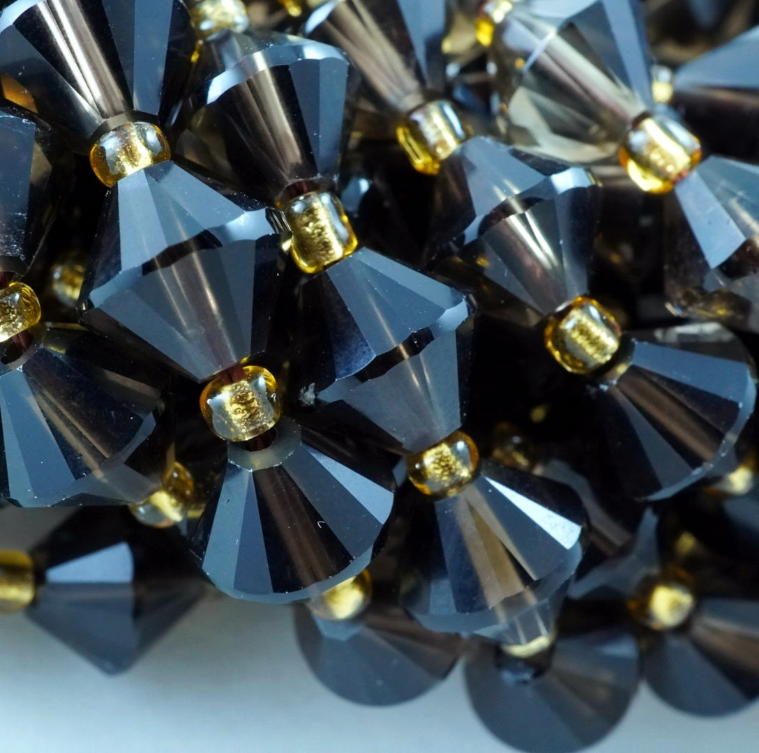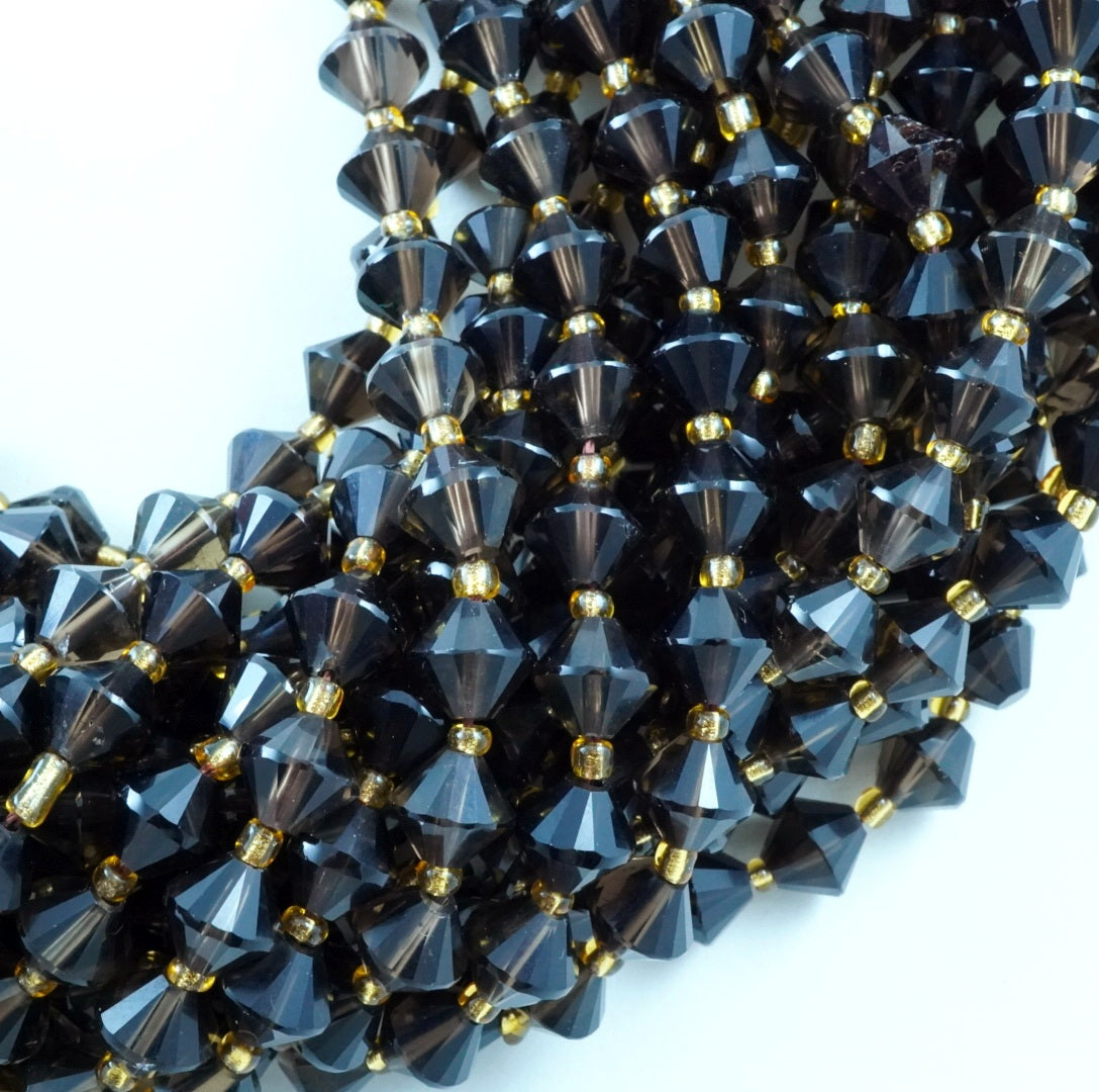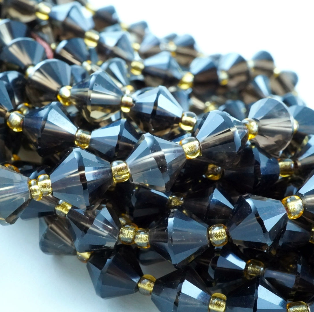 Smoky Quartz is a grey, translucent variation of Quartz. These particular beads have been cut and polished into Faceted Bicone Beads.