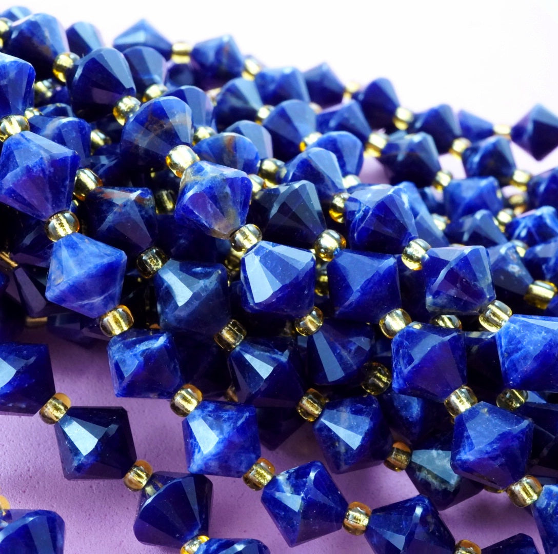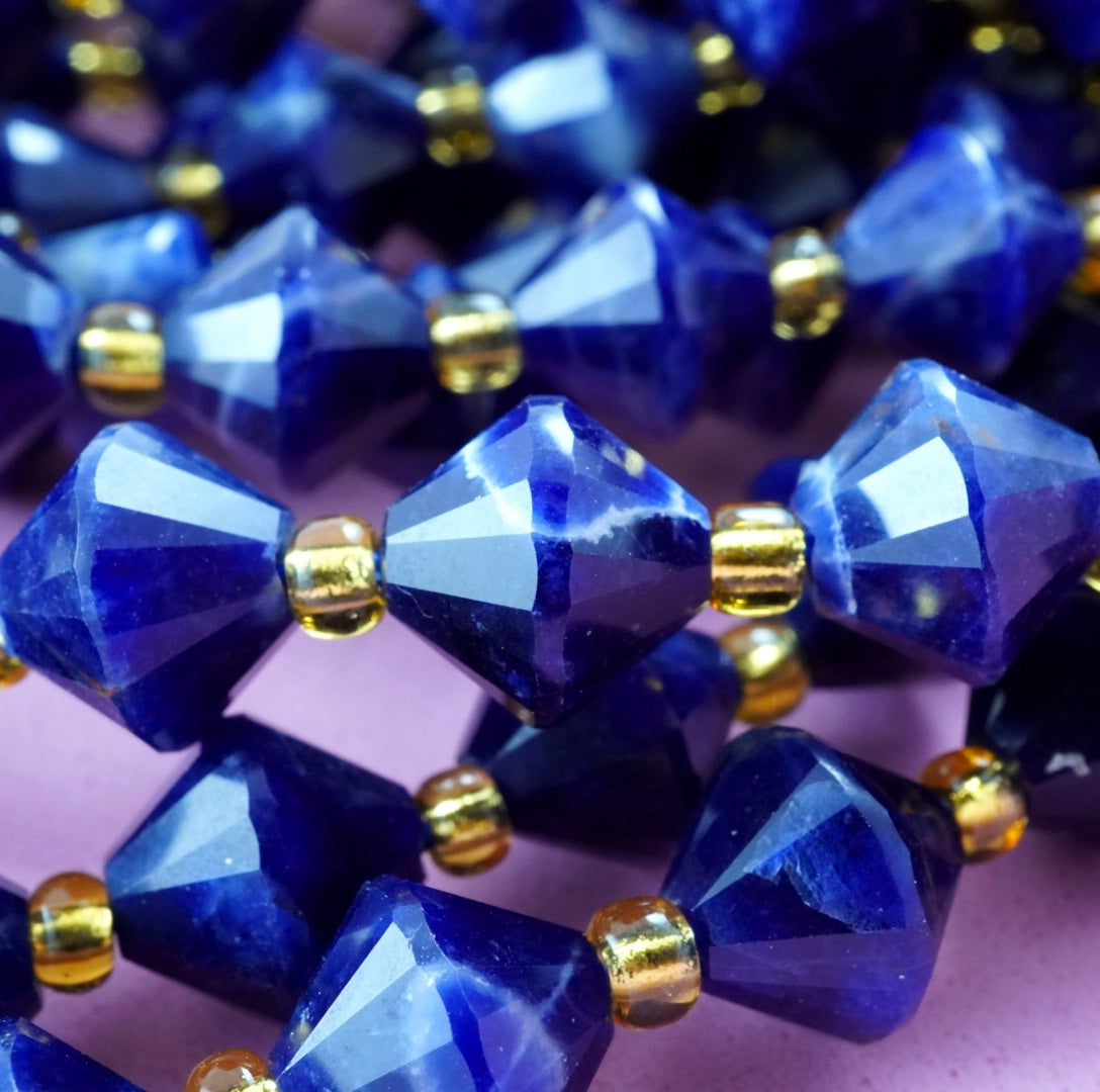 Sodalite is a semi precious stone, known for its Royal Blue color and its White veining. These particular beads have been cut and polished into Faceted Bicone Beads.